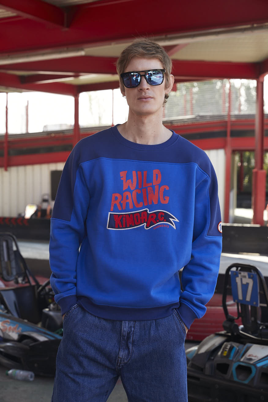 Sudadera Chain Work Wild Racing confeccionada con material reciclado en color azul claro con hombros en bloque azul oscuro. Estampado Wild Racing en rojo desgastado y logotipo de Kimoa bordado en una bandera en el pecho. Popelín redondo con el número 14 en la manga izquierda. Puños y bajo en contraste azul oscuro. Detalles del estampado interior del cuello en color blanco roto. Etiqueta de fieltro negra con logo de engomado en la cintura “Producto reciclado Kimoa” en color blanco roto.