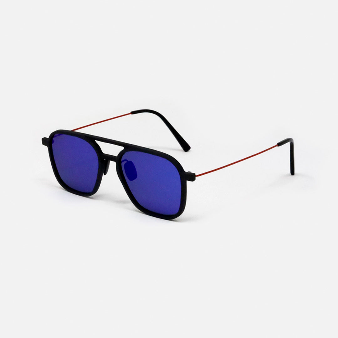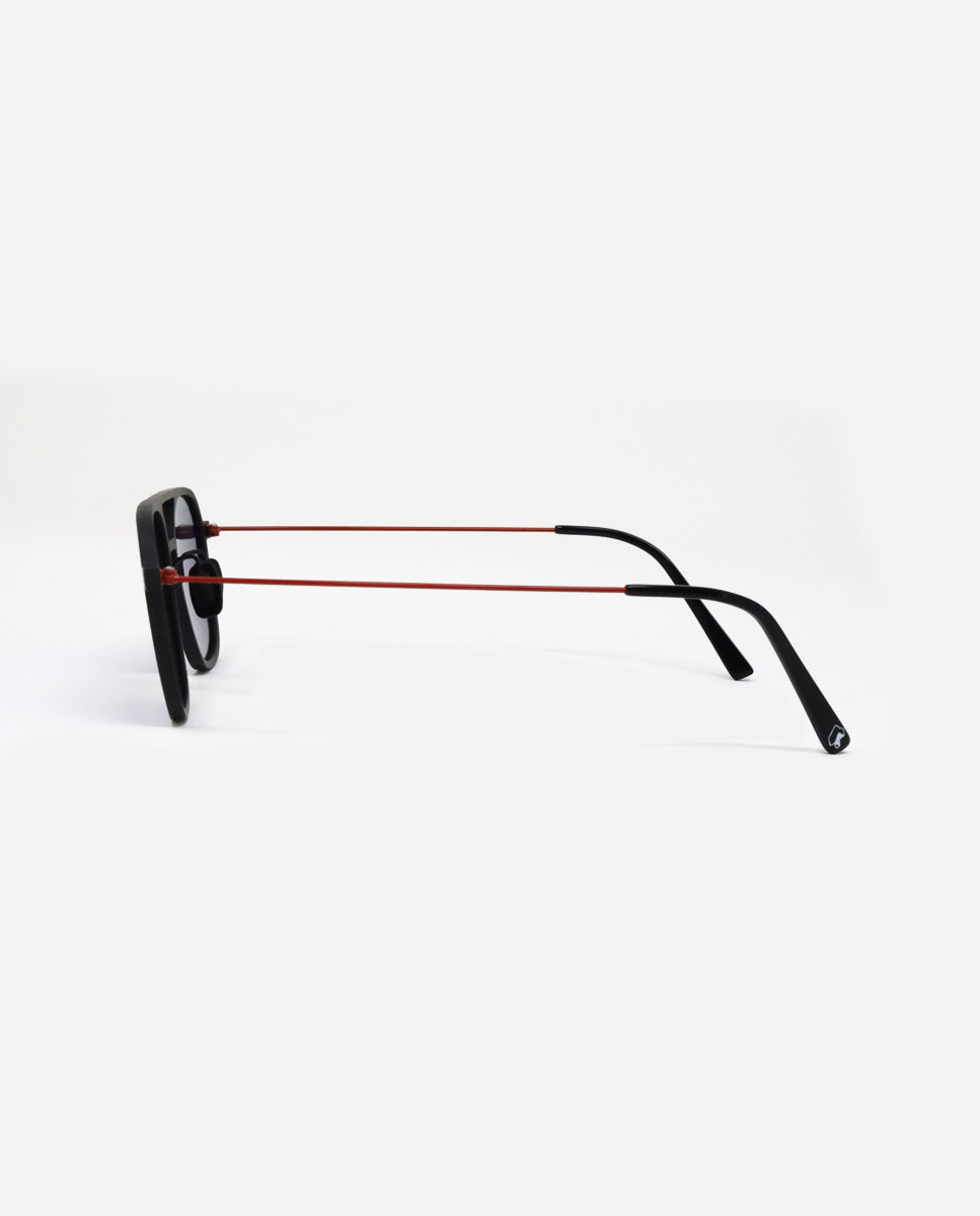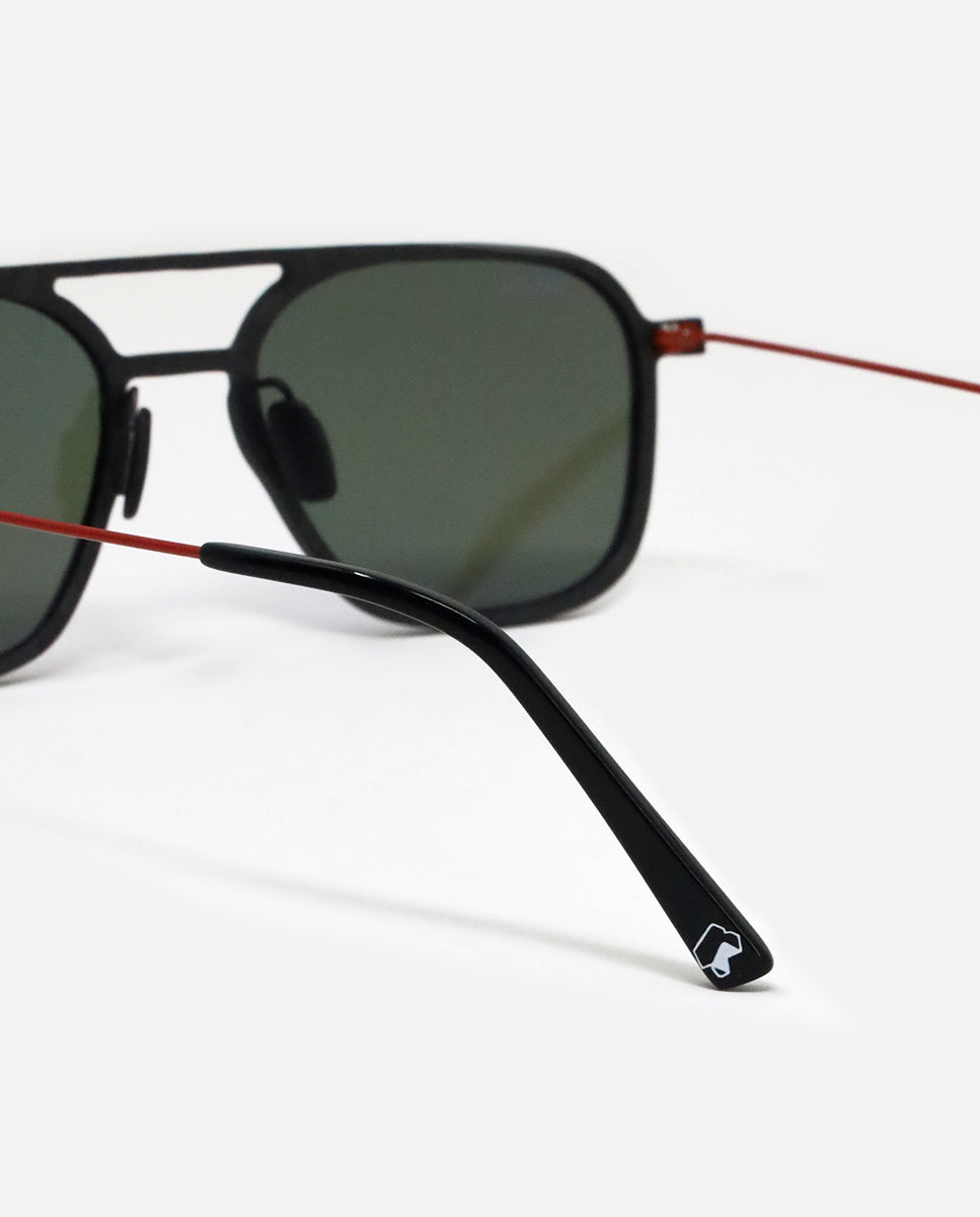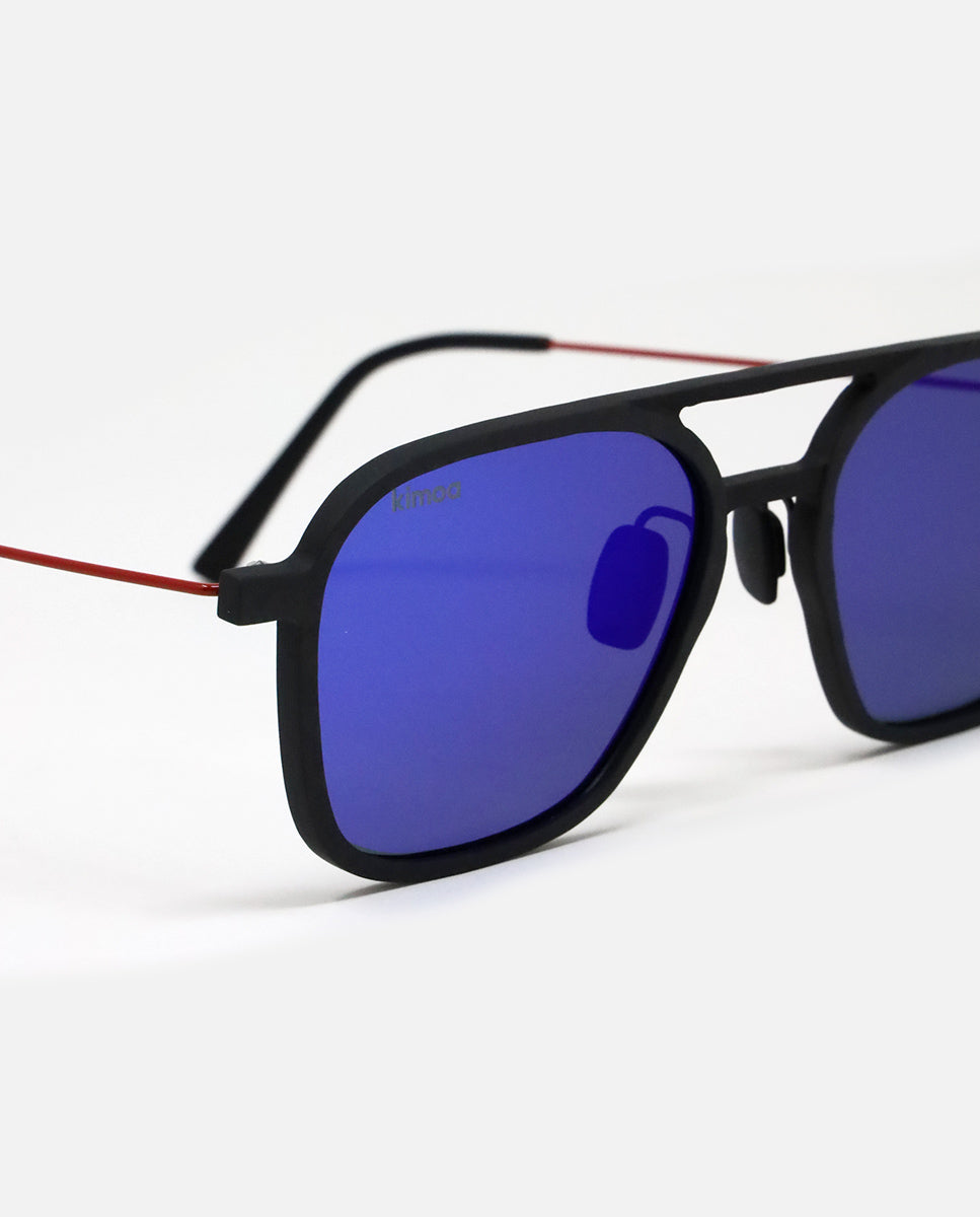 xGafas de sol Montecarlo cuadradas con montura de carbono y patillas de titanio rojas, logo Kimoa estampado en relieve en lentes y logo isotipo en terminales. Lentes polarizadas de color espejo azul. La fibra de carbono es un material formado por fibras de 5-10 micras de diámetro, compuesto principalmente de átomos de carbono. Los átomos de carbono están unidos entre sí en cristales que son más o menos alineados en paralelo al eje longitudinal de la fibra. La alineación de cristal da a la fibra de alta resistencia en función del volumen. Varias millas de fibras de carbono están trenzadas para formar un hilo, que puede ser utilizado por sí mismo o tejido en una tela. Su alta flexibilidad, resistencia, su bajo peso, la tolerancia a altas temperaturas y la baja expansión térmica hacen de la fibra de carbono el material perfecto para hacer deporte. 10 veces más resistente a los golpes y a los cambios bruscos de temperatura.