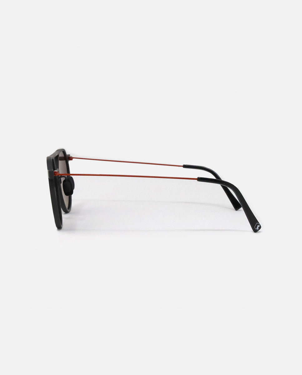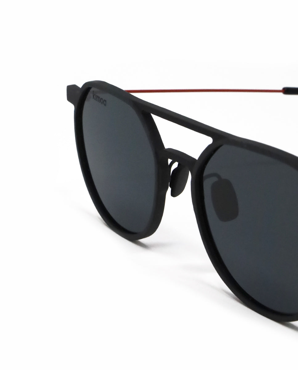 xGafas de sol Suzuka redondas con montura de carbono y patillas de titanio rojas, logo kimoa estampado en relieve en las lentes e isotipo Kimoa en los terminales. Lentes color negro polarizadas. La fibra de carbono es un material formado por fibras de 5-10 micras de diámetro, compuesto principalmente de átomos de carbono. Los átomos de carbono están unidos entre sí en cristales que son más o menos alineados en paralelo al eje longitudinal de la fibra. La alineación de cristal da a la fibra de alta resistencia en función del volumen. Varias millas de fibras de carbono están trenzadas para formar un hilo, que puede ser utilizado por sí mismo o tejido en una tela. Su alta flexibilidad, resistencia, su bajo peso, la tolerancia a altas temperaturas y la baja expansión térmica hacen de la fibra de carbono el material perfecto para hacer deporte. 10 veces más resistente a los golpes y a los cambios bruscos de temperatura.