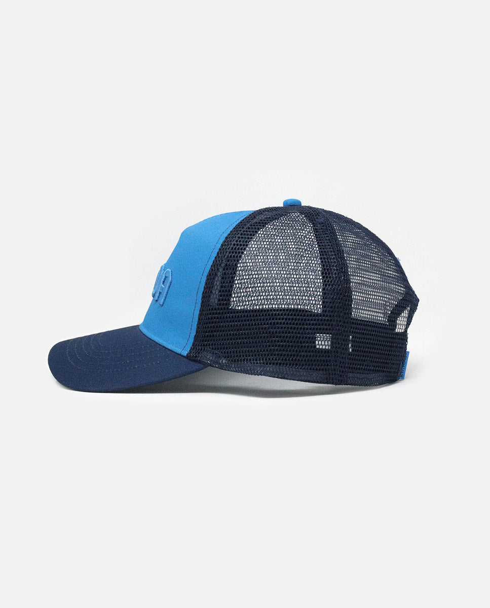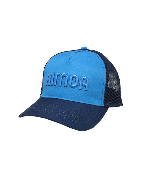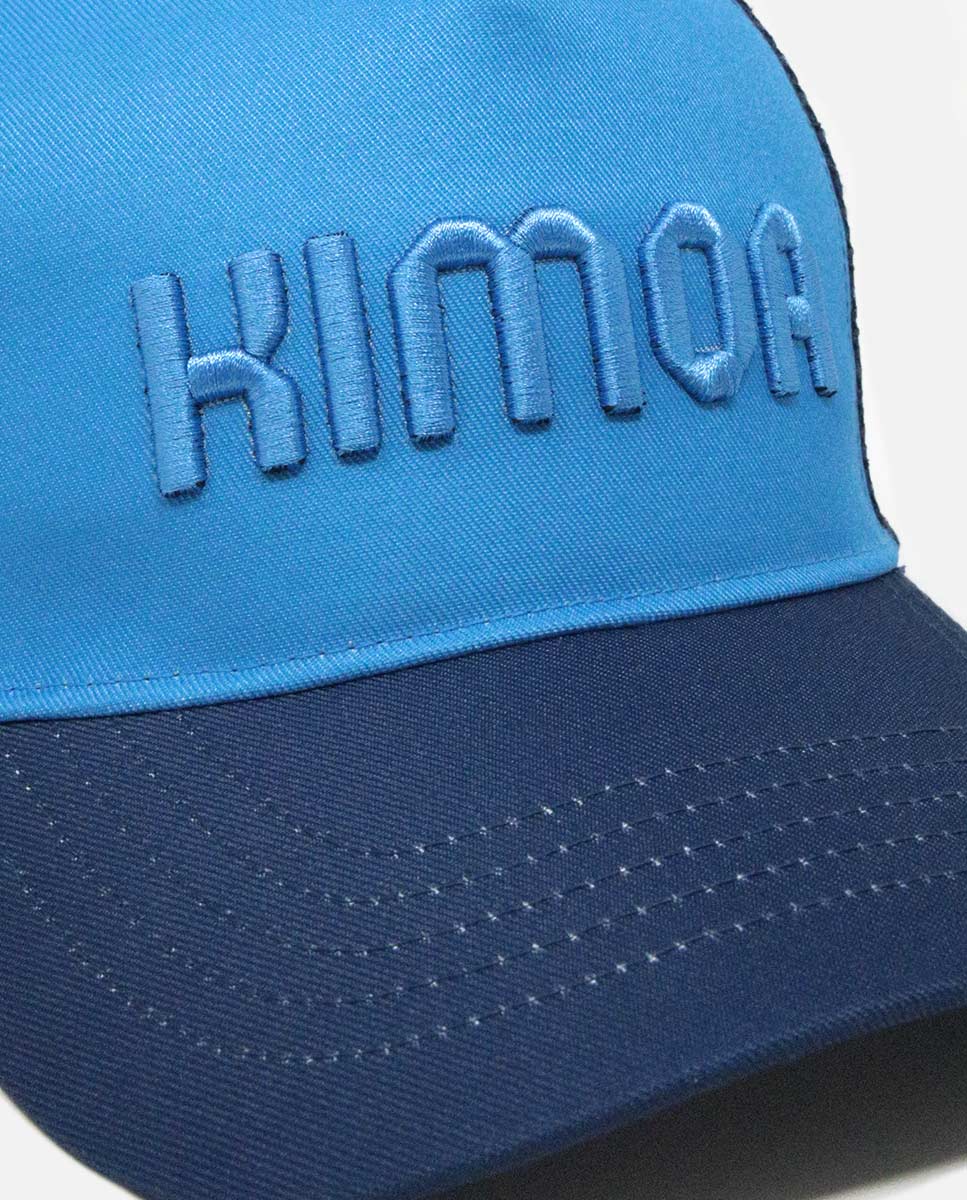 xGorra de camionero de origami. Frontal con logo Kimoa con efecto 3D tono sobre tono azul. Gorra bicolor celeste y azul marino con pala trucker curva y malla. Visera azul marino. Cierre ajustable y etiqueta Kimoa azul. Tejido: 80% RPet-15%. Algodón-5% Otras fibras.