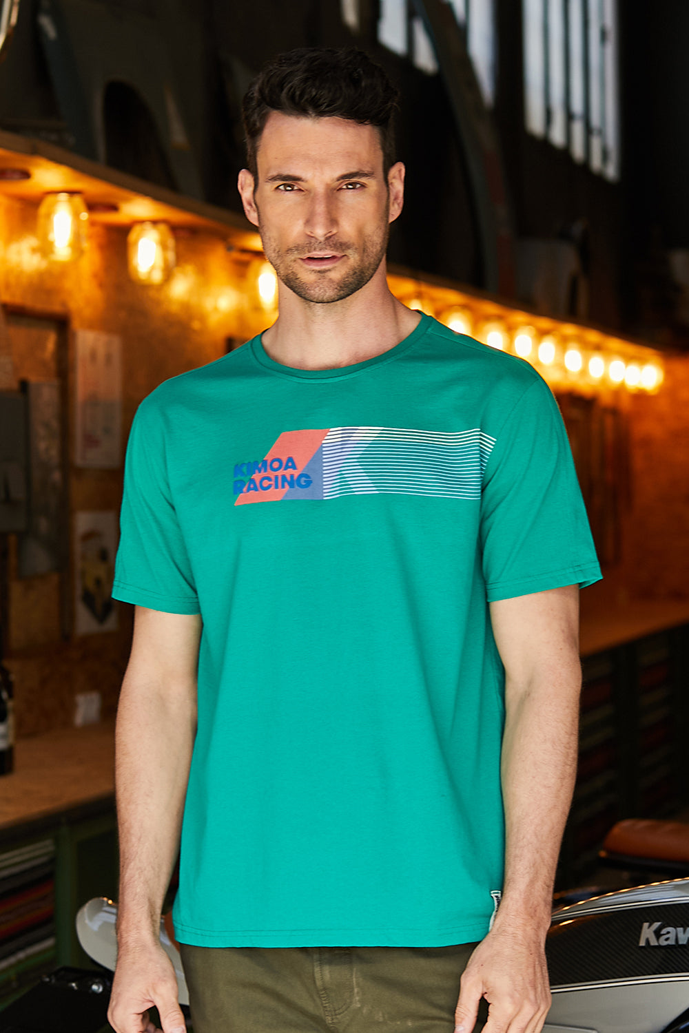 Green Tofu Striped K Racing T-shirt with green, light blue, blue and red Kimoa Racing Motorsport Heritage graphic on the chest with silicone hand feel. Neck seam cover tape in blue tone in tone with the logo. Felt label with rubber logo on the waist “Kimoa recycled product”.
