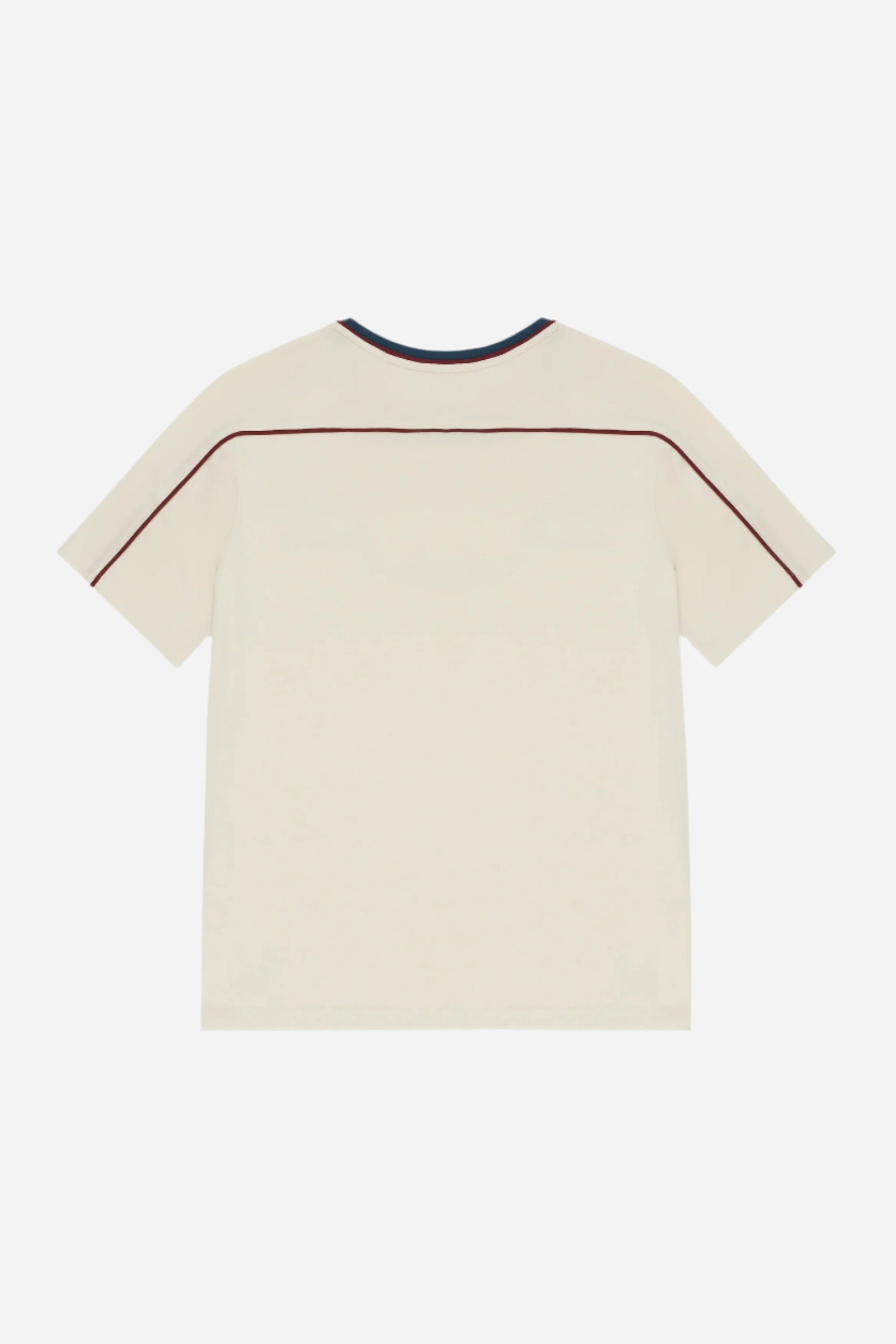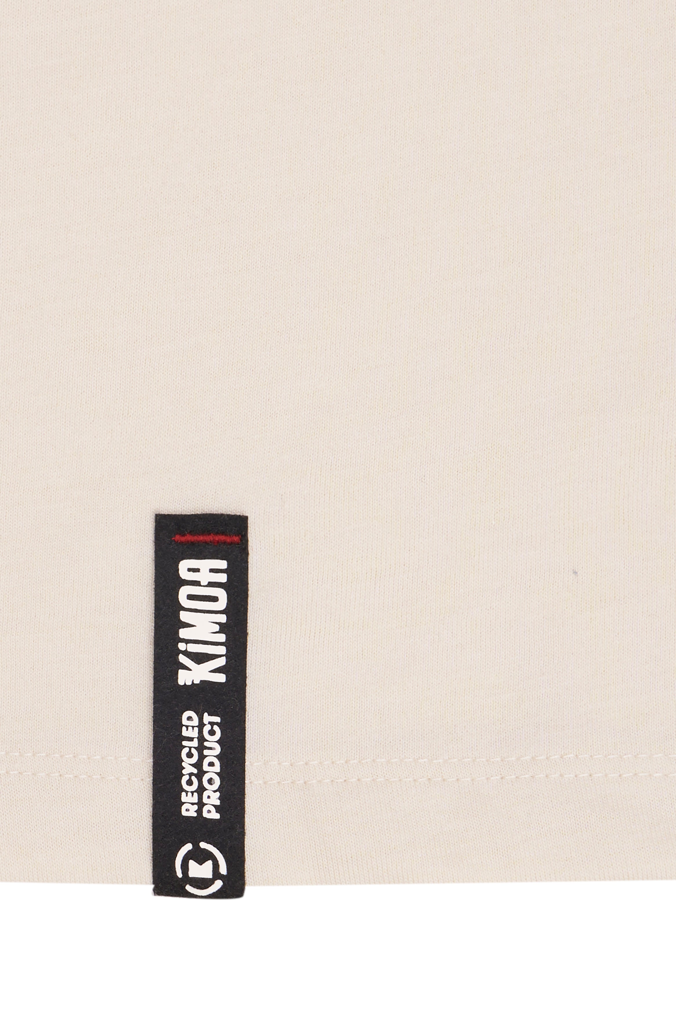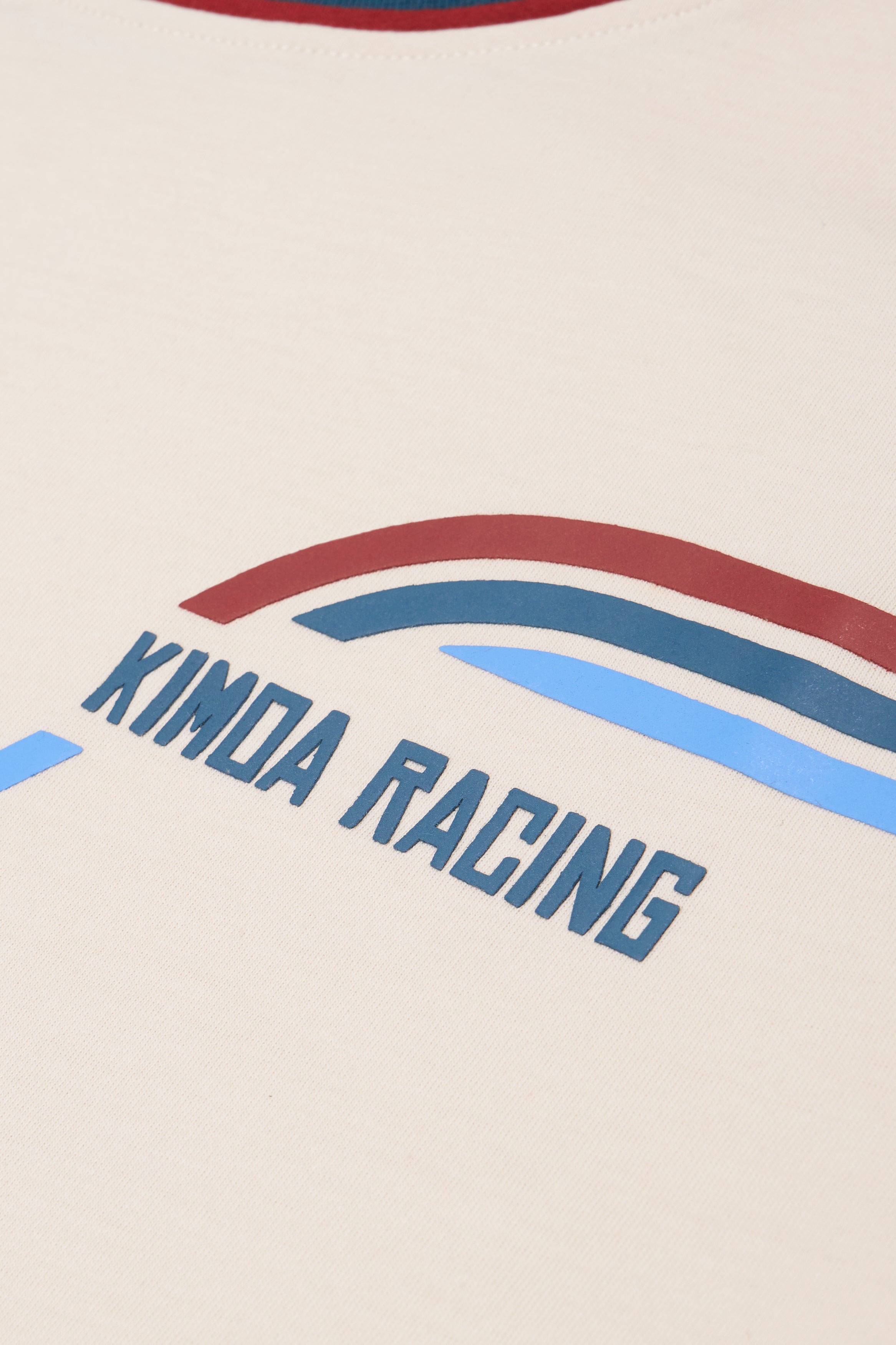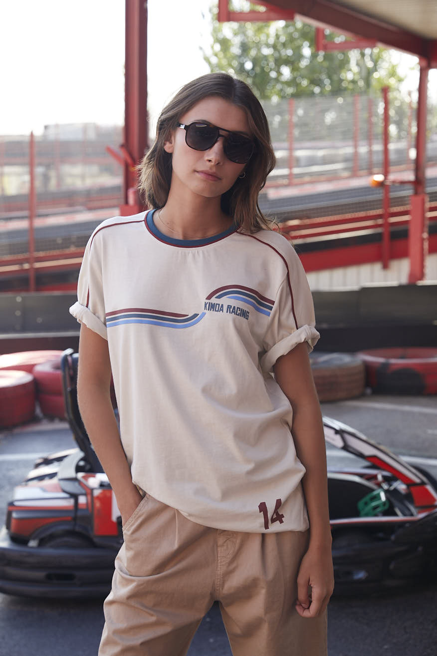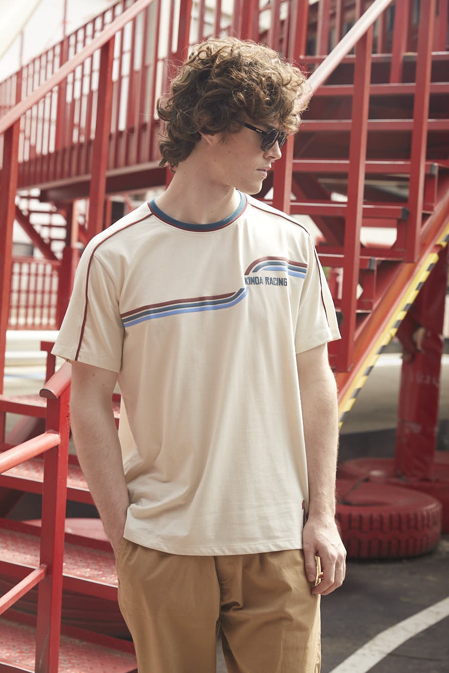 xCamiseta Retro Curved Multi Racing gris claro en material reciclado. Estampado en el pecho con rayas que van desde caoba oscura y naranja hasta amarillo mostaza. Ribetes de punto con sándwich de jersey en color caoba, en los hombros y en la parte delantera, de manga a manga. Kimoa Racing estampado insertado en la banda de color a la izquierda del pecho. Número 14 en color caoba en la cintura. Detalles del estampado interior del cuello en color negro y cinta de algodón en color negro. Etiqueta de fieltro negra con logo engomado en la cintura “Kimoa reciclaje producto” en color blanco roto.