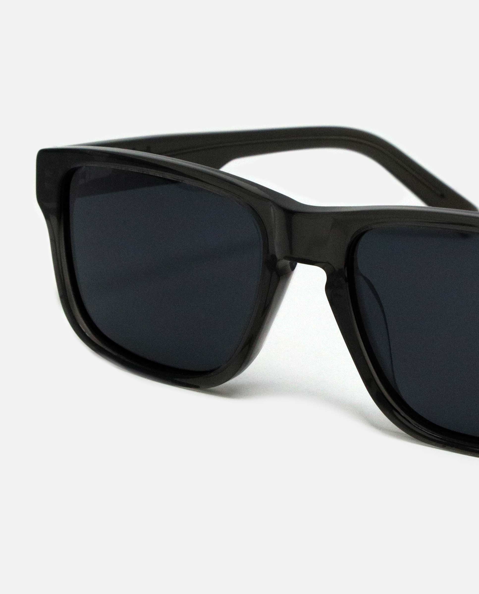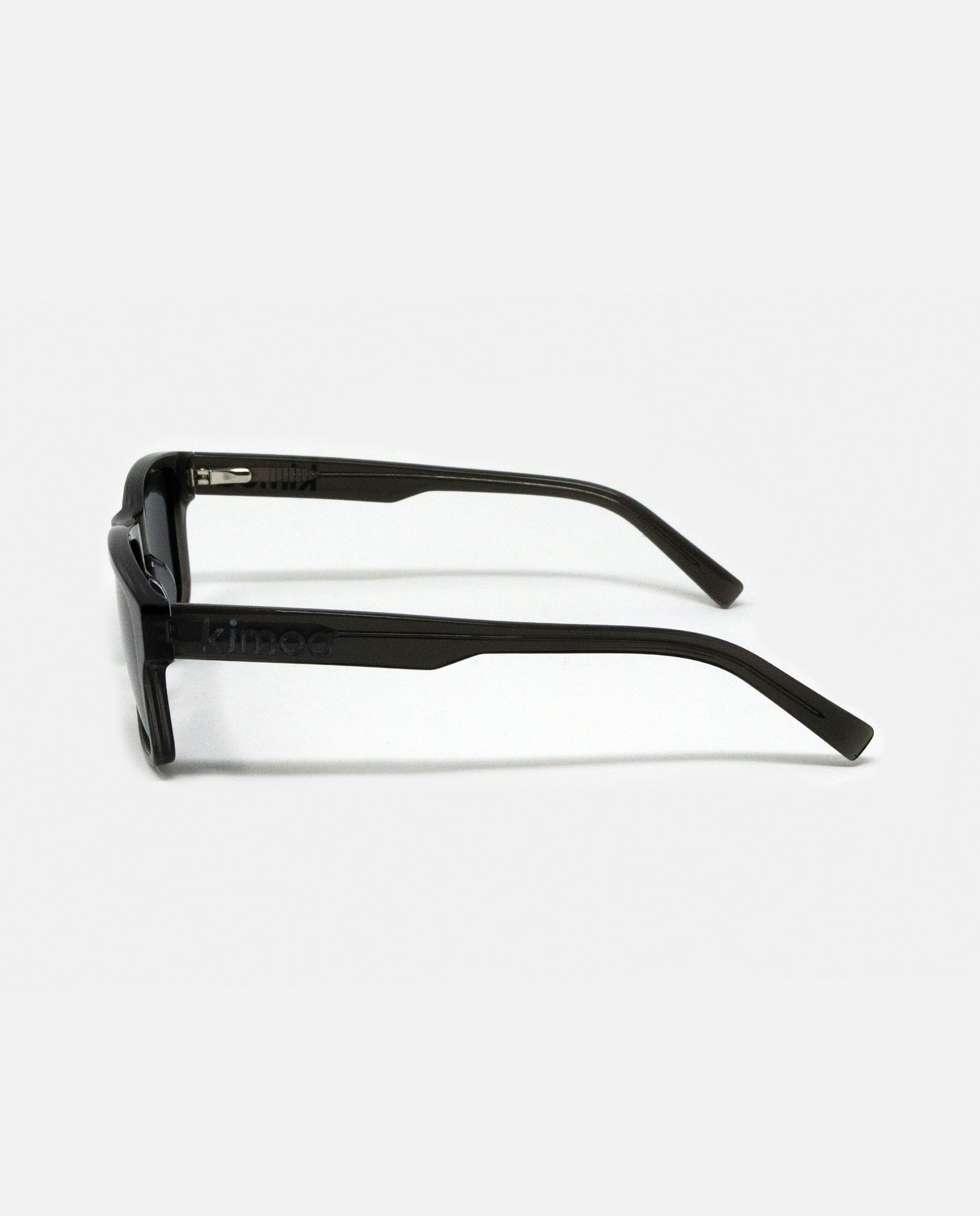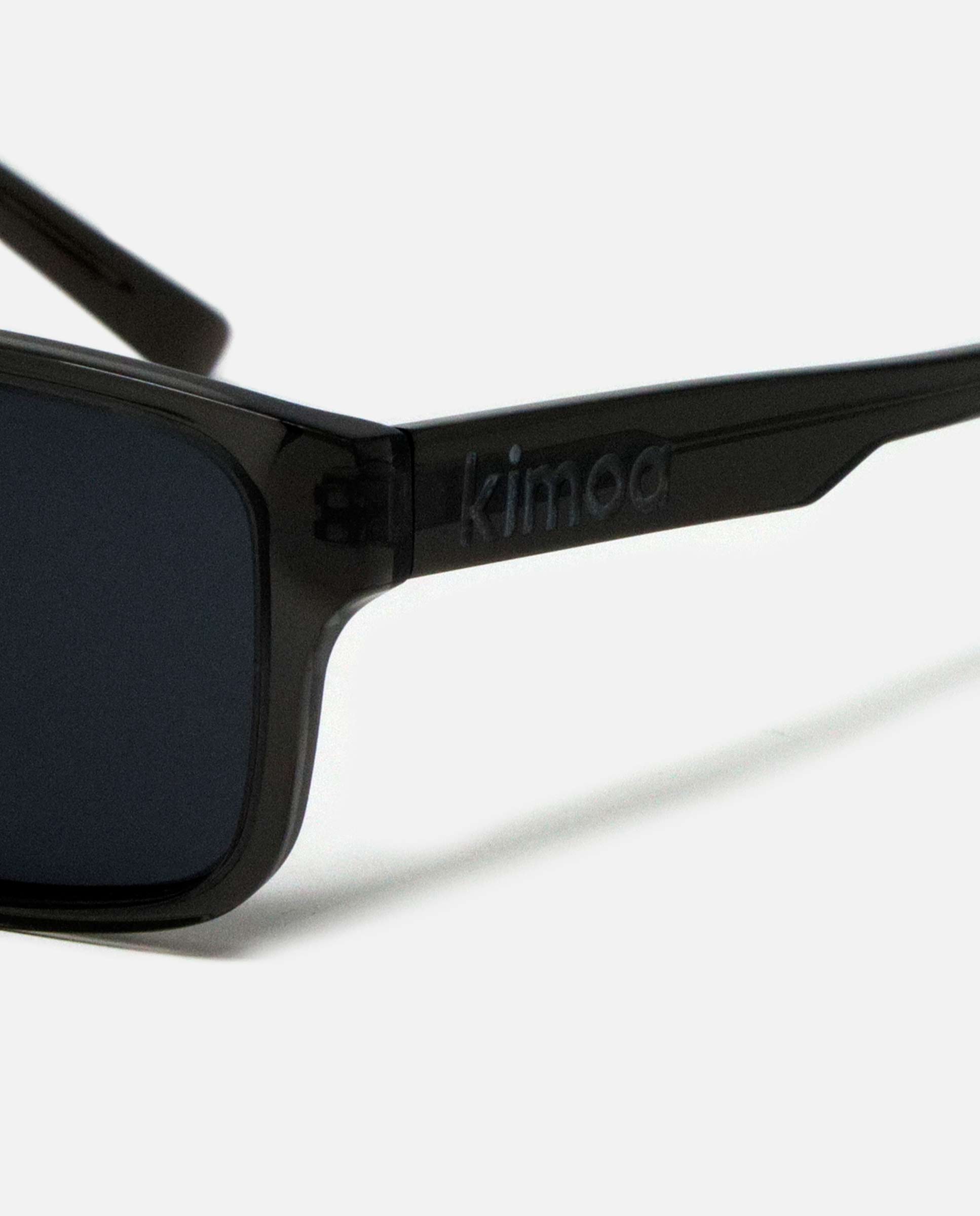 xGafas de sol Icónicas Sidney Black is Black con montura de Bio-acetato cuadradas de color negro transparente brillante y logo kimoa en ligero bajo relieve en las patillas de color negro. Frase en una de las patillas "LLEVA UNA HISTORIA / LLEVA TUS VALORES". Lentes polarizadas de tonalidad negra. El bio-acetato es un material ecológico, entre sus características, ya que para su fabricación se añaden únicamente aditivos orgánicos al algodón, que lo transforman en un nuevo material eco-sostenible y biodegradable.