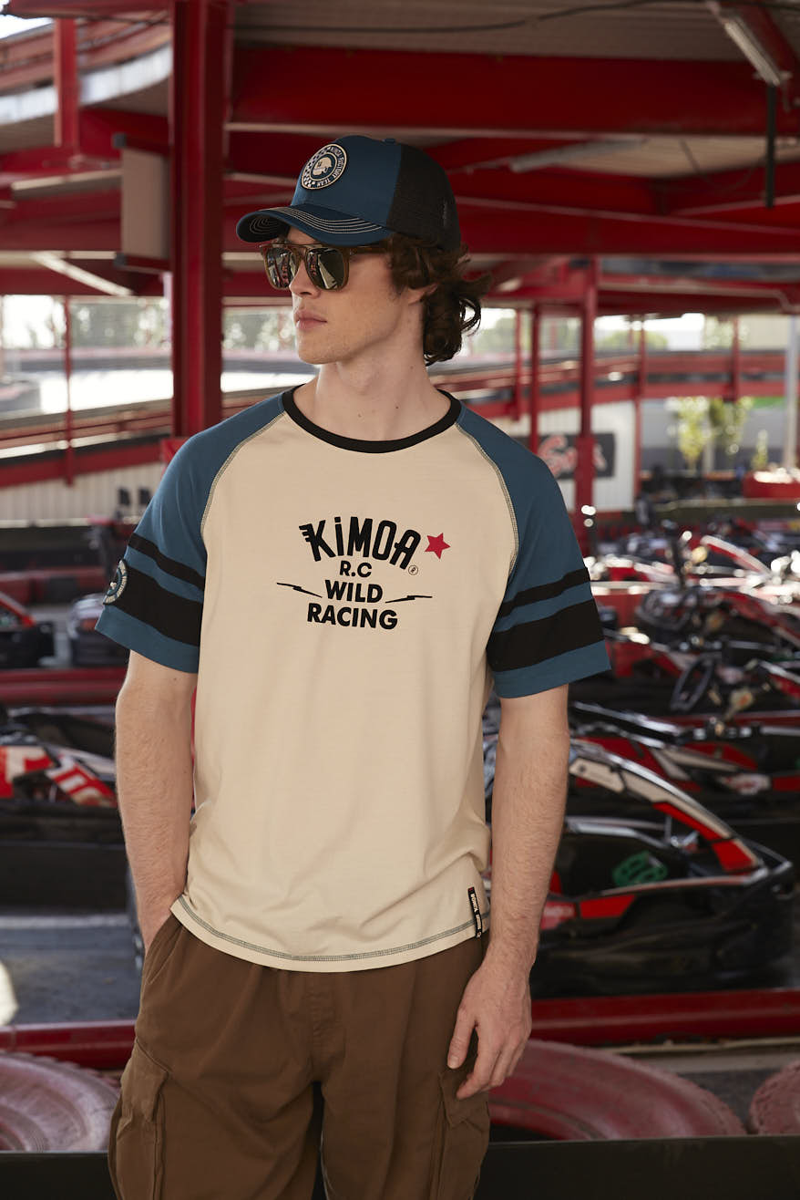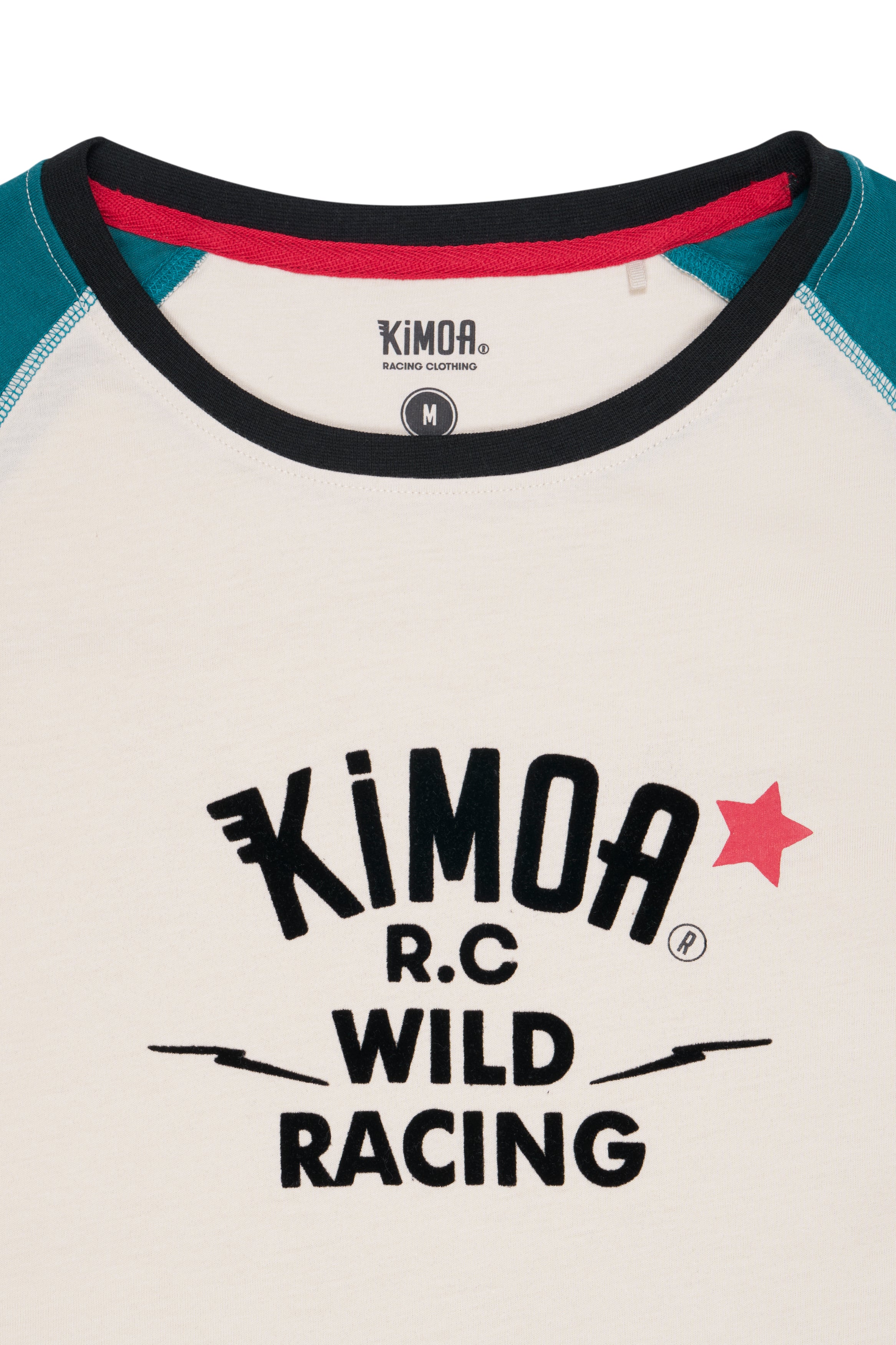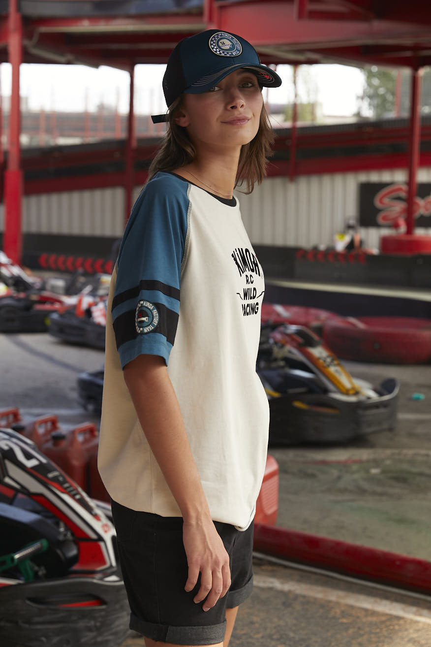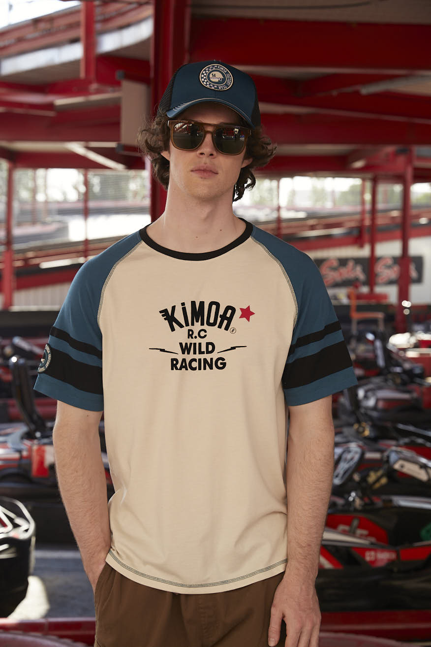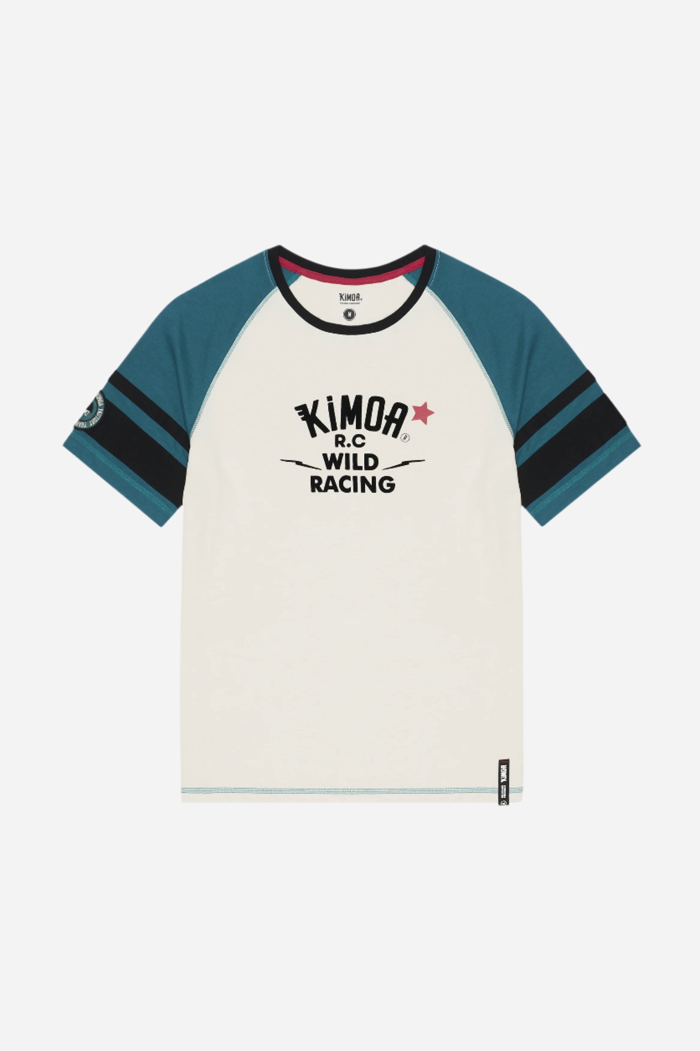 xCamiseta Thunder Racing color blanco roto en material reciclado. Mangas de color azul océano intenso con rayas tejidas en negro. Estampado aterciopelado en el pecho Kimoa Wild Racing en color negro. Detalles del estampado interior del cuello en cinta de algodón negra en contraste color rojo cereza. Etiqueta de fieltro negra con logo engomado en la cintura con la frase “Kimoa reciclaje producto” en color blanco roto.