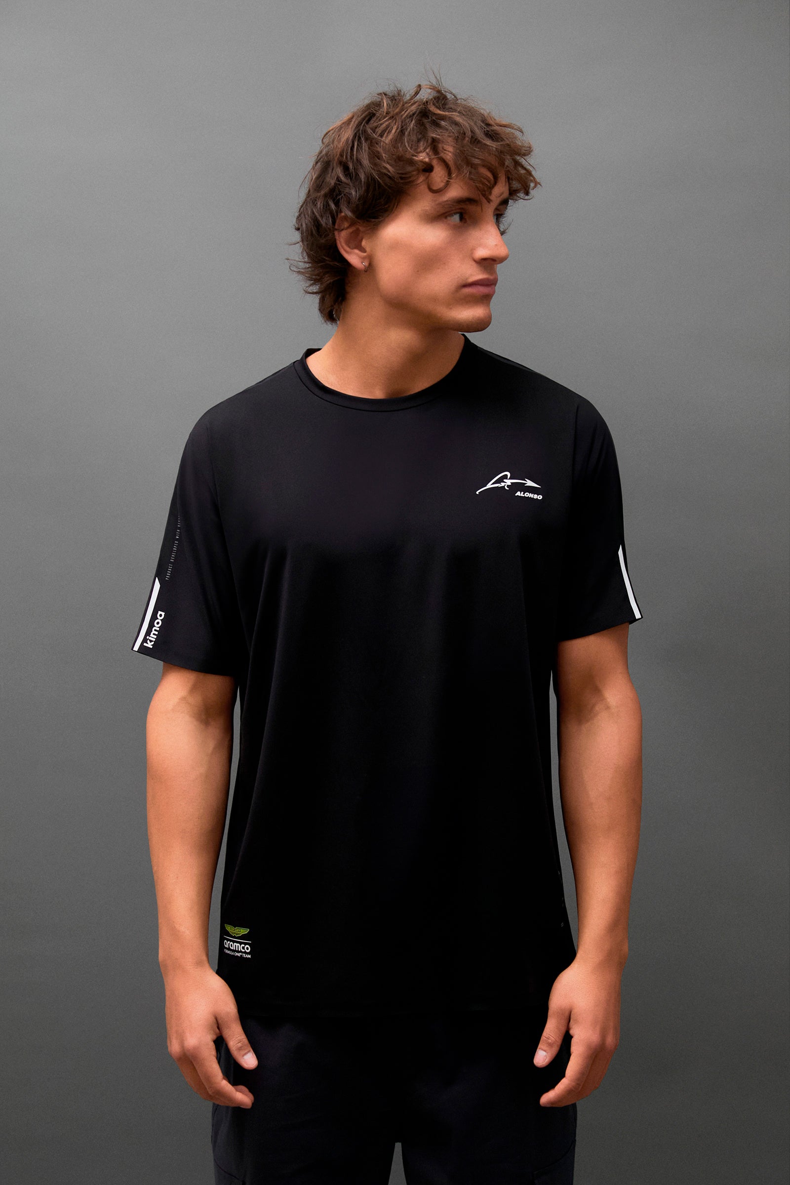Aston Martin F1 team x Kimoa short sleeve black sports T-shirt made with recycled sustainable fabrics.