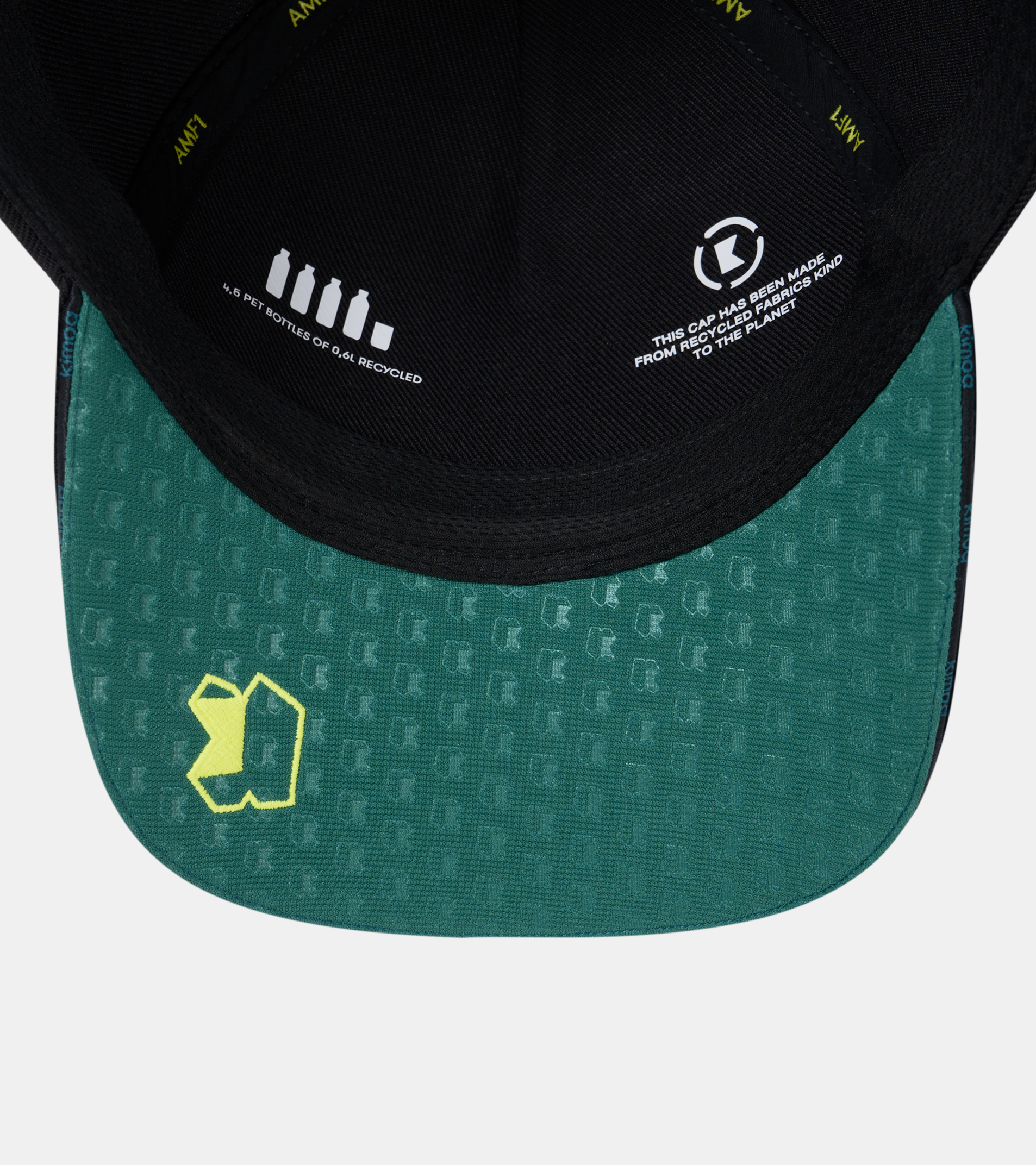 Aston Martin F1 team x Kimoa five panels adjustable curved peak cap in black colour twill made with recycled fabrics and contrast lime colour details.