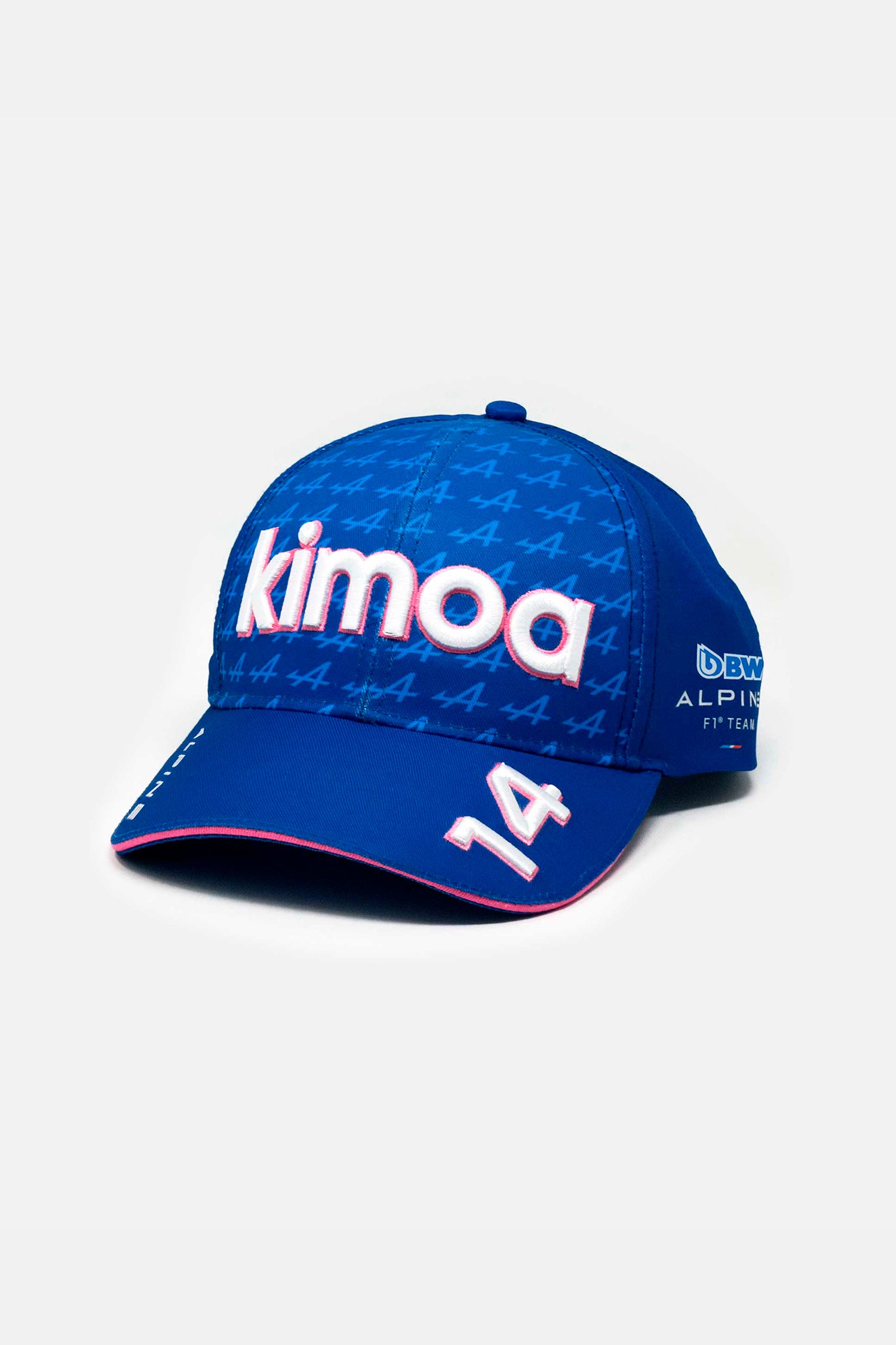 Recycled navy-blue trucker cap Special Edition Fernando Alonso Alpine 2022. Front with 3D embroidered Kimoa logo in white with pink seam outline. All over print with Alpine logo on the front panels, light blue to dark blue gradient. Official Alpine logo embroidered in white on the visor and 3D embroidered number 14 with pink outline. Alpine F1 Team on the left panel with embroidered stitching detail in blue, white and red as the colors of the French flag. Visor with pink profile. Signature of Fernando Alonso embroidered in white on the back. Adjustable velcro fabric closure and pink Kimoa label. Recycled PET.