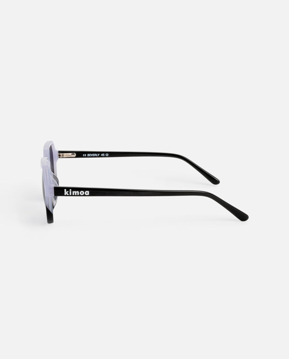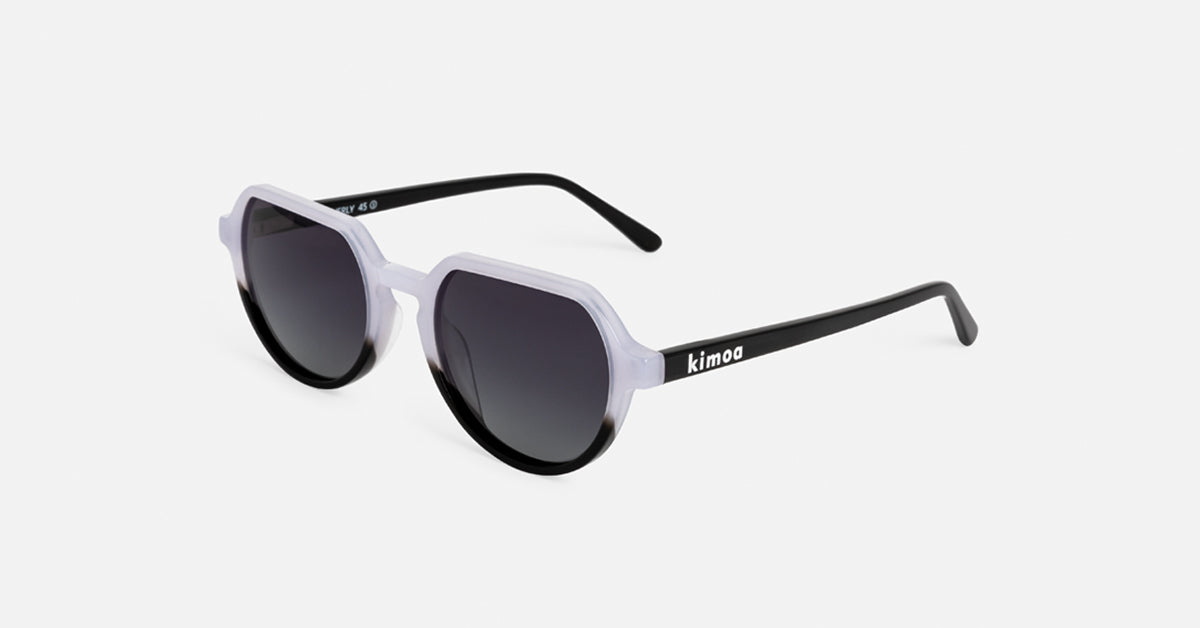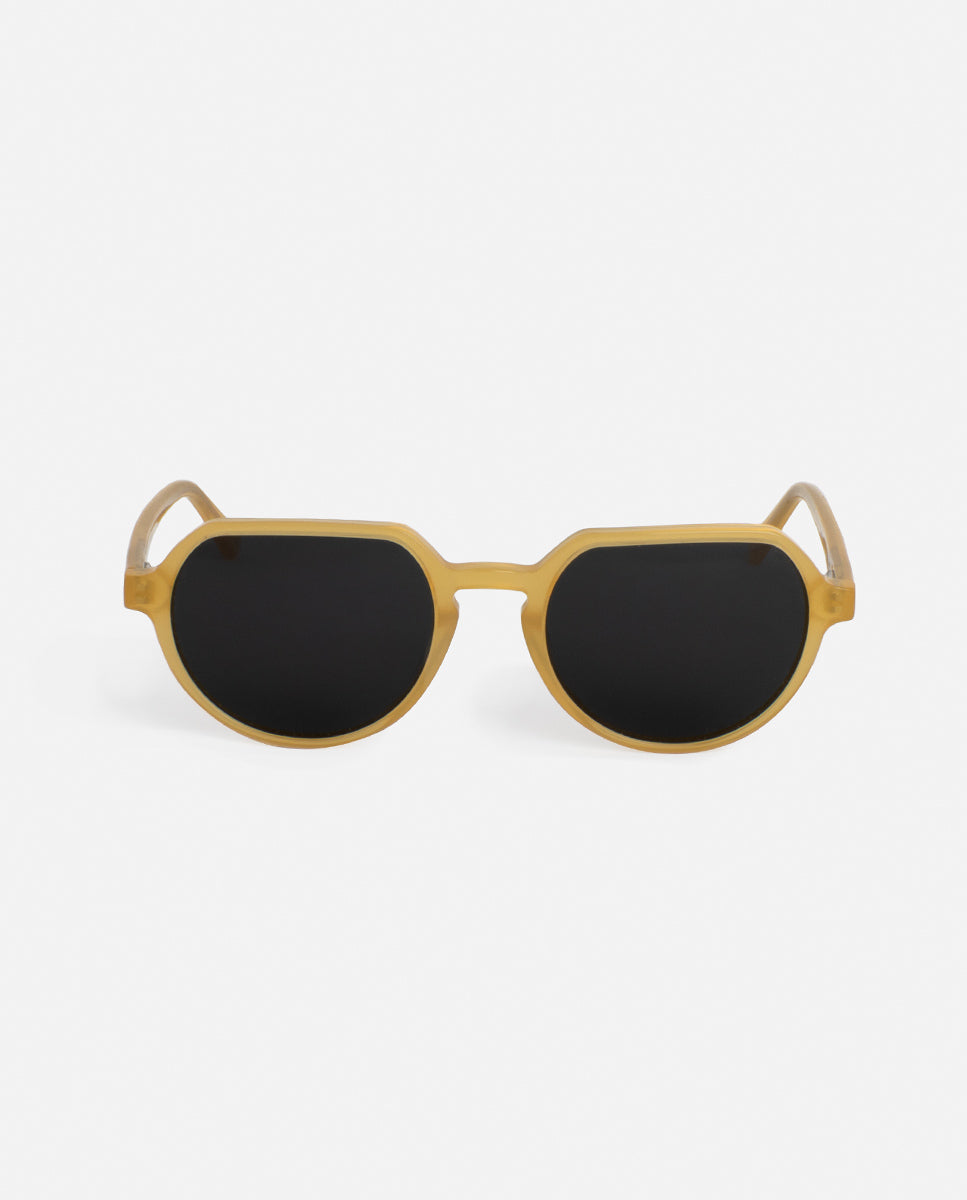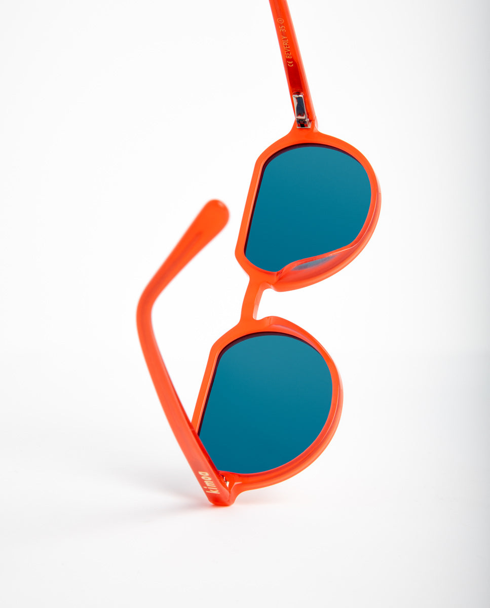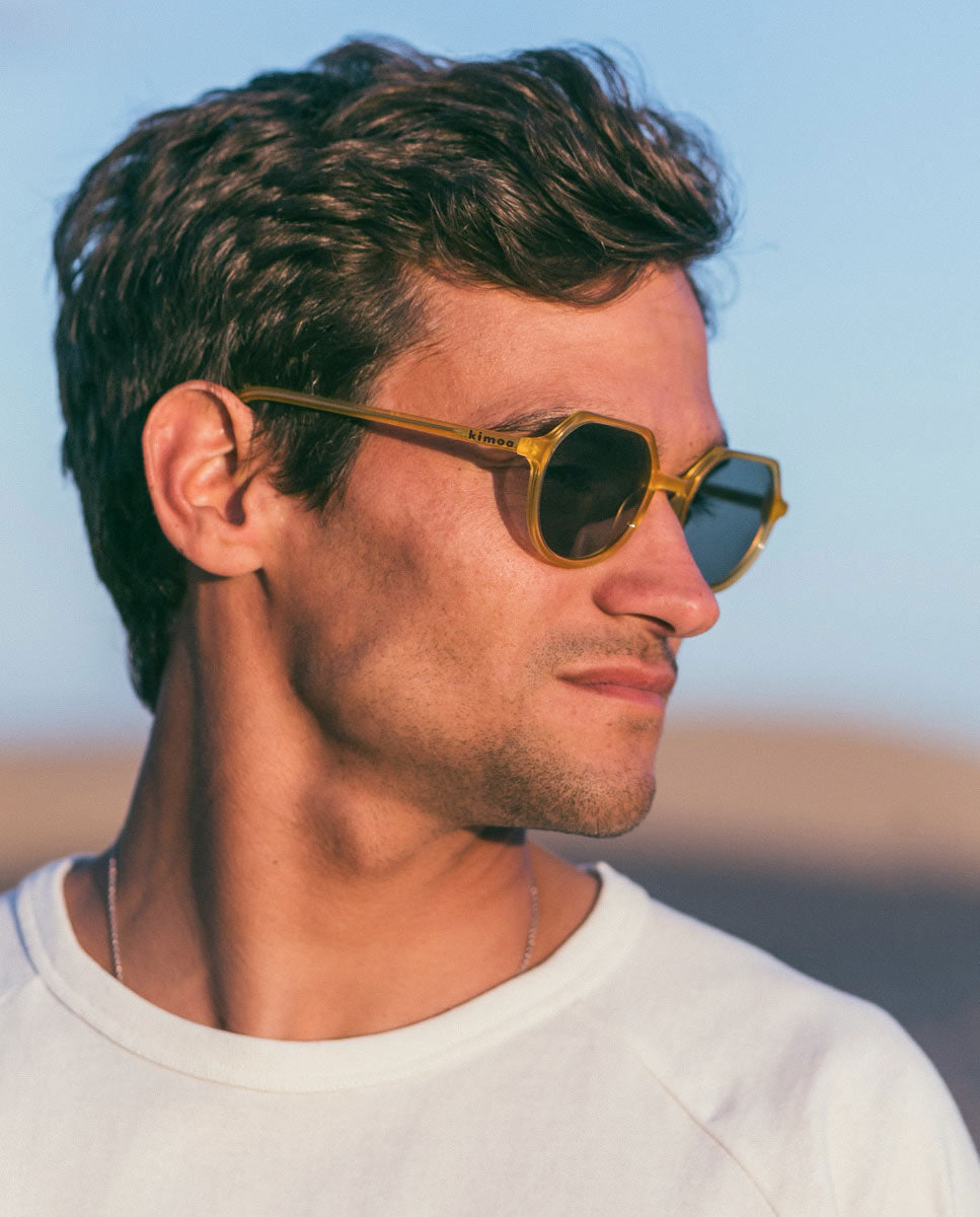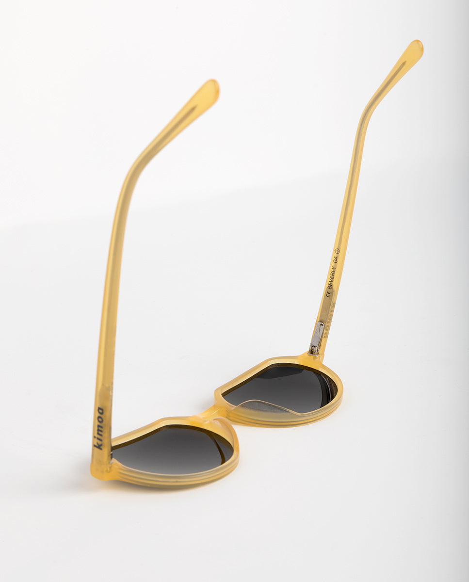 xOval shaped sunglasses with acetate frame material and kimoa logo embossed on the sides. Acetate is one of the most premium materials in sunglasses frames, it is extracted from cotton, it is anti-allergic and last longer than other materials.
