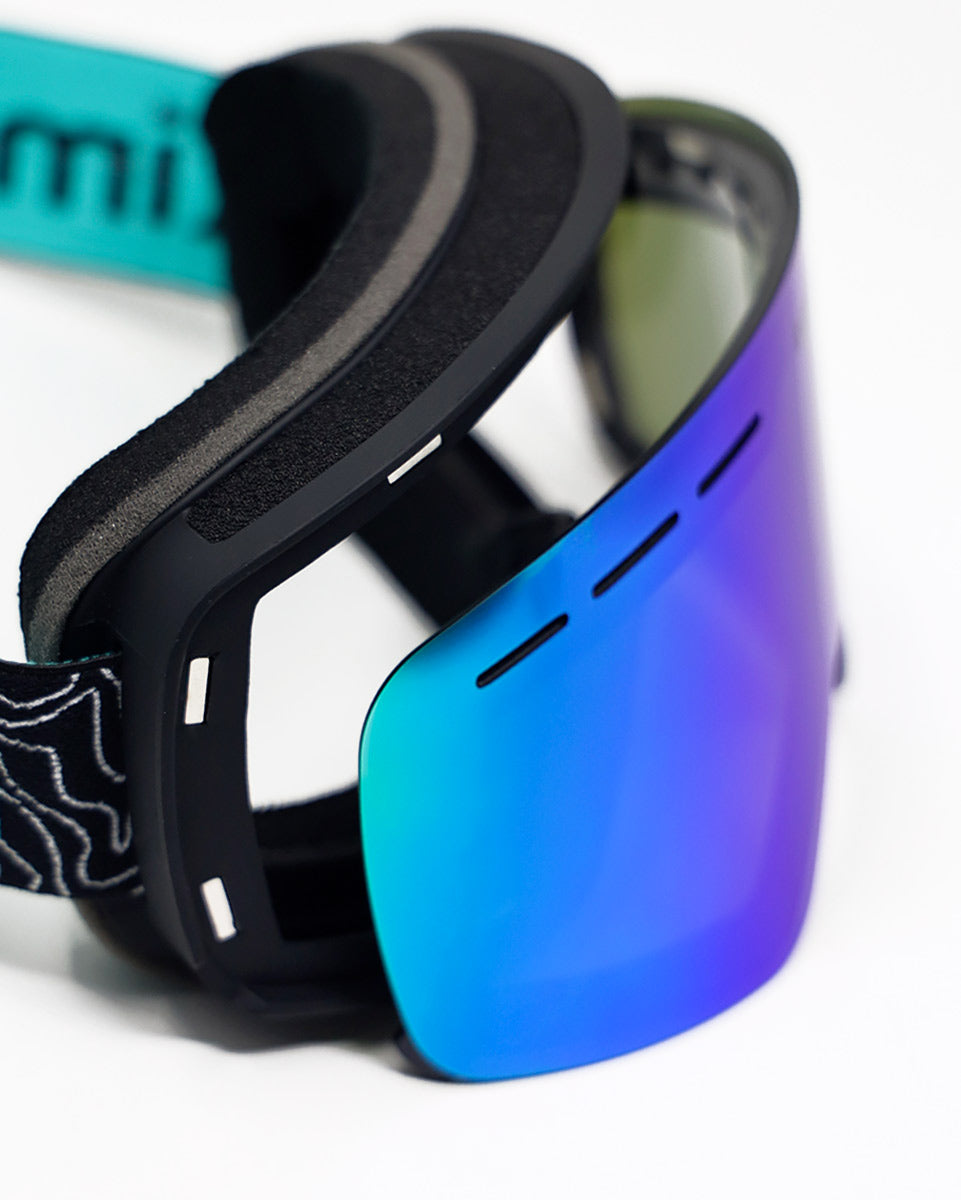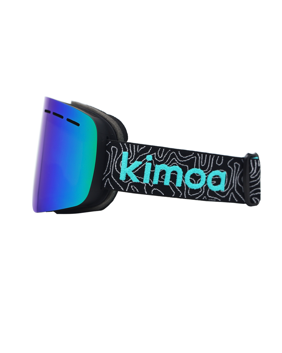 xGoggle LAB Arctic ski goggle, inspired by the freest spirits. The recycled TPU frame makes the new Goggle LAB Arctic an extremely light ski glasses. Matt black frame and black elastic band with a graphic of white lines and green Kimoa logo. Its minimalist design makes the cylindrical blue/green-colored lens the main protagonist of this essential model. Flow ventilation technology designed to reduce fogging and optimize airflow above the interior of the lenses. With the Kimoa LAB design, changing lenses is quick and easy, without compromising the complete lens seal, for thus preventing extreme conditions from penetrating the mask. It incorporates protective foam that provides optimal comfort and perfect air circulation. It has an elastic anti-slip strap to achieve the best fit to the helmet. Overcome the limits with Kimoa LAB.