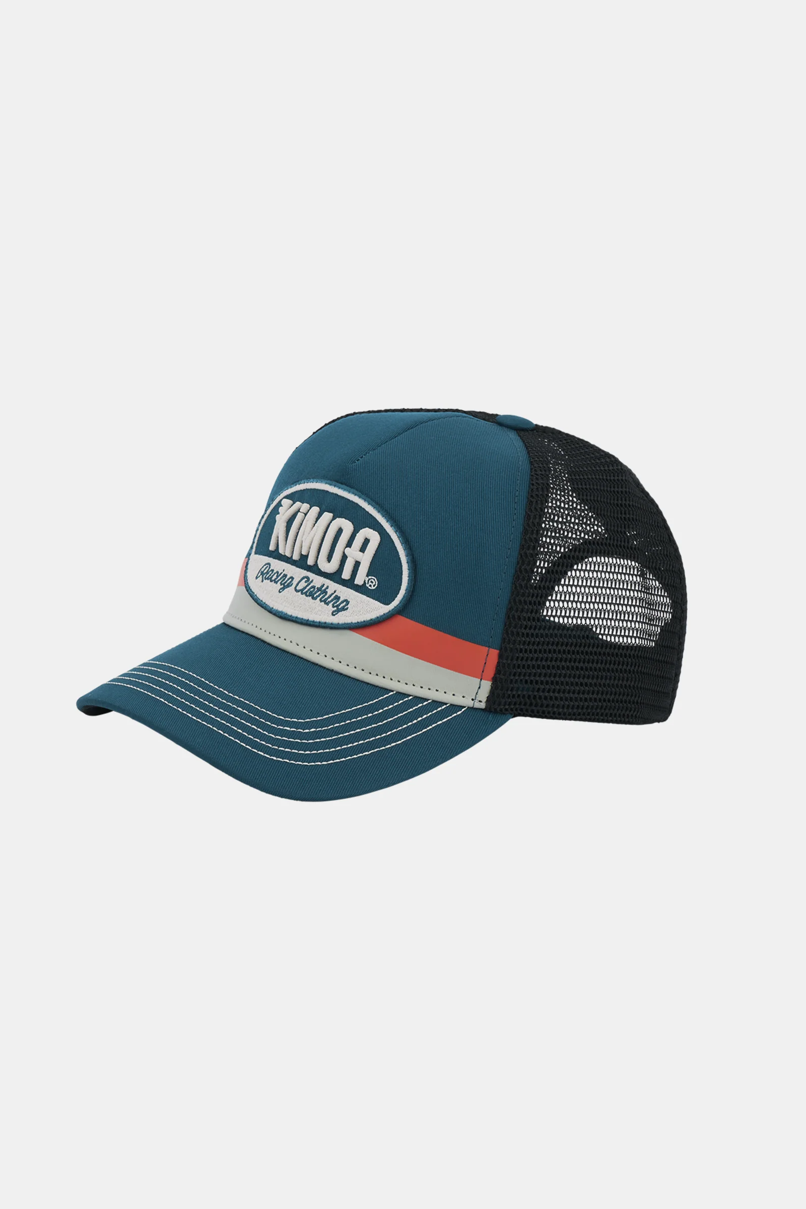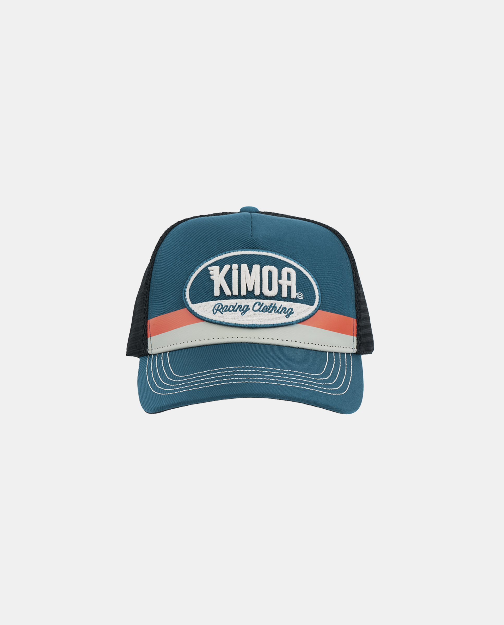 xPowered by Kimoa Red is a five-panel trucker cap with curved bill. Blue colour front panel, featuring a thin warm red and a larger warm grey band at the bottom. Kimoa Racing embroidery patch with 3D Kimoa logo in warm grey and Racing Clothing claim in matching blue.