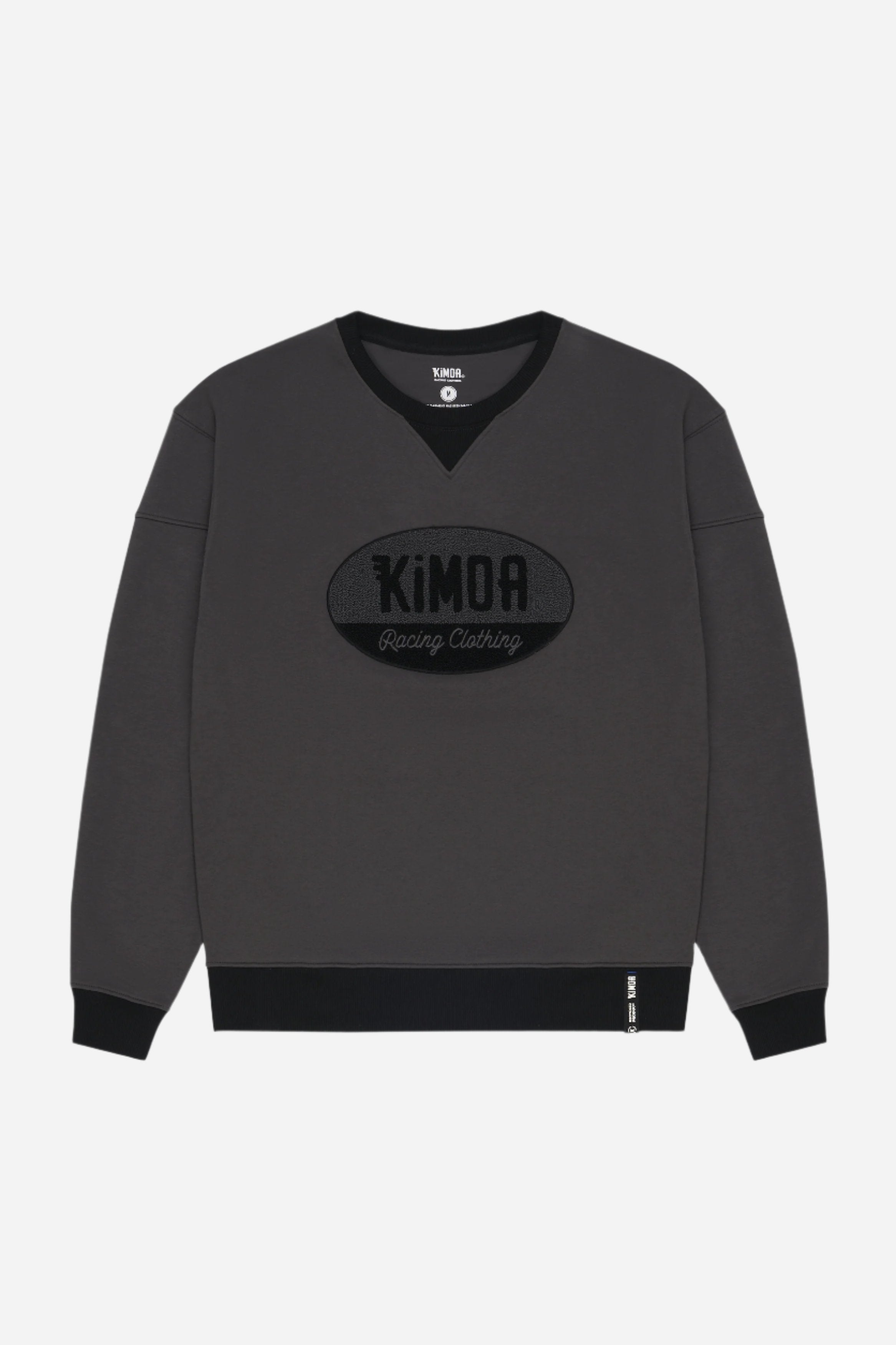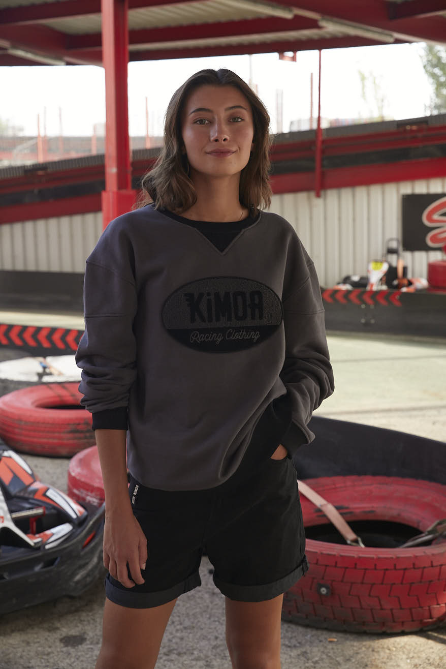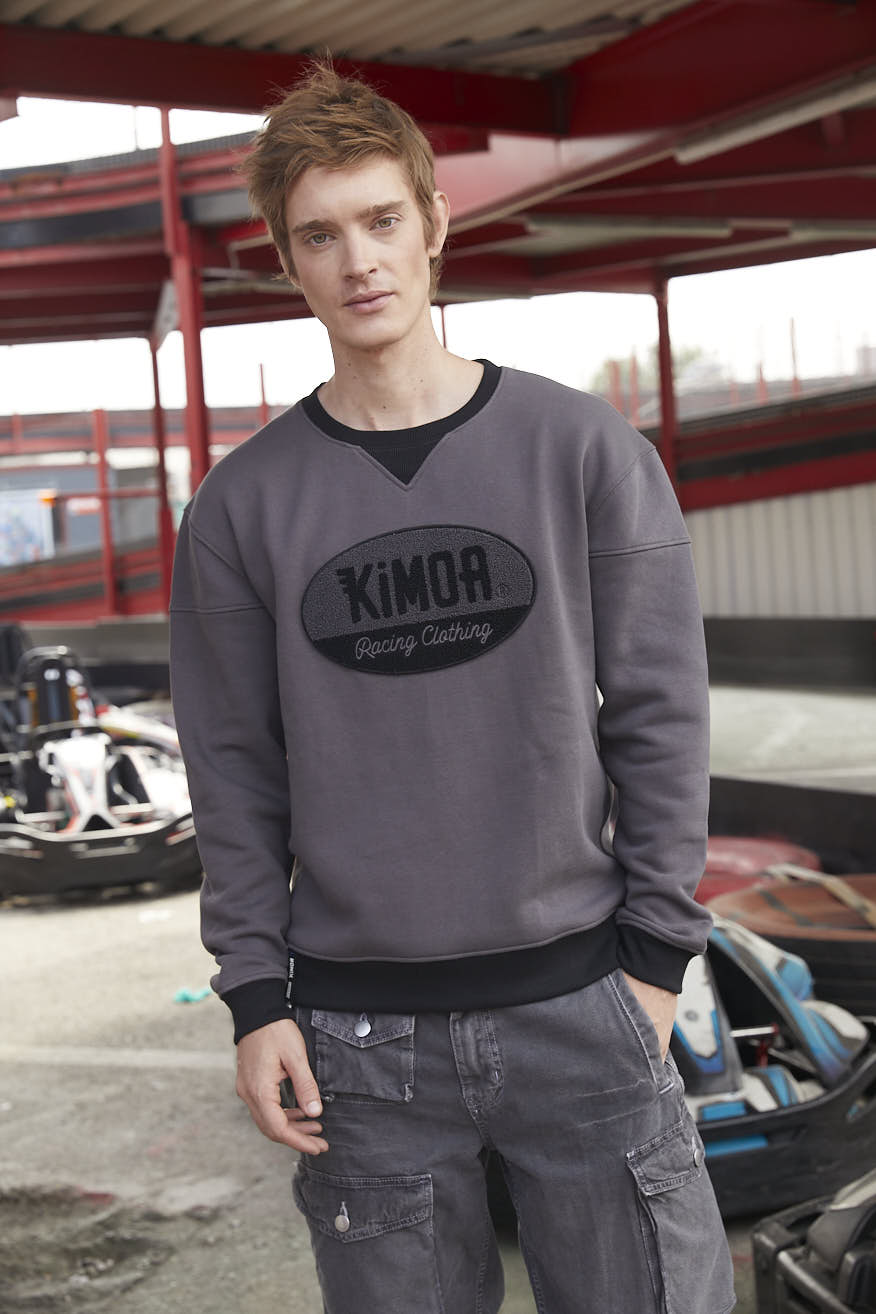 xSudadera Large Patch Racing gris oscuro confeccionada con material reciclado. Parche base grande y ovalado tono sobre tono y logo Kimoa bordado en contraste gris oscuro en el pecho. Puños y bajo en contraste azul oscuro. Detalles del estampado interior del cuello en color blanco roto. Etiqueta de fieltro negra con logo engomado en la cintura “Kimoa recycled product” en color blanco roto.