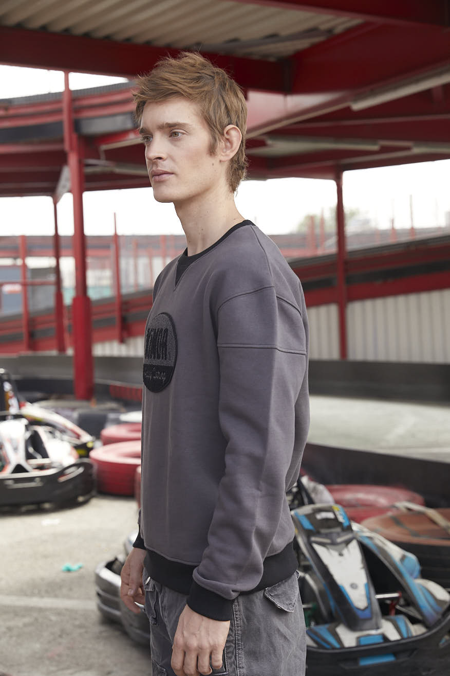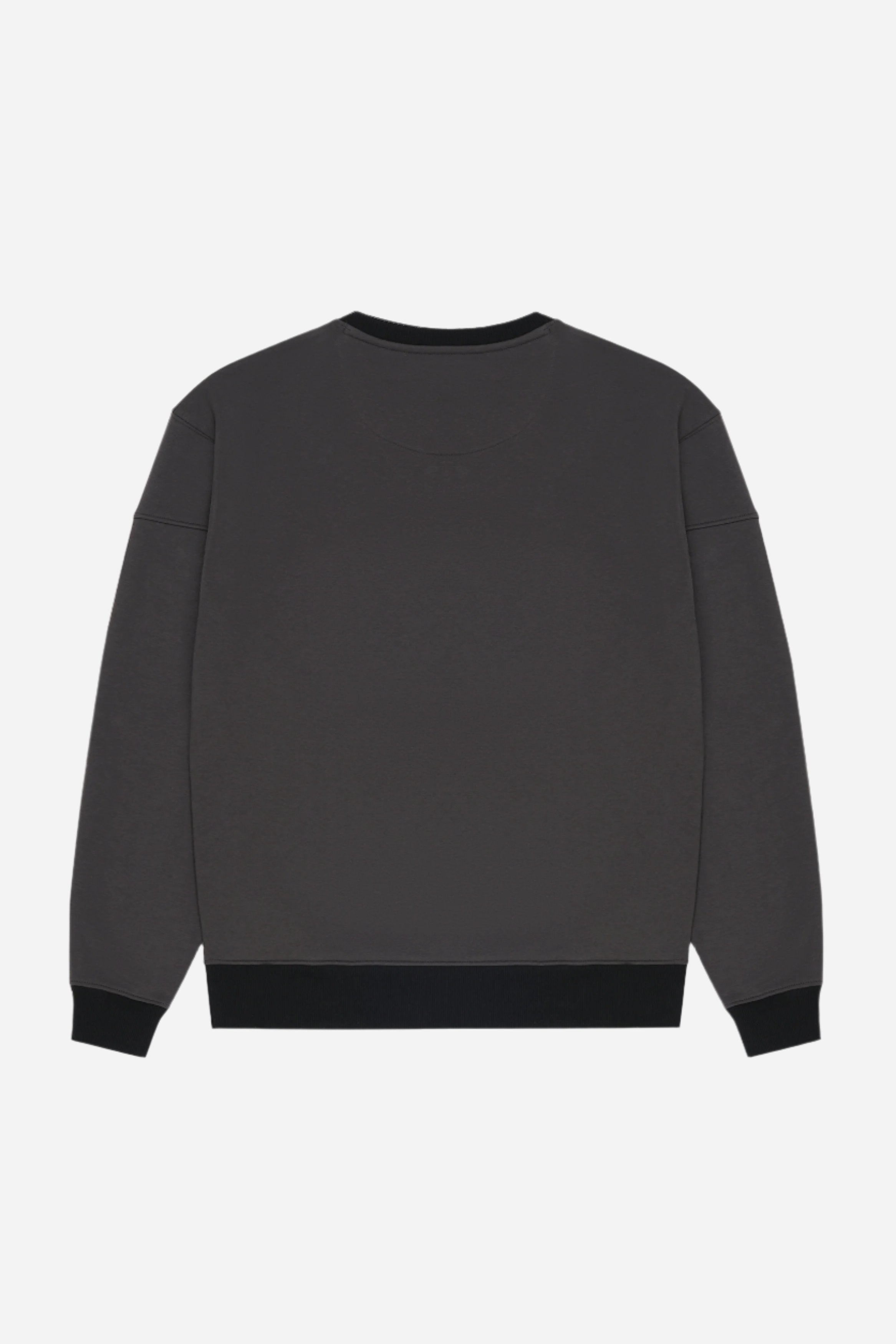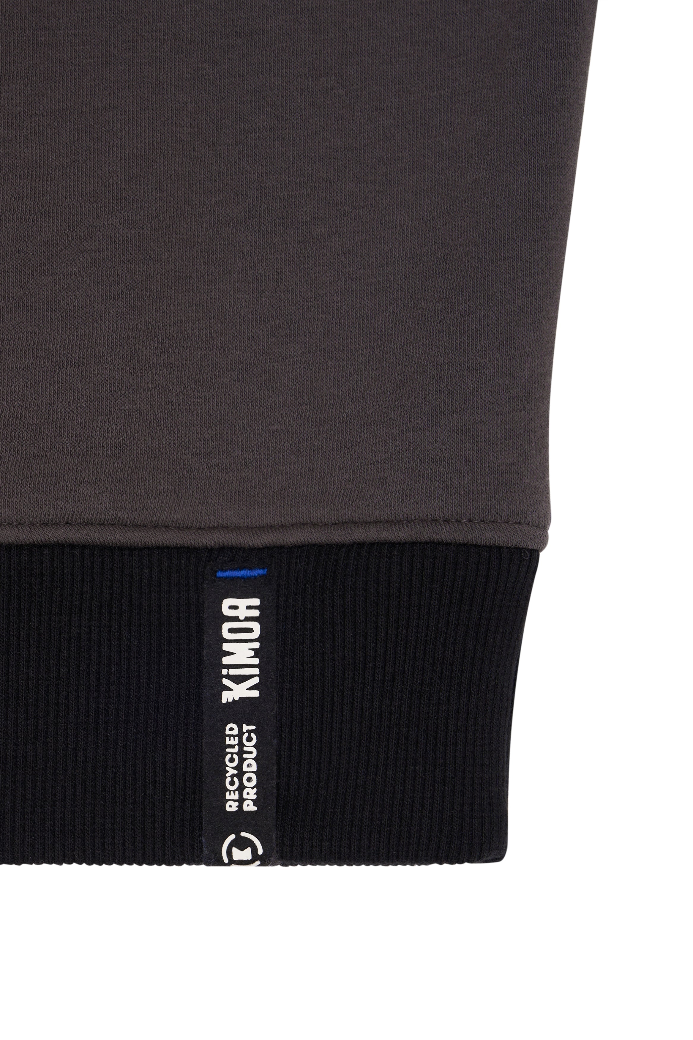 xSudadera Large Patch Racing gris oscuro confeccionada con material reciclado. Parche base grande y ovalado tono sobre tono y logo Kimoa bordado en contraste gris oscuro en el pecho. Puños y bajo en contraste azul oscuro. Detalles del estampado interior del cuello en color blanco roto. Etiqueta de fieltro negra con logo engomado en la cintura “Kimoa recycled product” en color blanco roto.