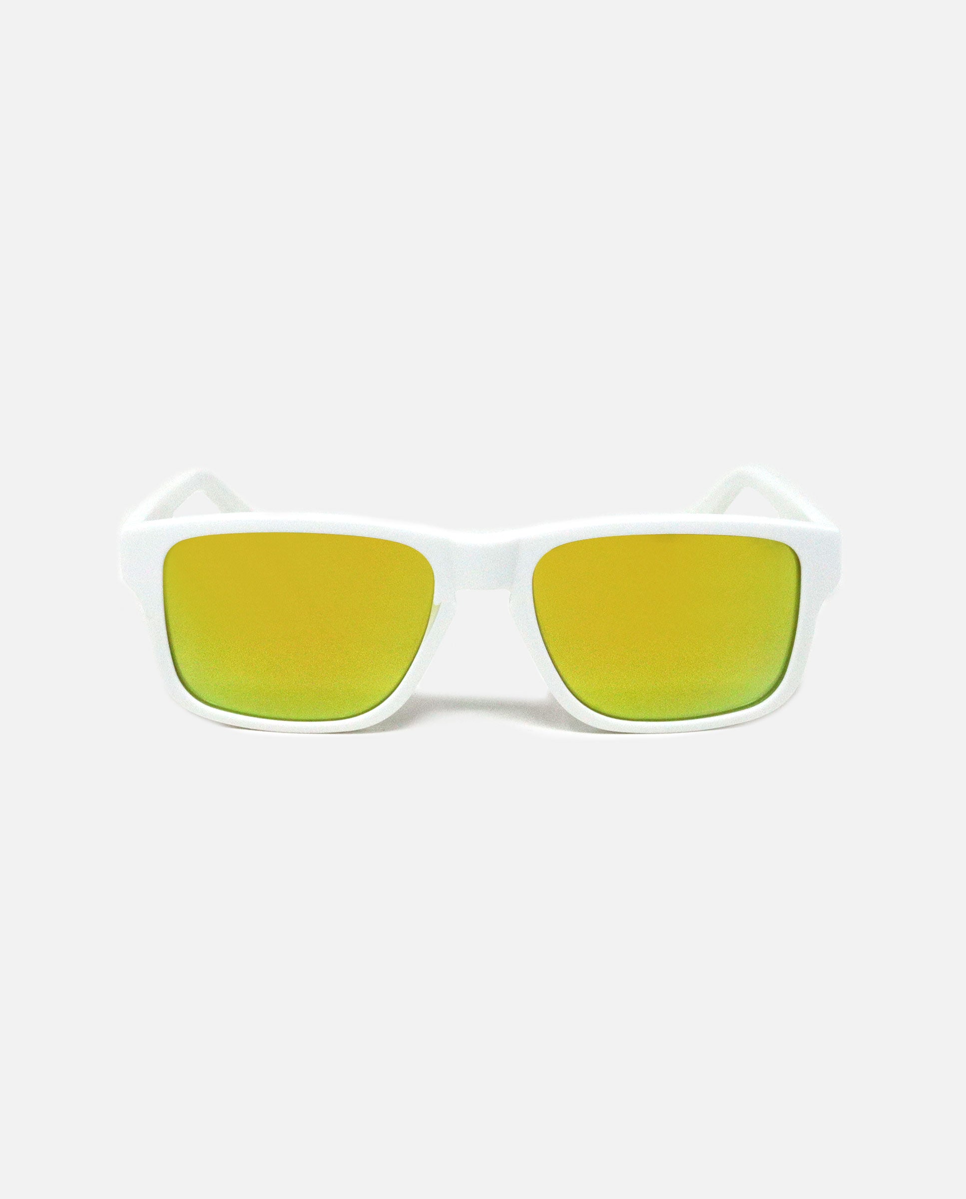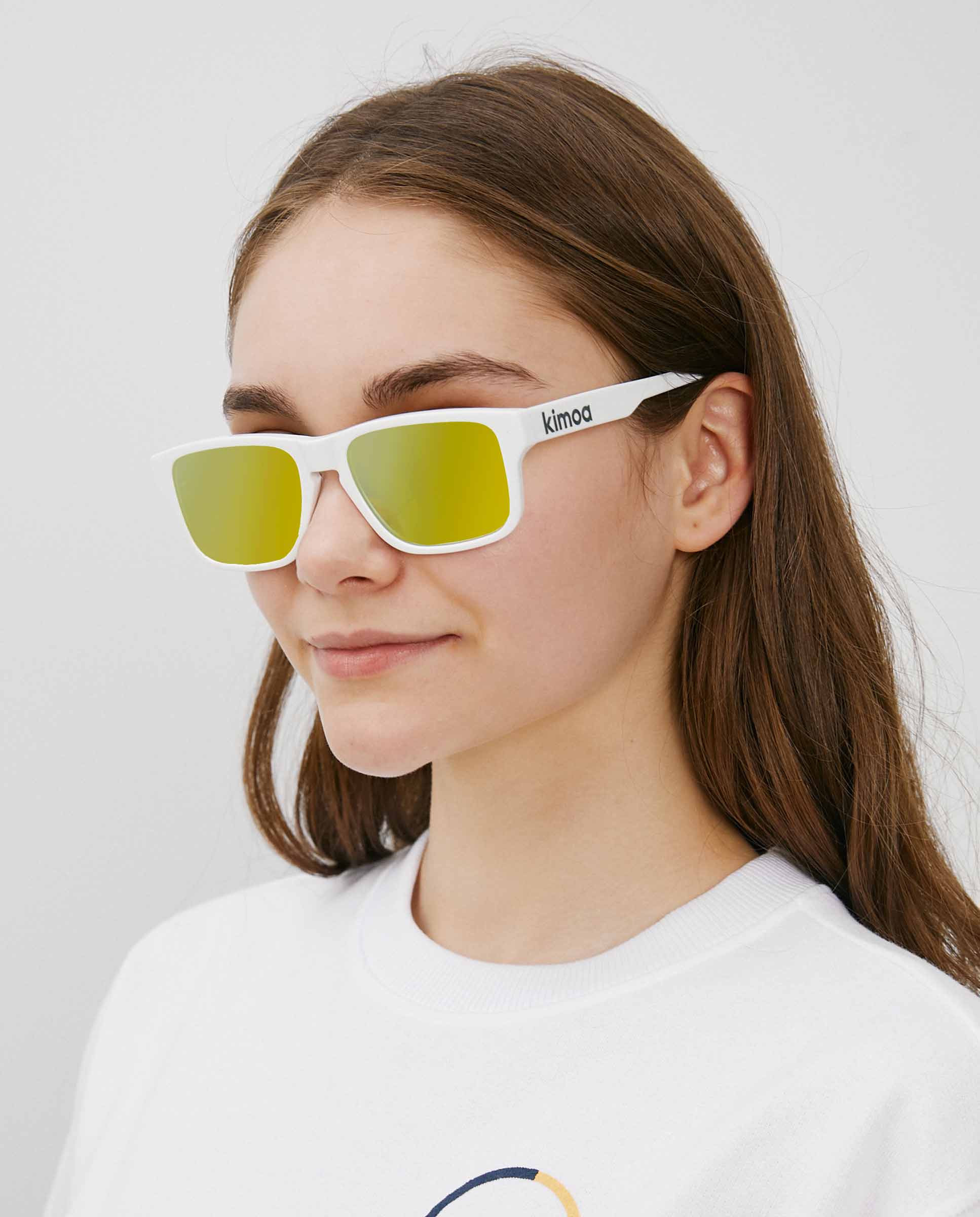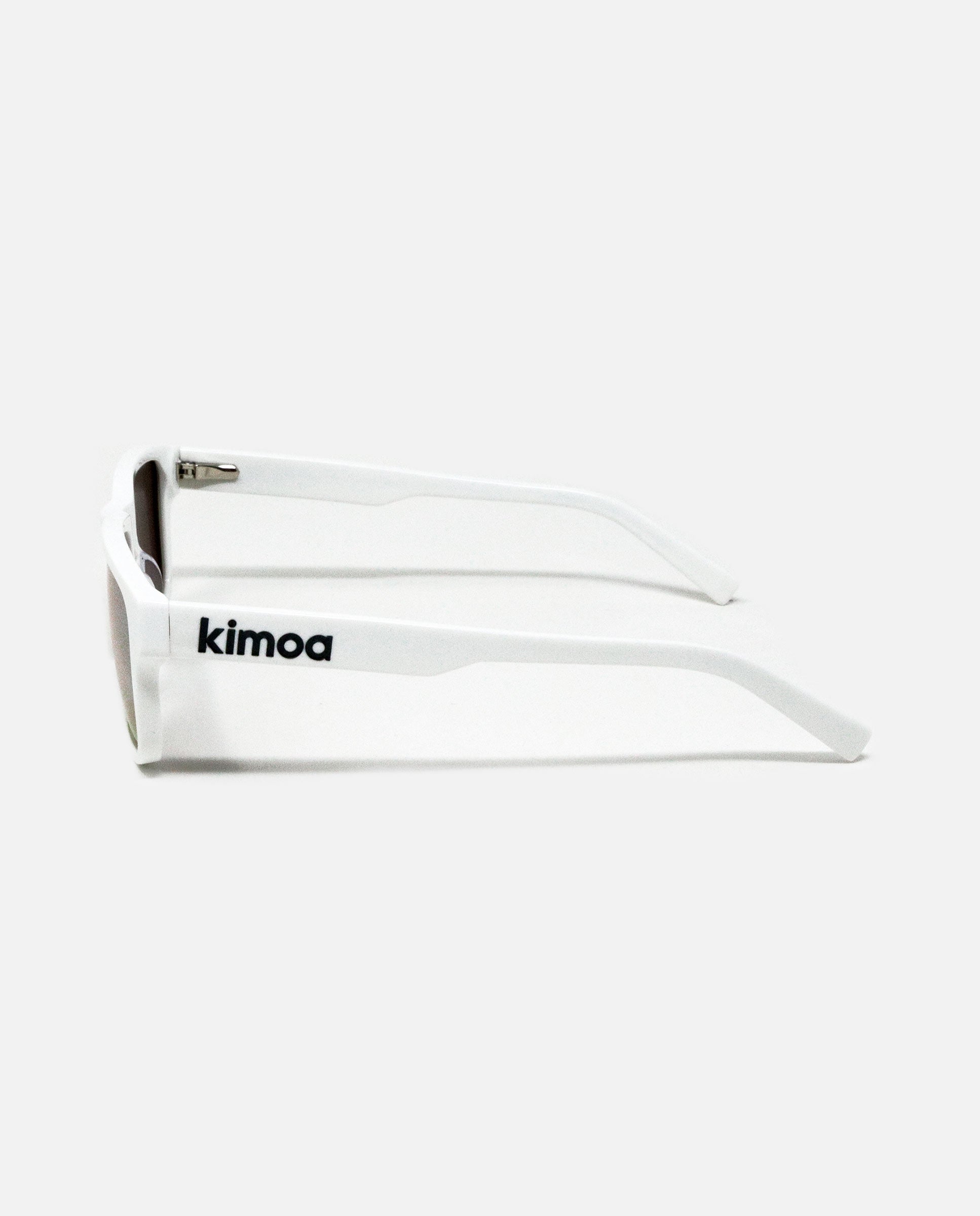 xGafas de sol Icónicas Sidney Golden Light con montura de Bio-acetato cuadradas de color blanco brillante y logo kimoa en ligero bajo relieve en las patillas de color negro. Frase en una de las patillas "Be conscious is stylish". Lentes polarizadas espejo de tonalidad dorada. El bio-acetato es un material ecológico, entre sus características, ya que para su fabricación se añaden unicamente aditivos orgánicos al algodón, que lo transforman en un nuevo material eco-sostenible y biodegradable.