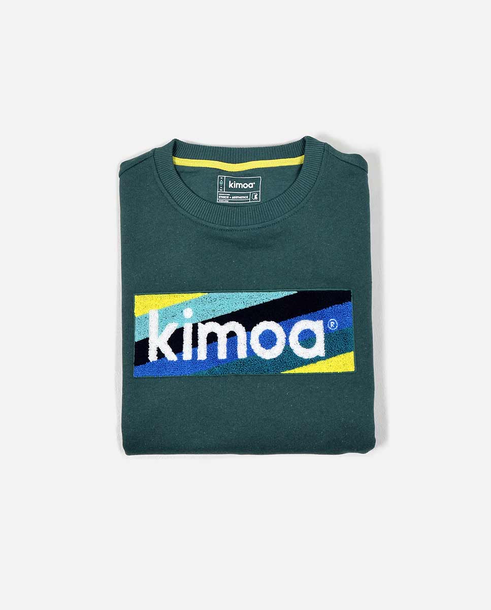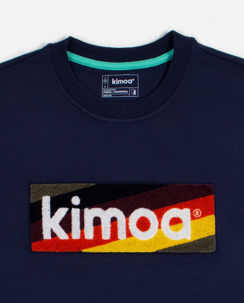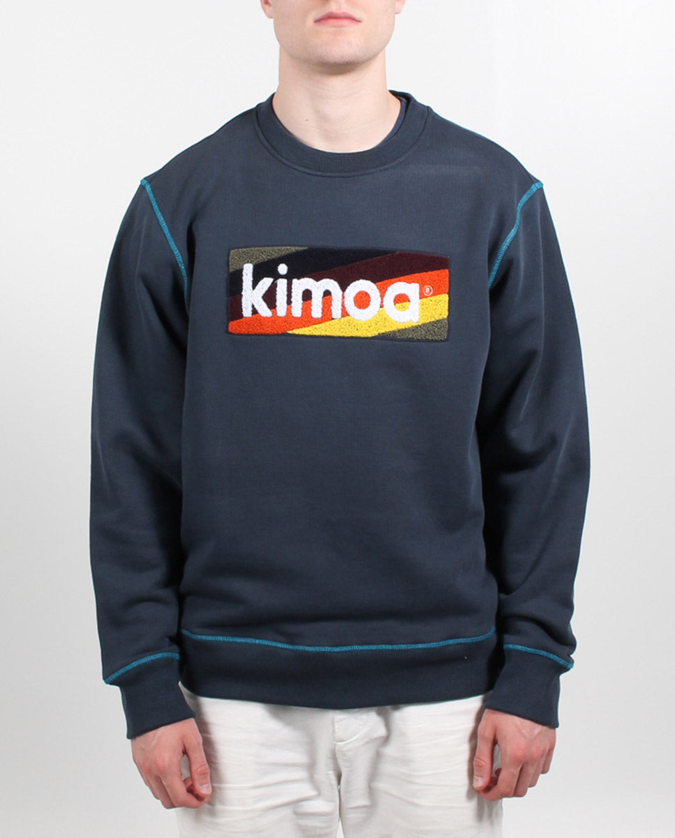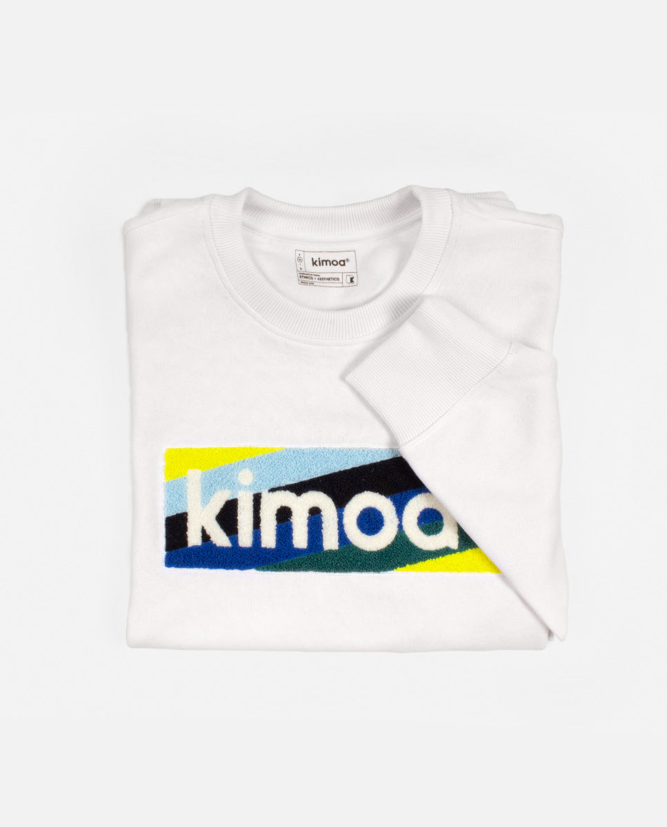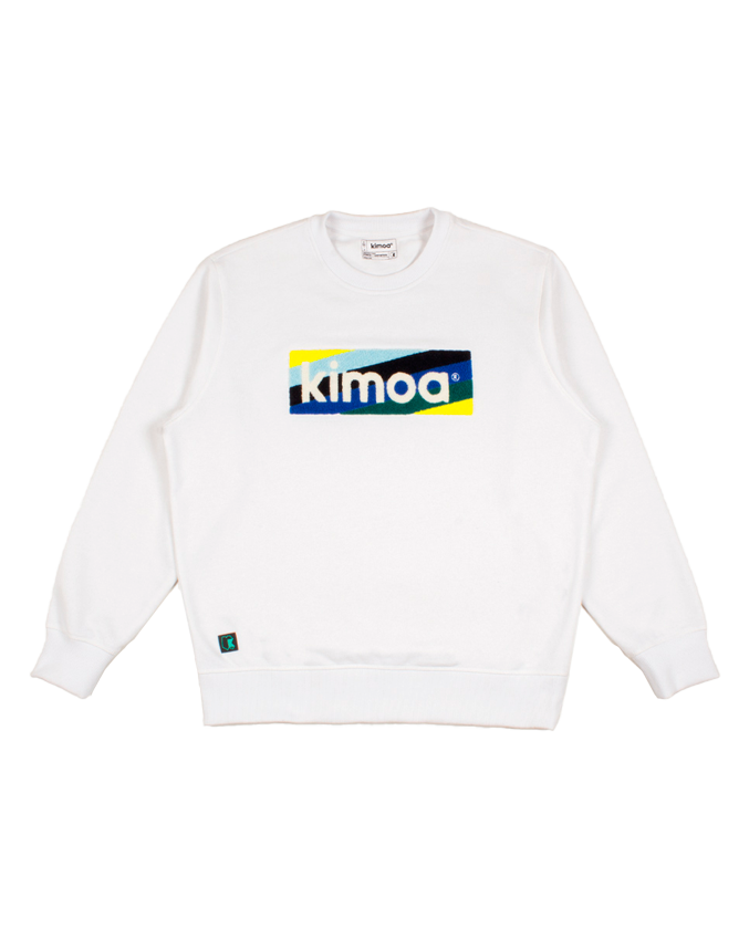 xWhite crewneck sweatshirt and striped towel fabric Kimoa logo at the chest.