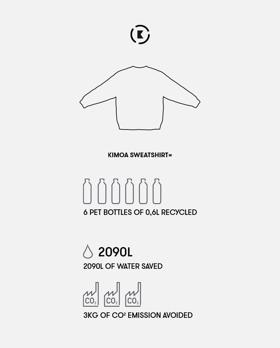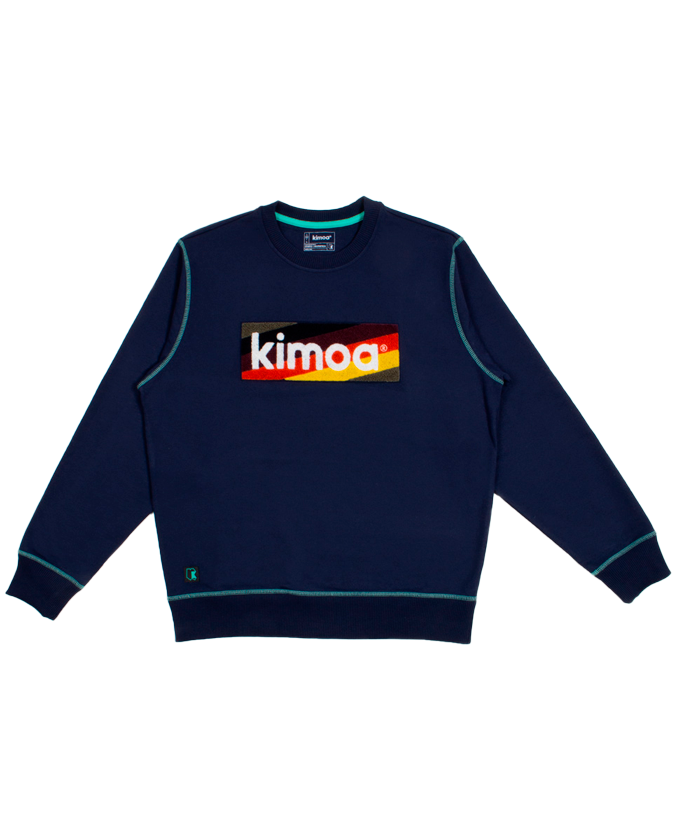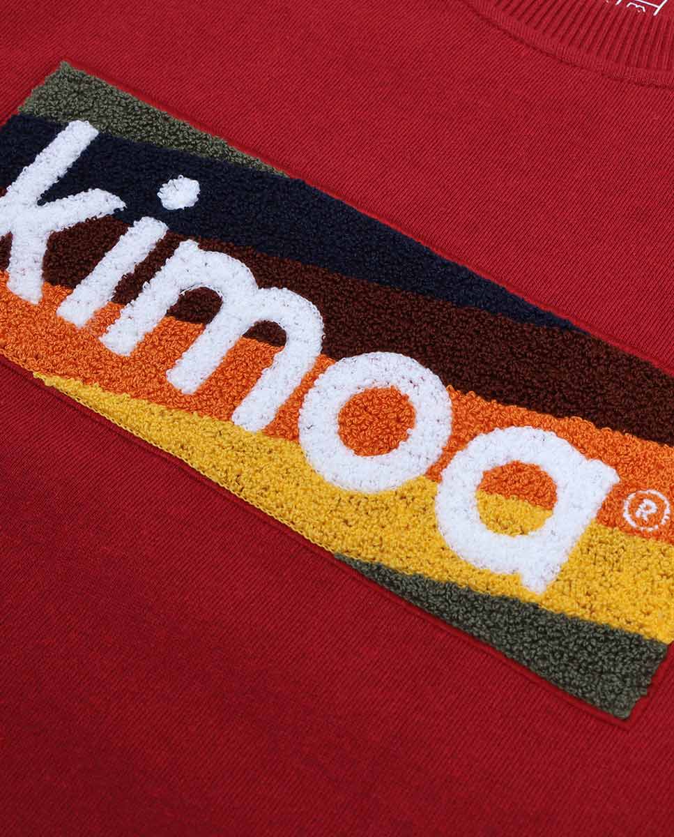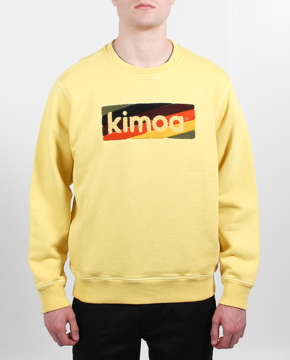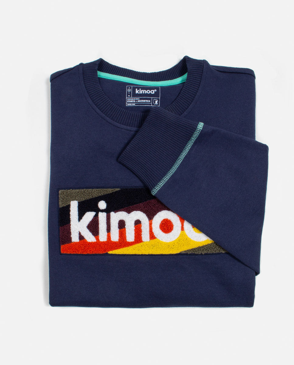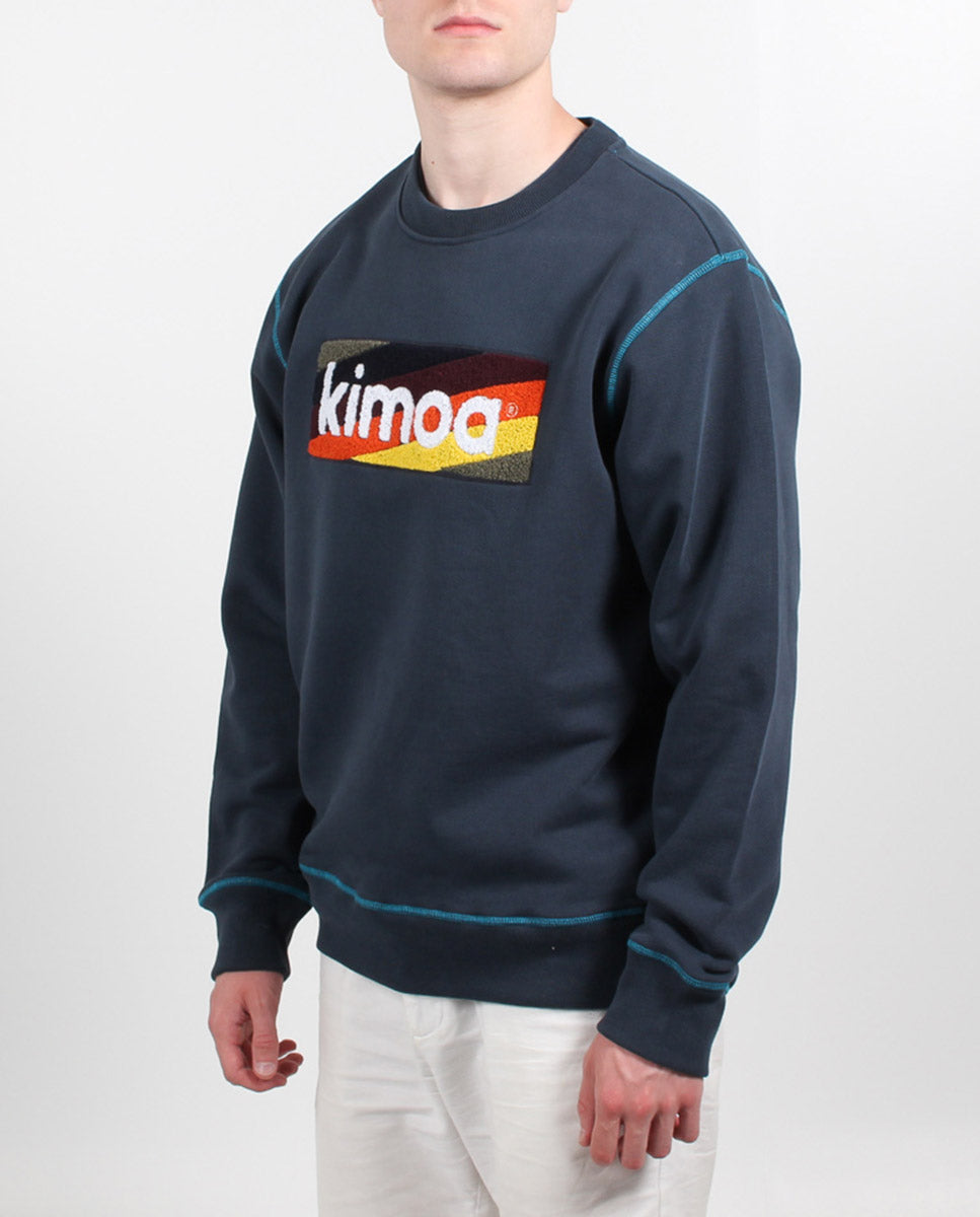 xWhite crewneck sweatshirt and striped towel fabric Kimoa logo at the chest.