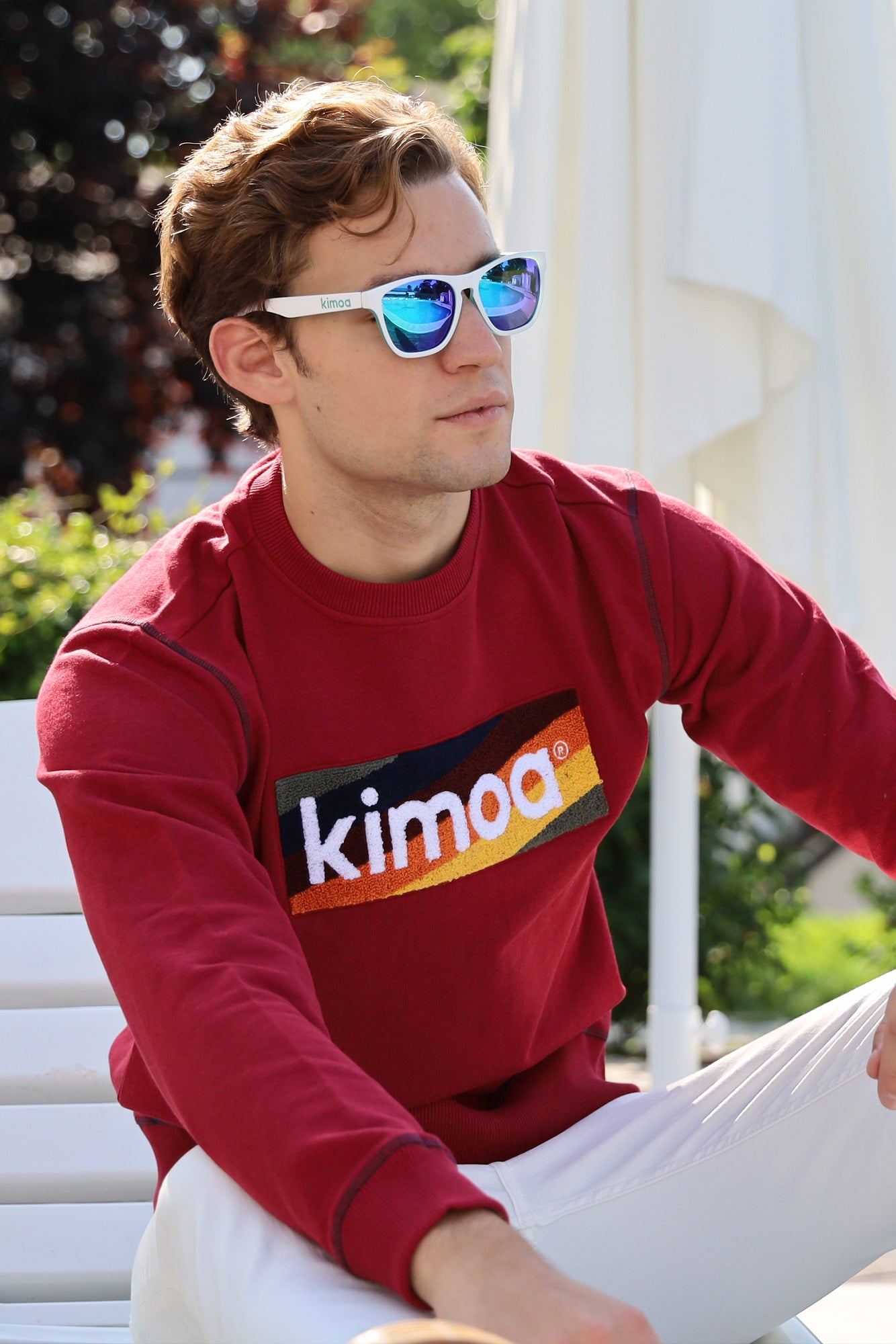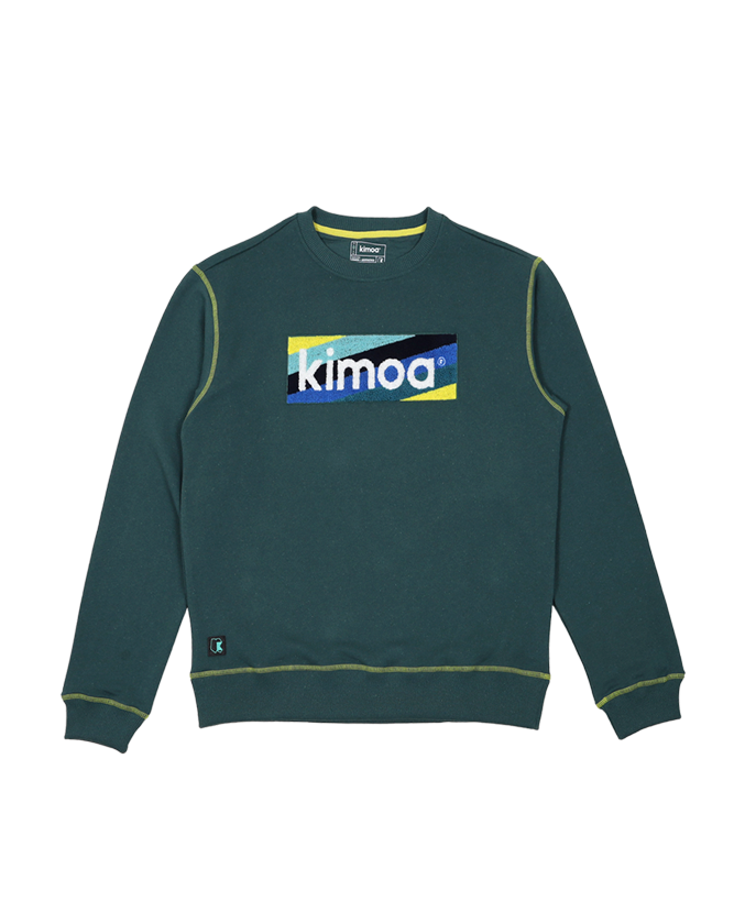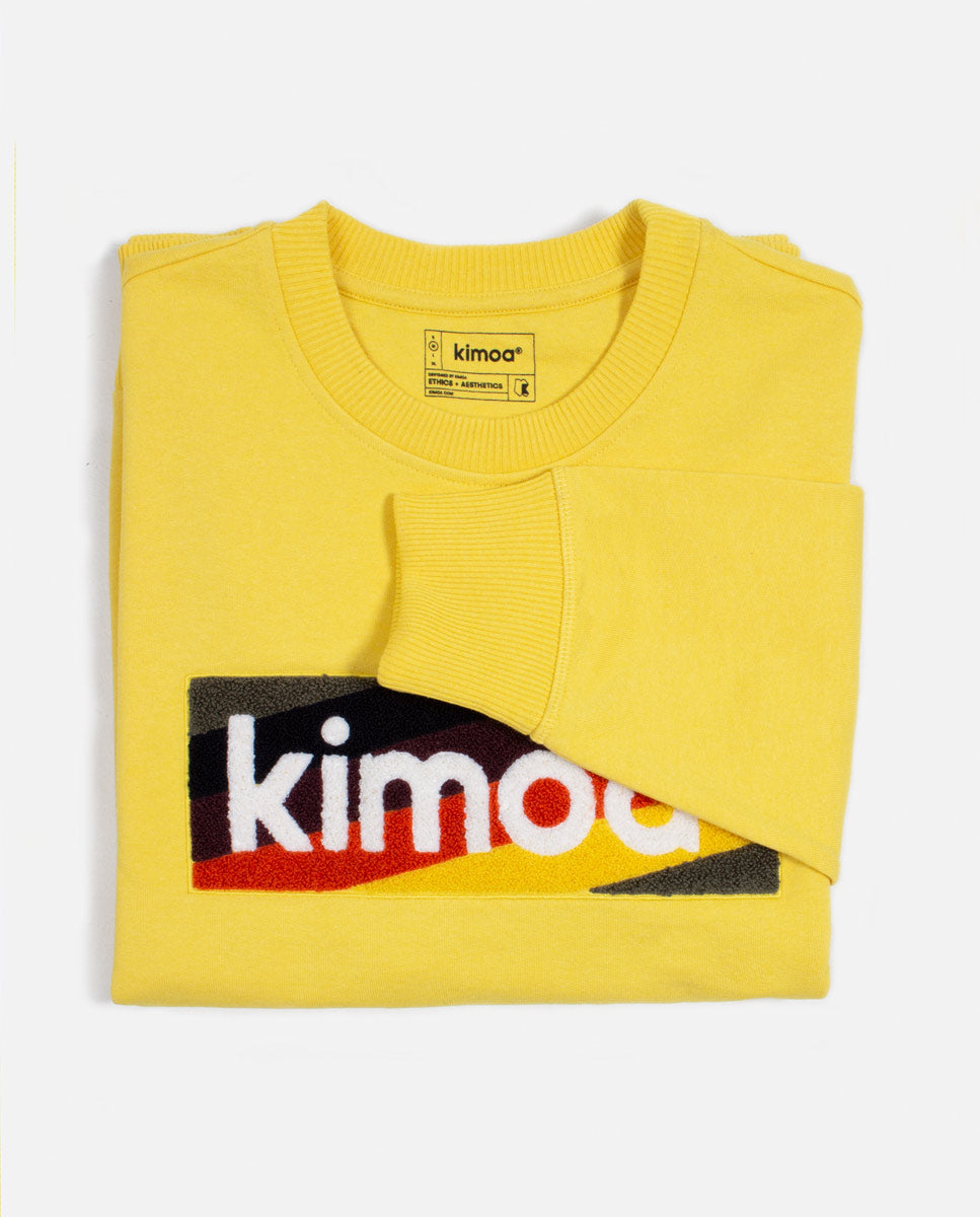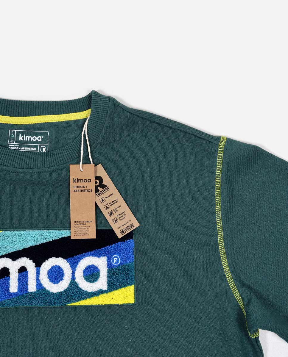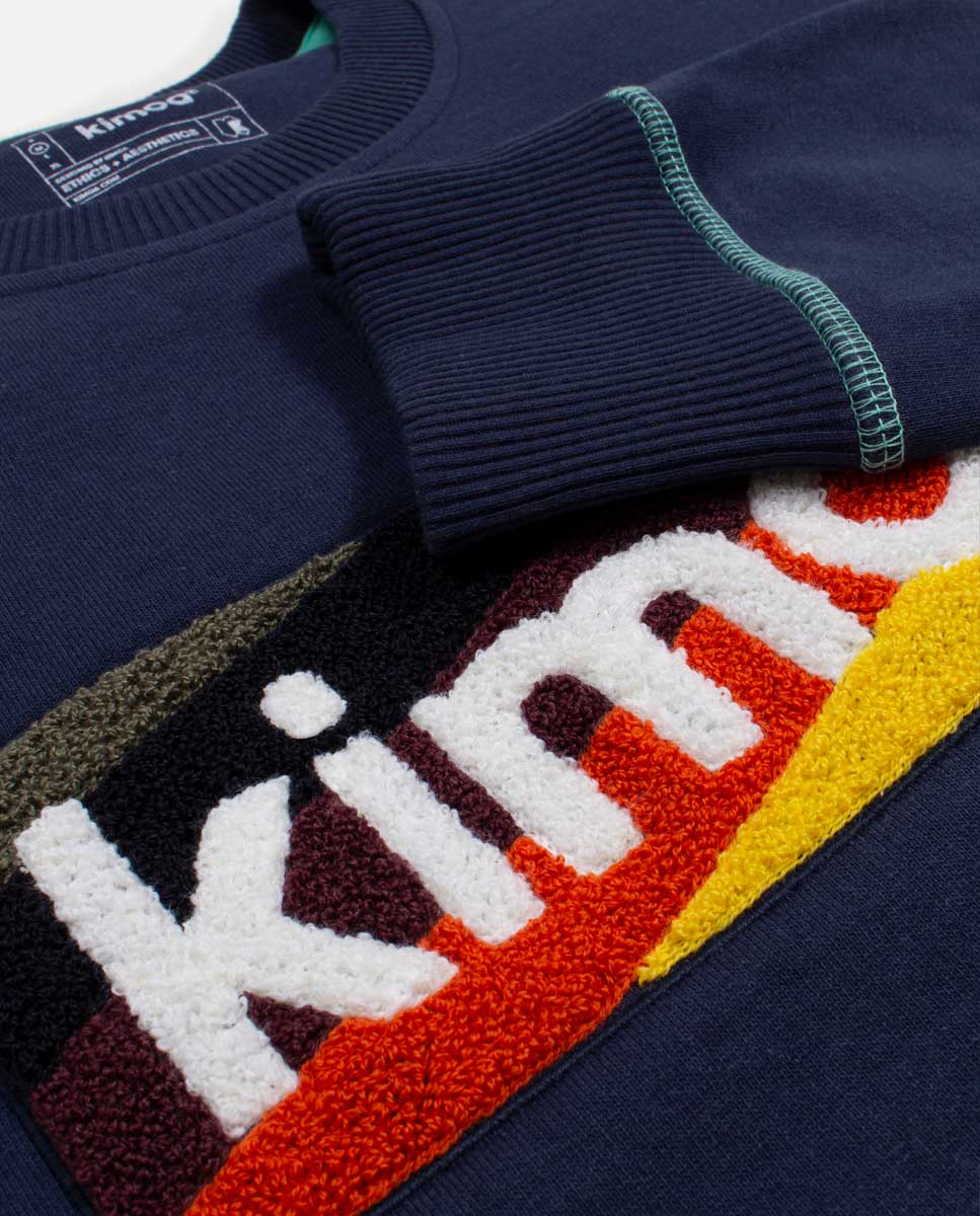 xWhite crewneck sweatshirt and striped towel fabric Kimoa logo at the chest.