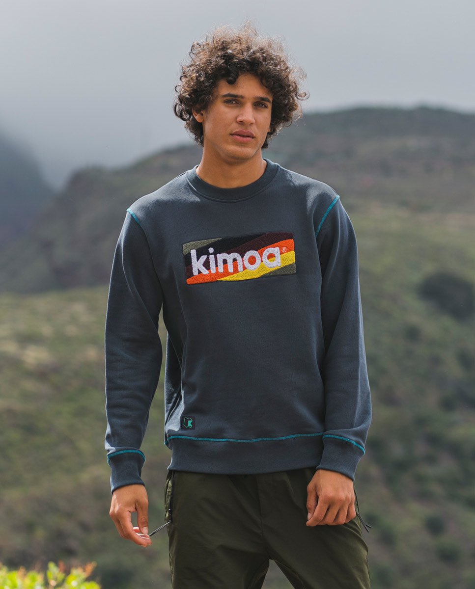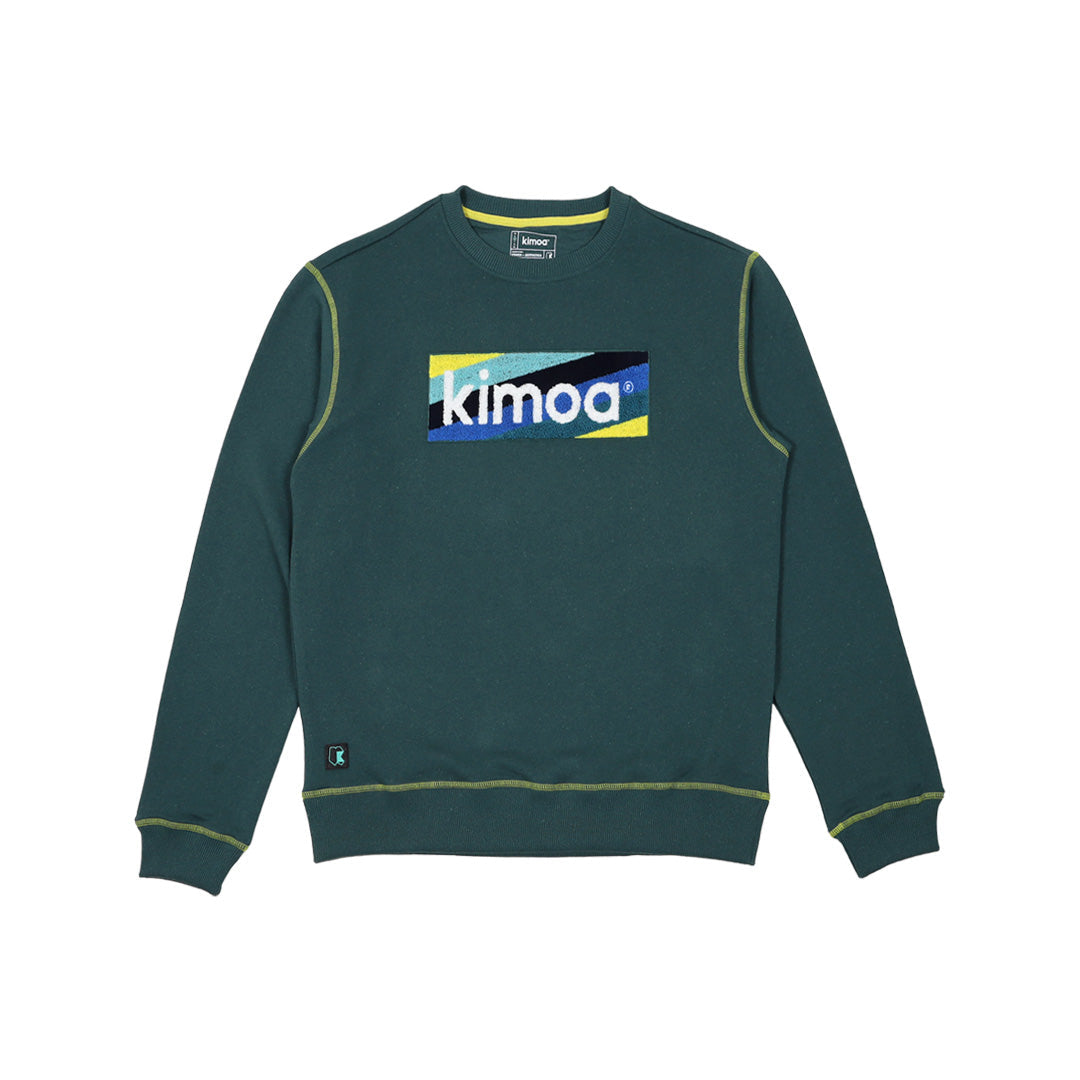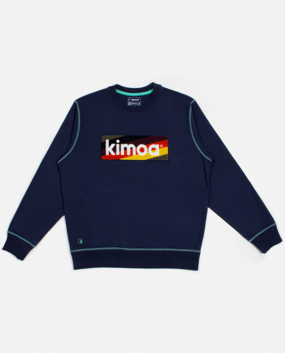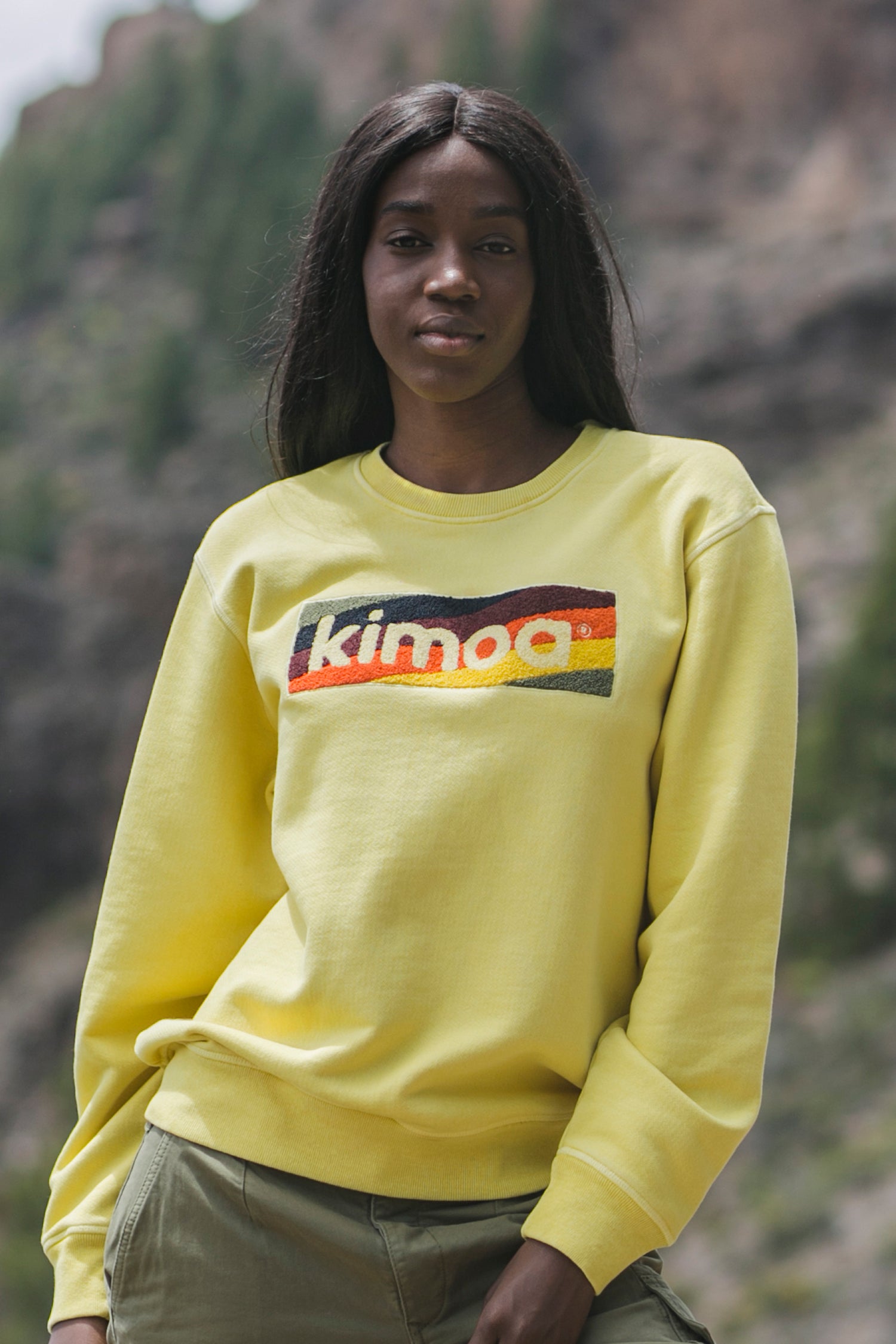 xWhite crewneck sweatshirt and striped towel fabric Kimoa logo at the chest.