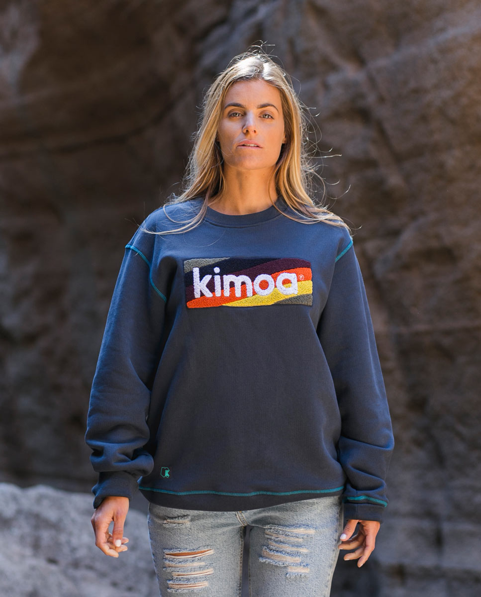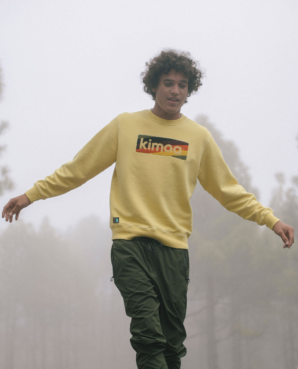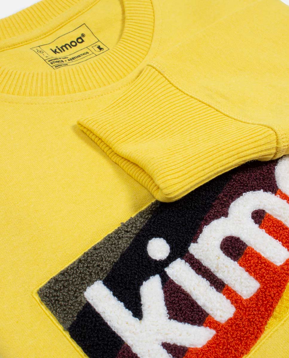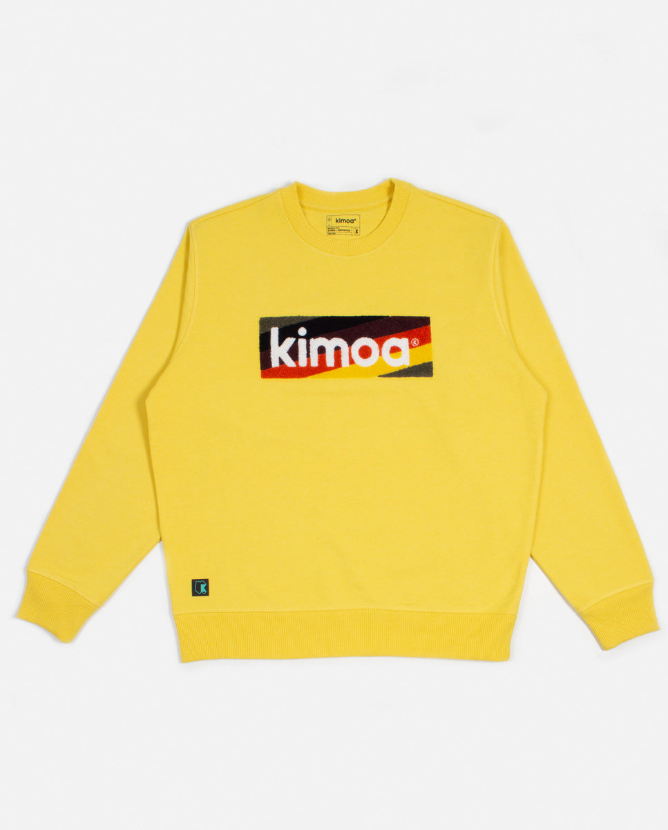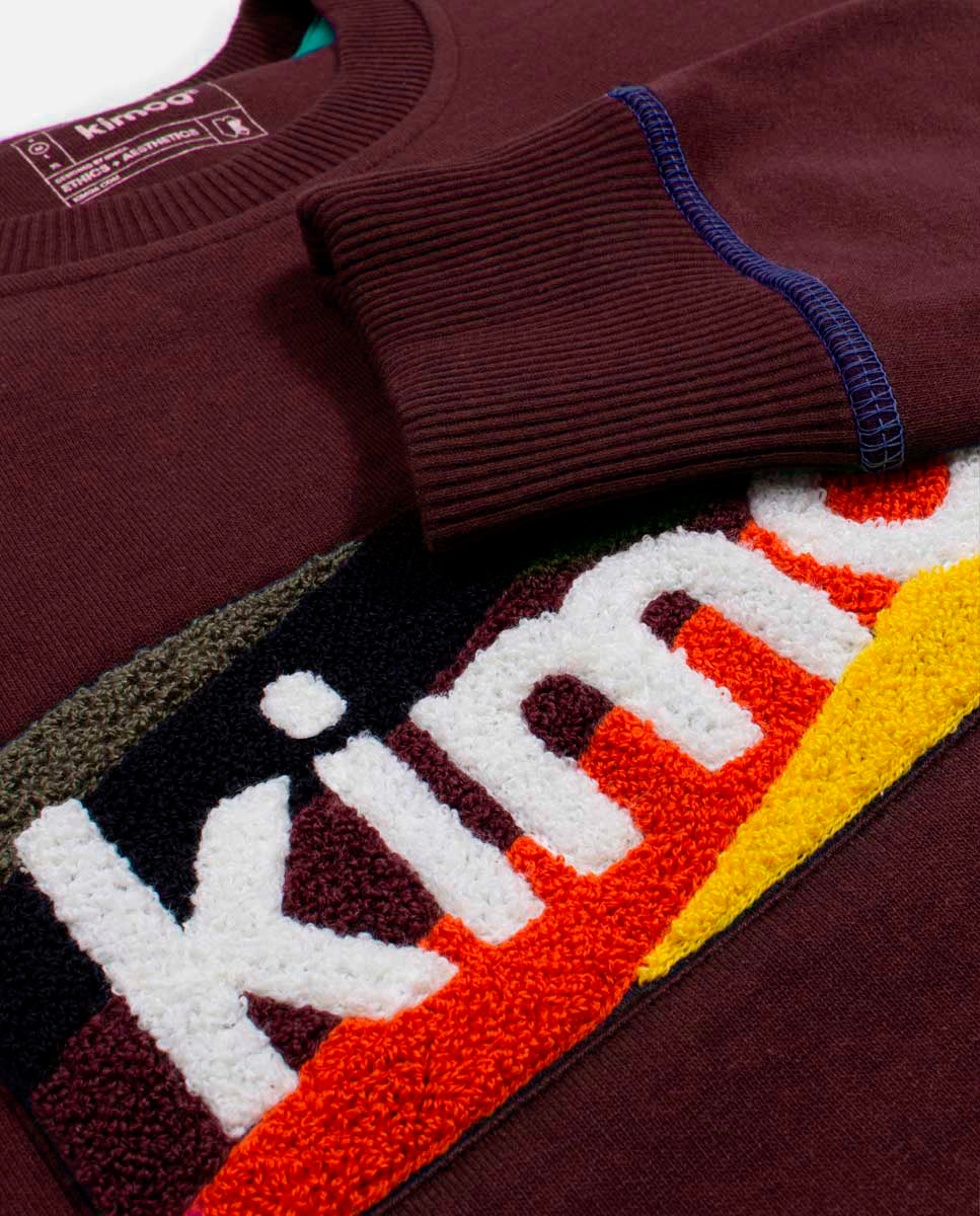xWhite crewneck sweatshirt and striped towel fabric Kimoa logo at the chest.
