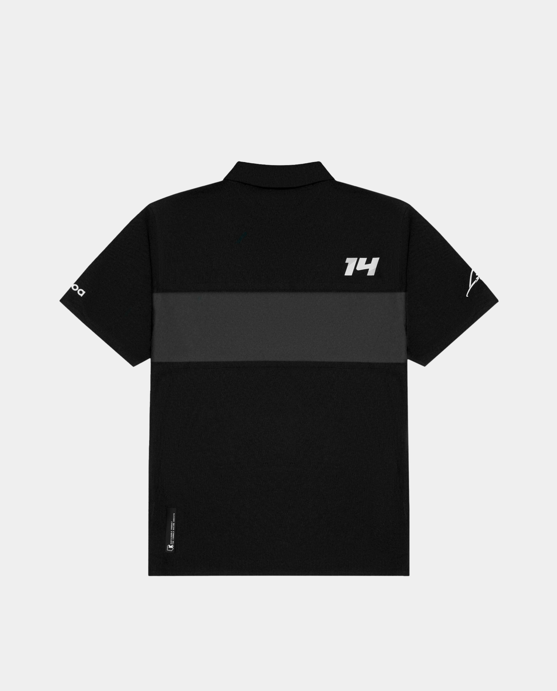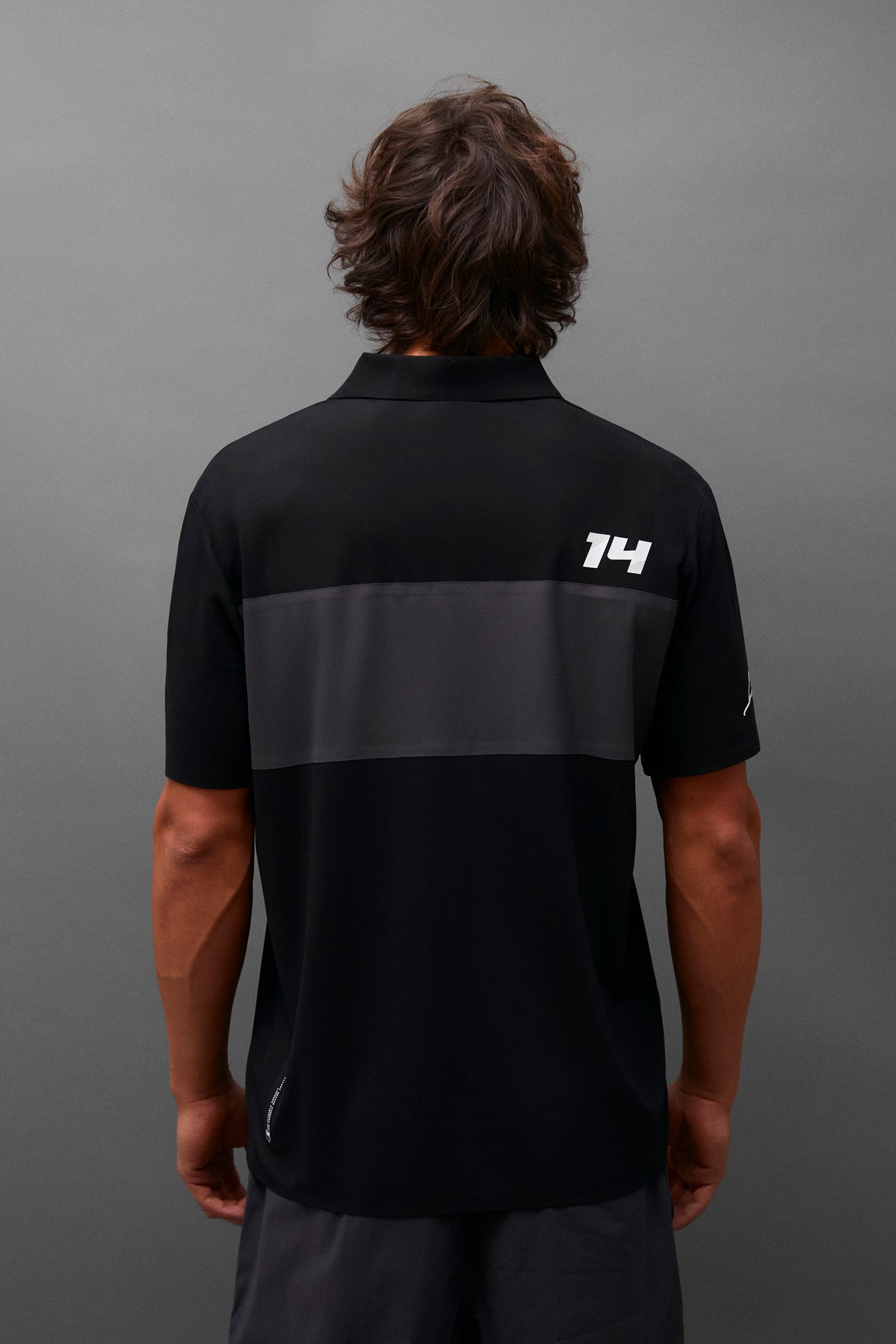 Polo Aston Martin F1 Team x Kimoa de manga corta color negro en piqué reciclado que combina el estilo corporativo con la sostenibilidad.