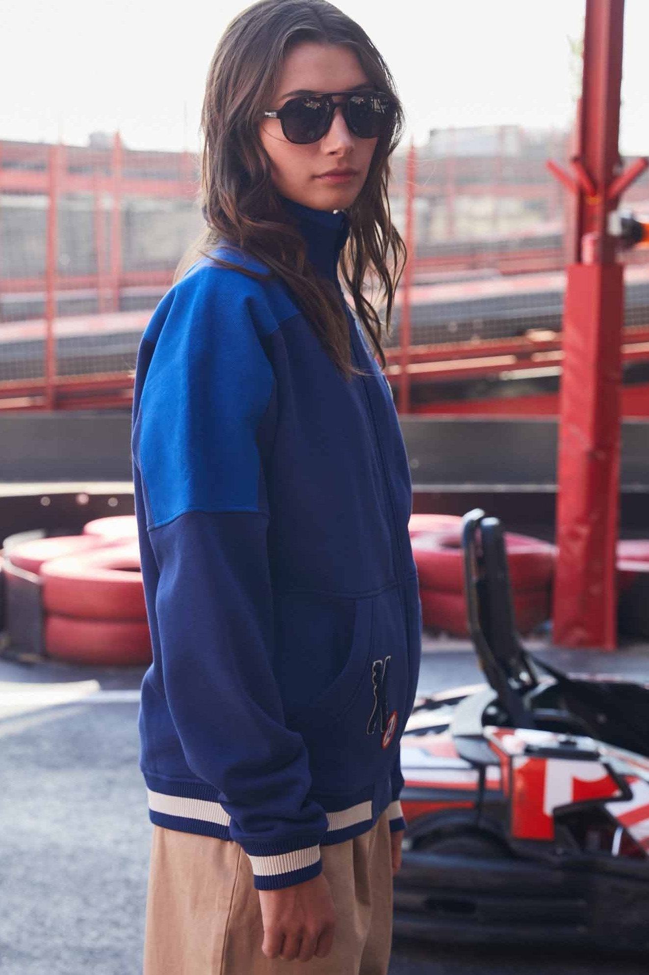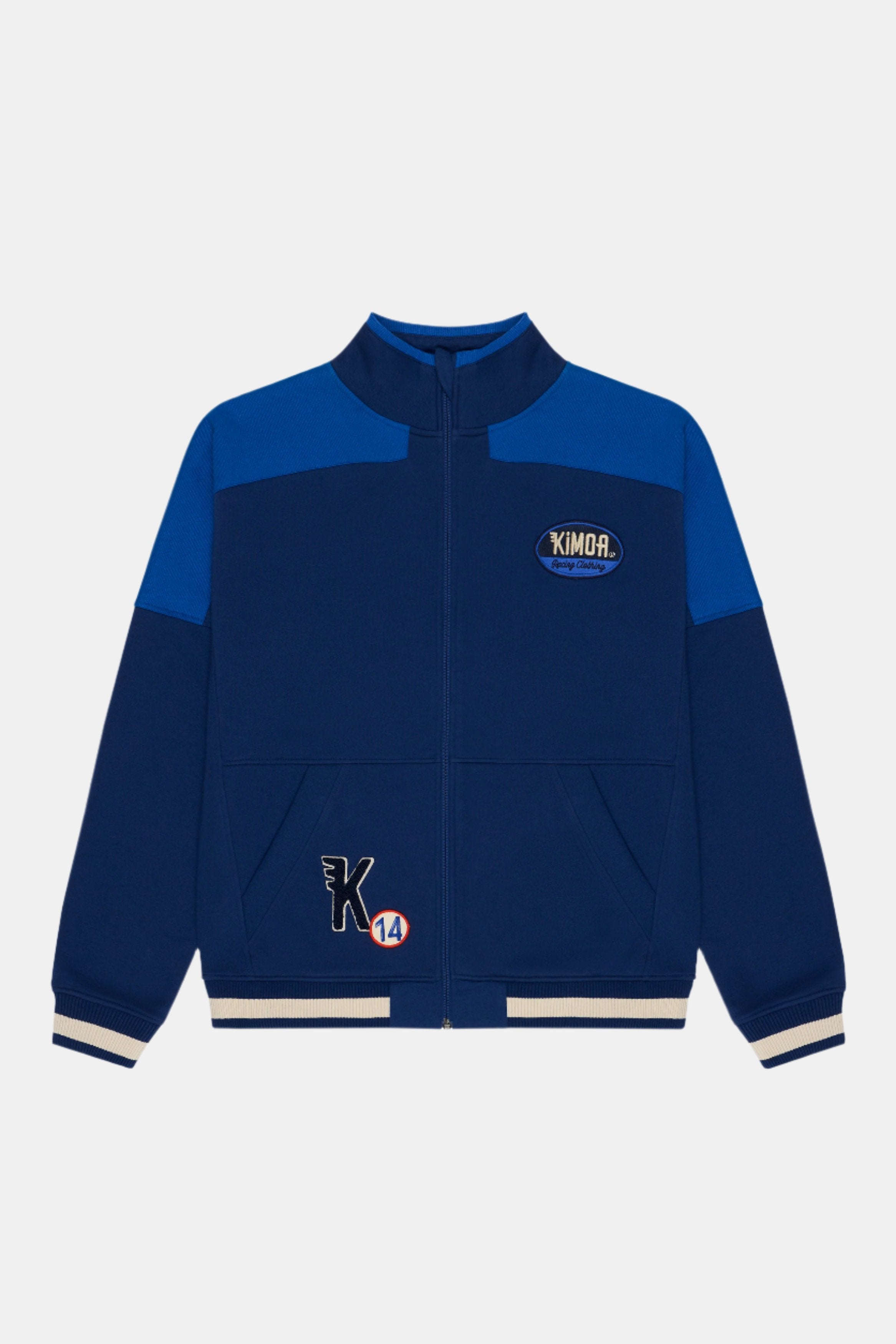 xCazadora con cremallera Bicolor Patch Washed Racing sin costuras en los hombros y color azul oscuro lavado con paneles en los hombros a contraste en un tono más claro. Parche ovalado bordado de Kimoa Racing en el pecho.