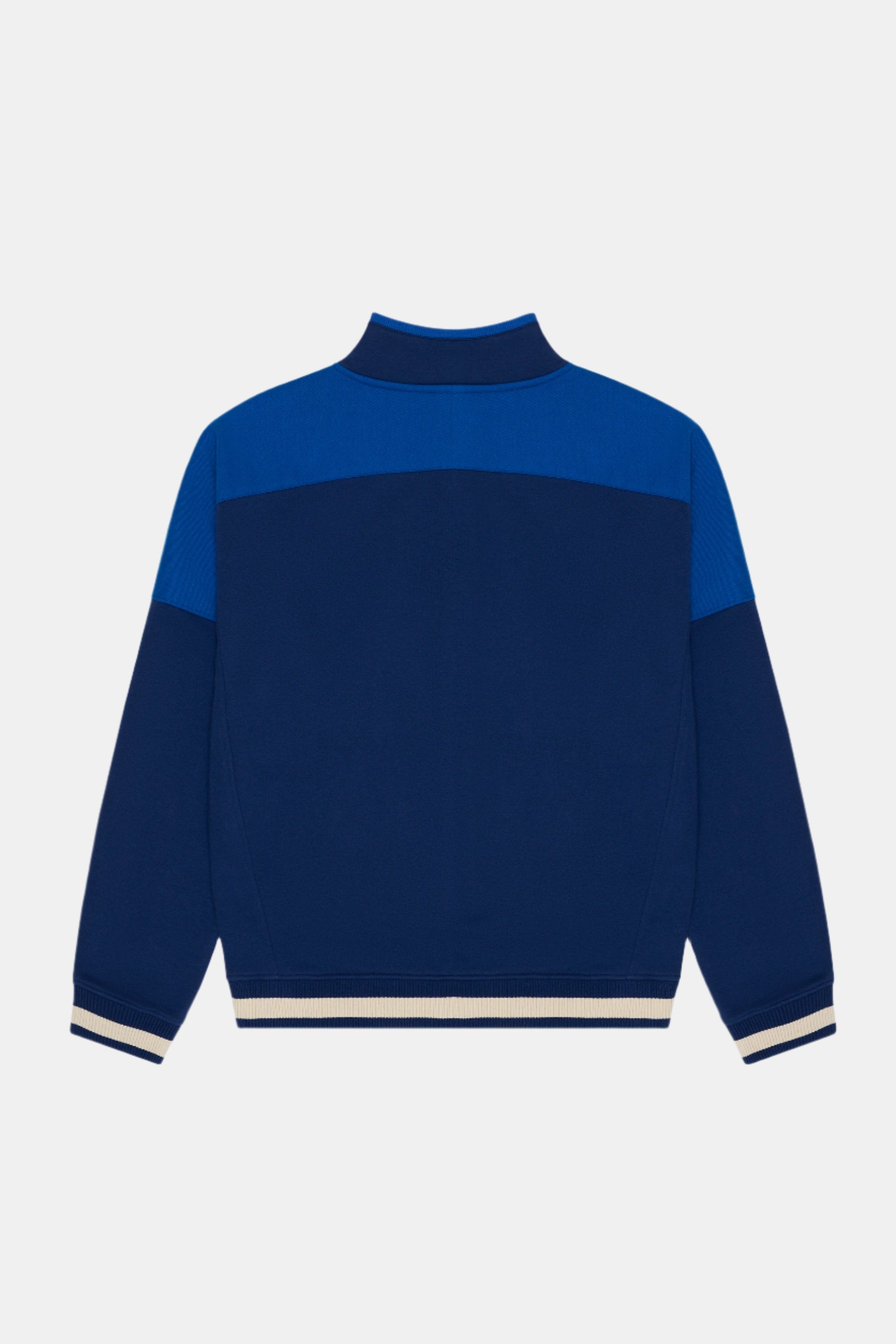 - Bolsillo canguro dividido por la cremallera, que acaba en el cuello con protección de tejido a tono y cuello rematado en punto a contraste en azul más claro.