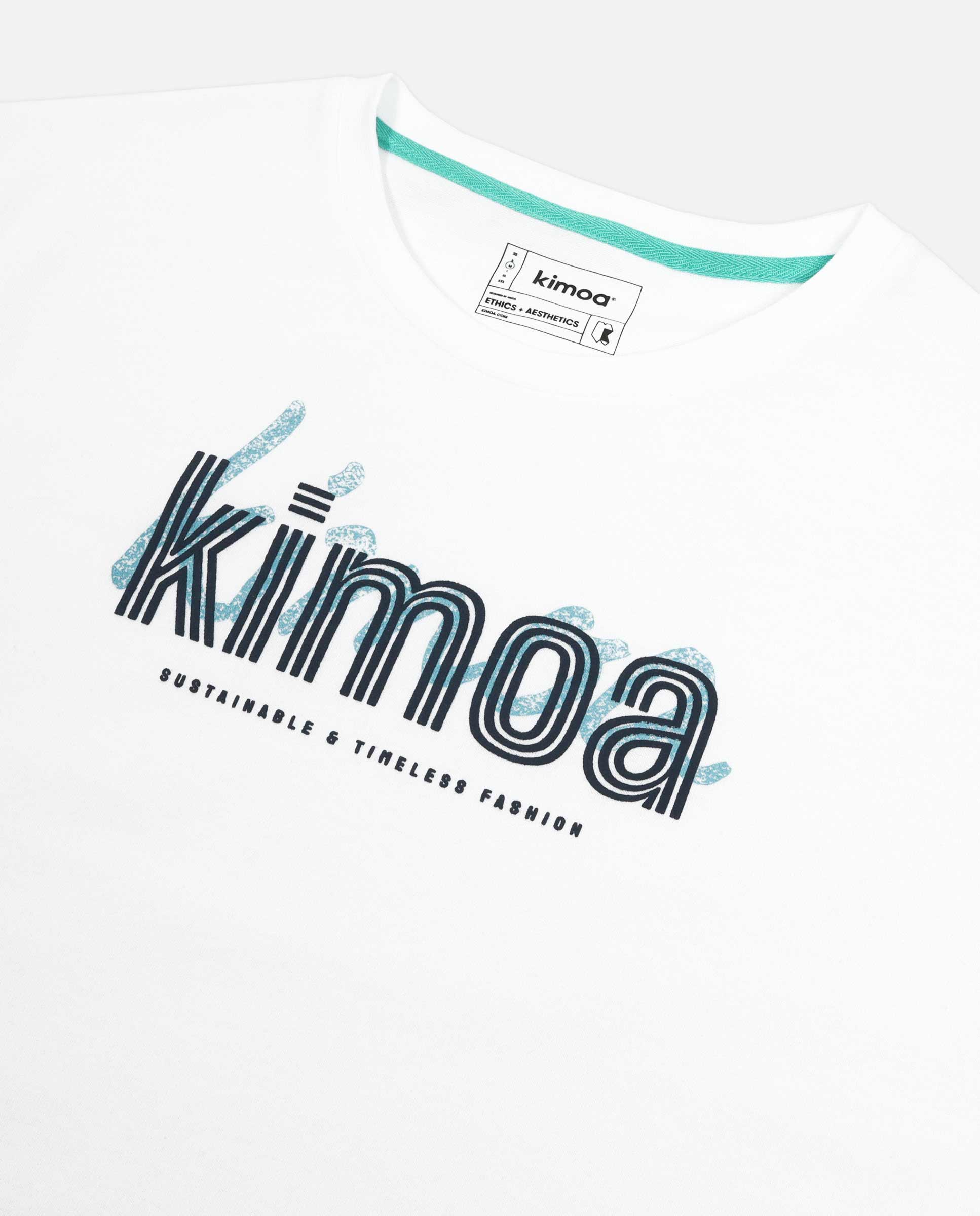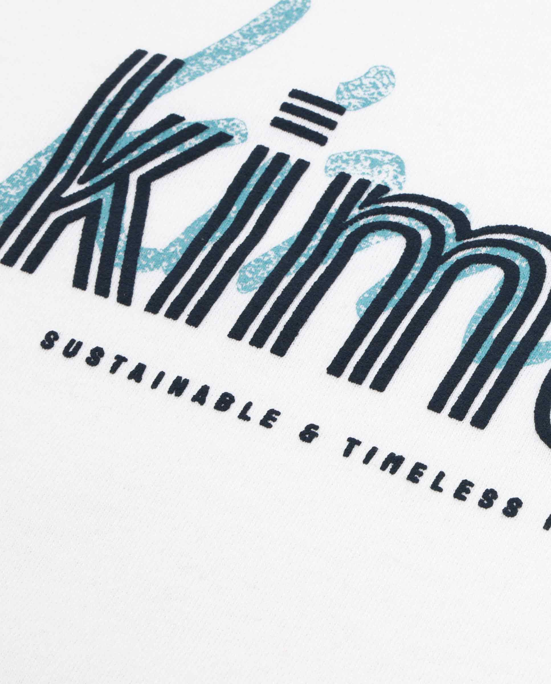 xCamiseta Conscious Logo con gráfico en el pecho en estampado puff y base agua con el logo de Kimoa y la frase "Sustainable & Timeless fashion" en color azul y celeste. La etiqueta de goma en la cintura está compuesta por el logo de Kimoa y la frase "Moda sostenible y atemporal".