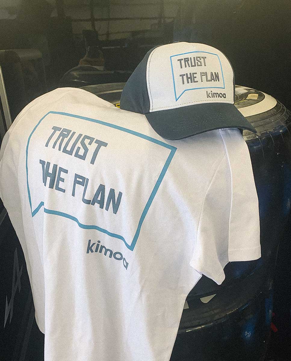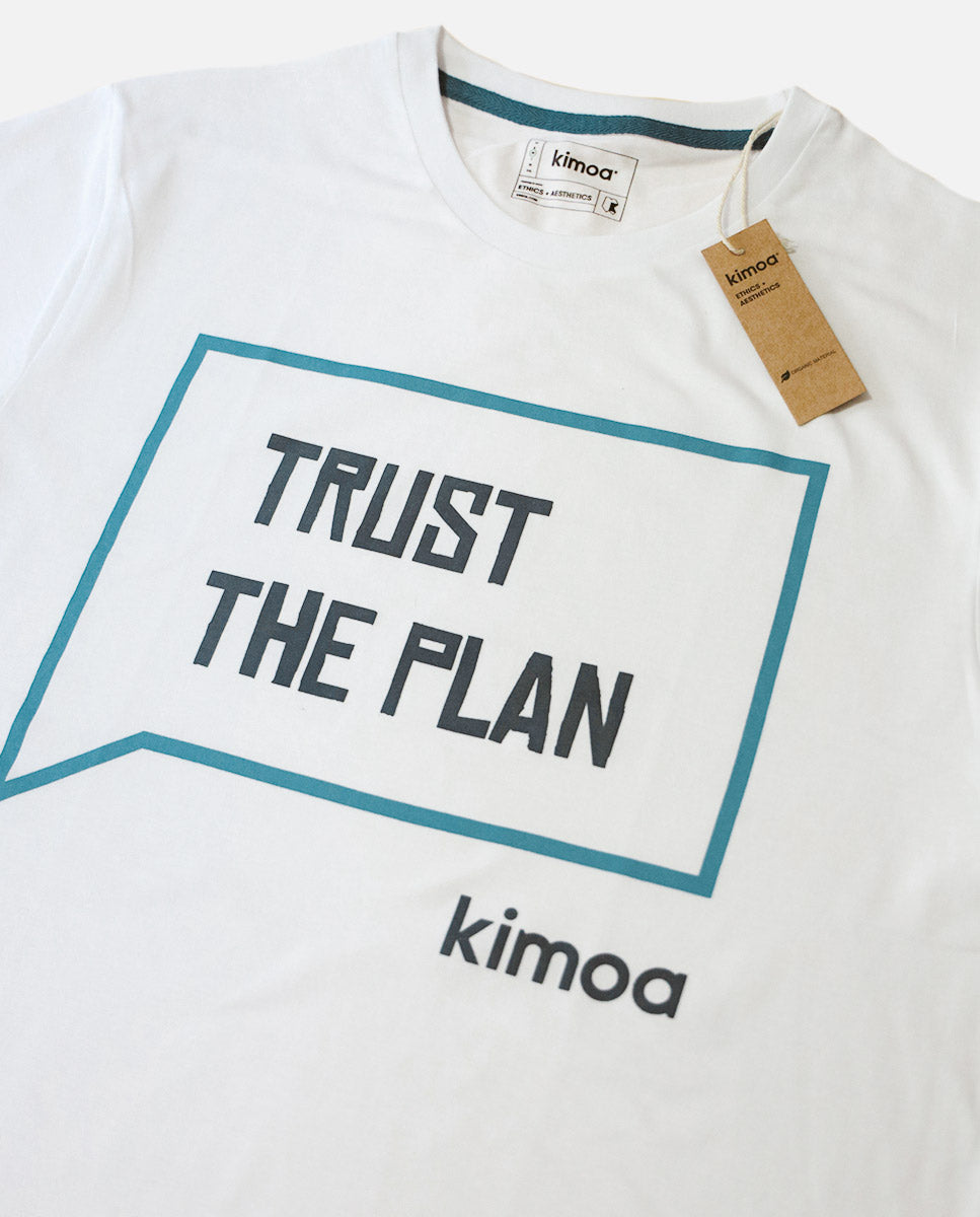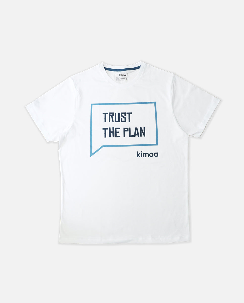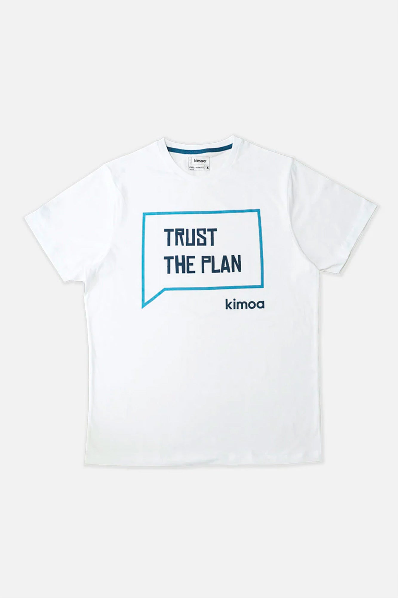 xCamiseta Trust The Plan edición limitada blanca de algodón orgánico con estampado azul claro en el pecho con la frase TRUST THE PLAN en estampado abullonado gris oscuro y logo de Kimoa en el lado izquierdo. Parche con el logo "K" de goma en la manga derecha. El plan ya está en marcha, súmate.