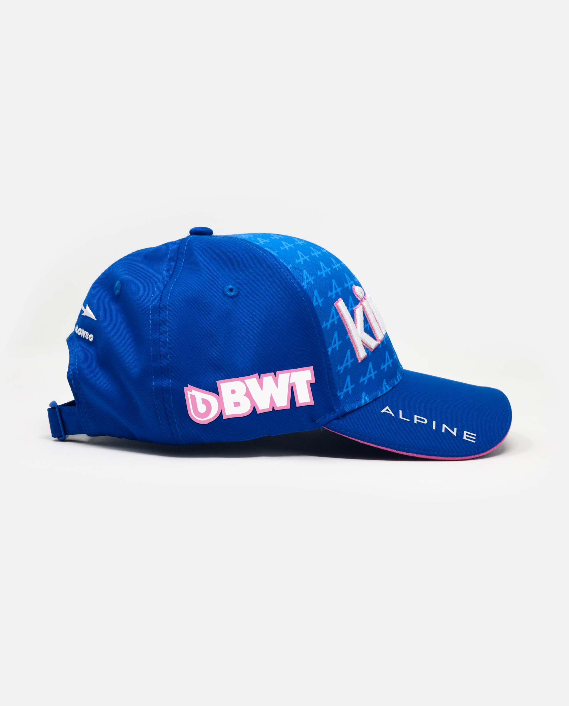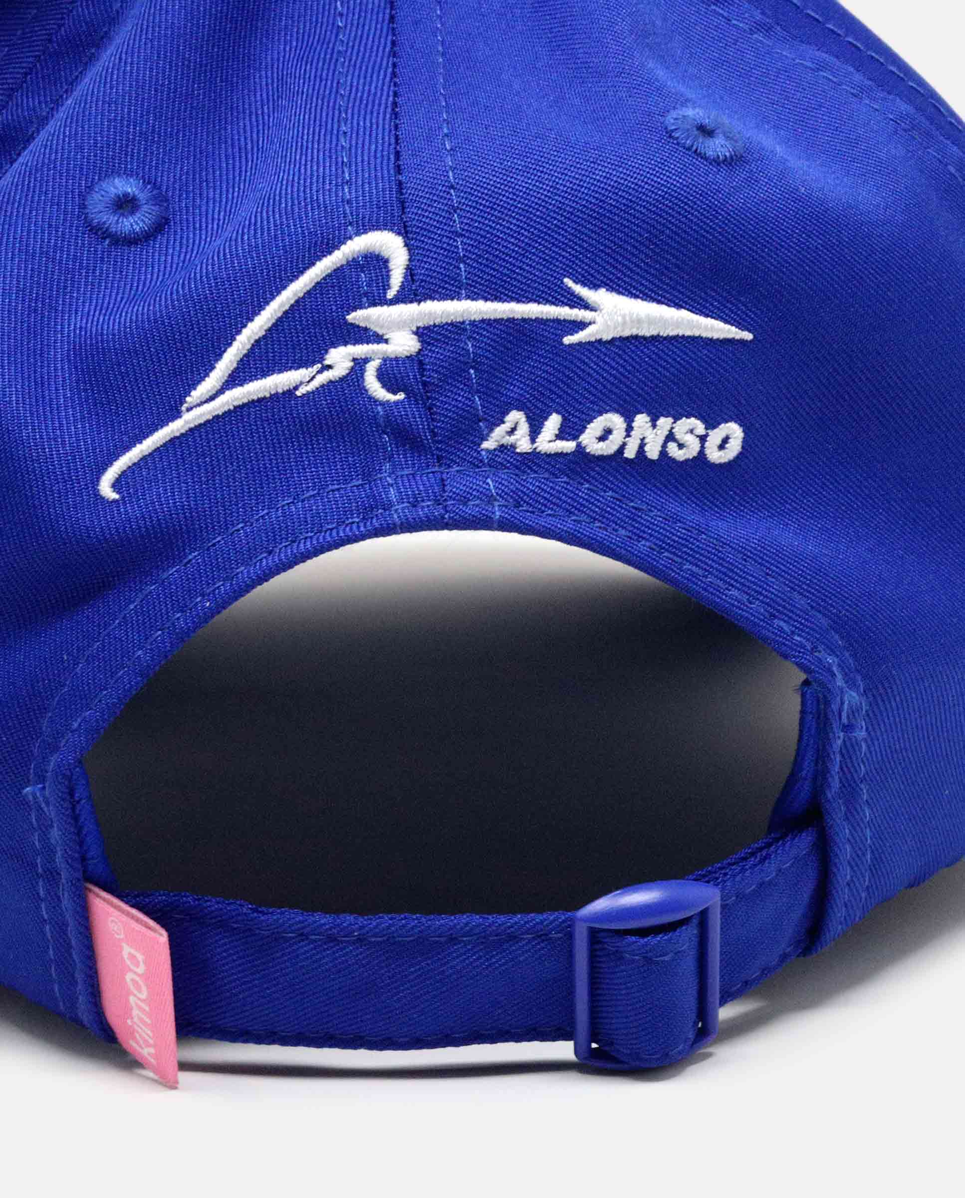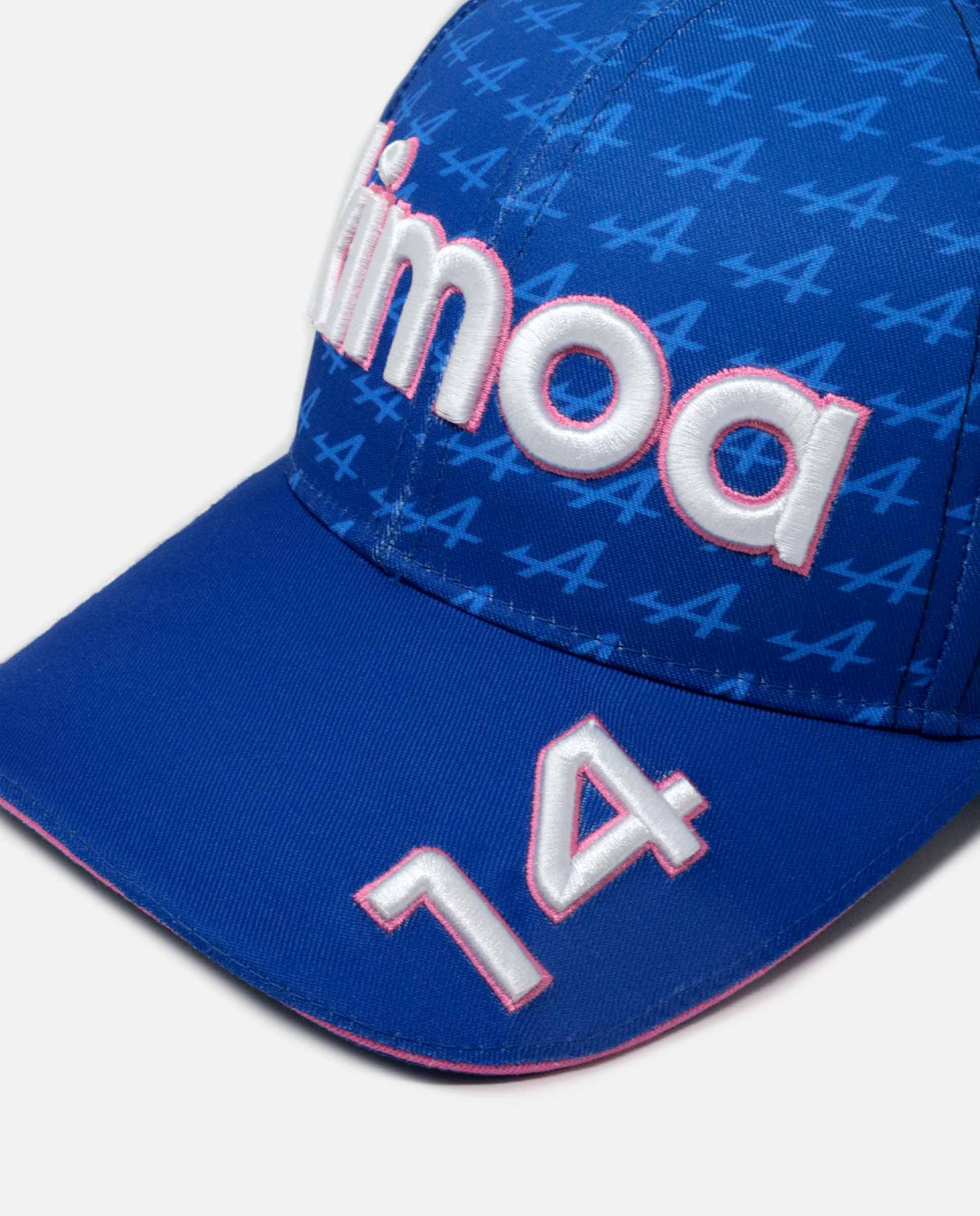 xGorra trucker reciclada en color azul marino Edición Especial Fernando Alonso Alpine 2022. Frontal con logo Kimoa bordado en 3D en color blanco con contorno de costura en rosa. Estampado integral con logo Alpine en los paneles frontales, degradado de azul claro a azul oscuro. Logo oficial Alpine bordado en blanco en la visera y número 14 bordado en 3D con contorno rosa. Alpine F1 Team en el panel izquierdo con detalle de costuras bordadas en azul, blanco y rojo como los colores de la bandera francesa. Visera con perfil rosa. Firma de Fernando Alonso bordada en blanco en la espalda. Cierre de tela con velcro ajustable y etiqueta Kimoa rosa. PET reciclado.