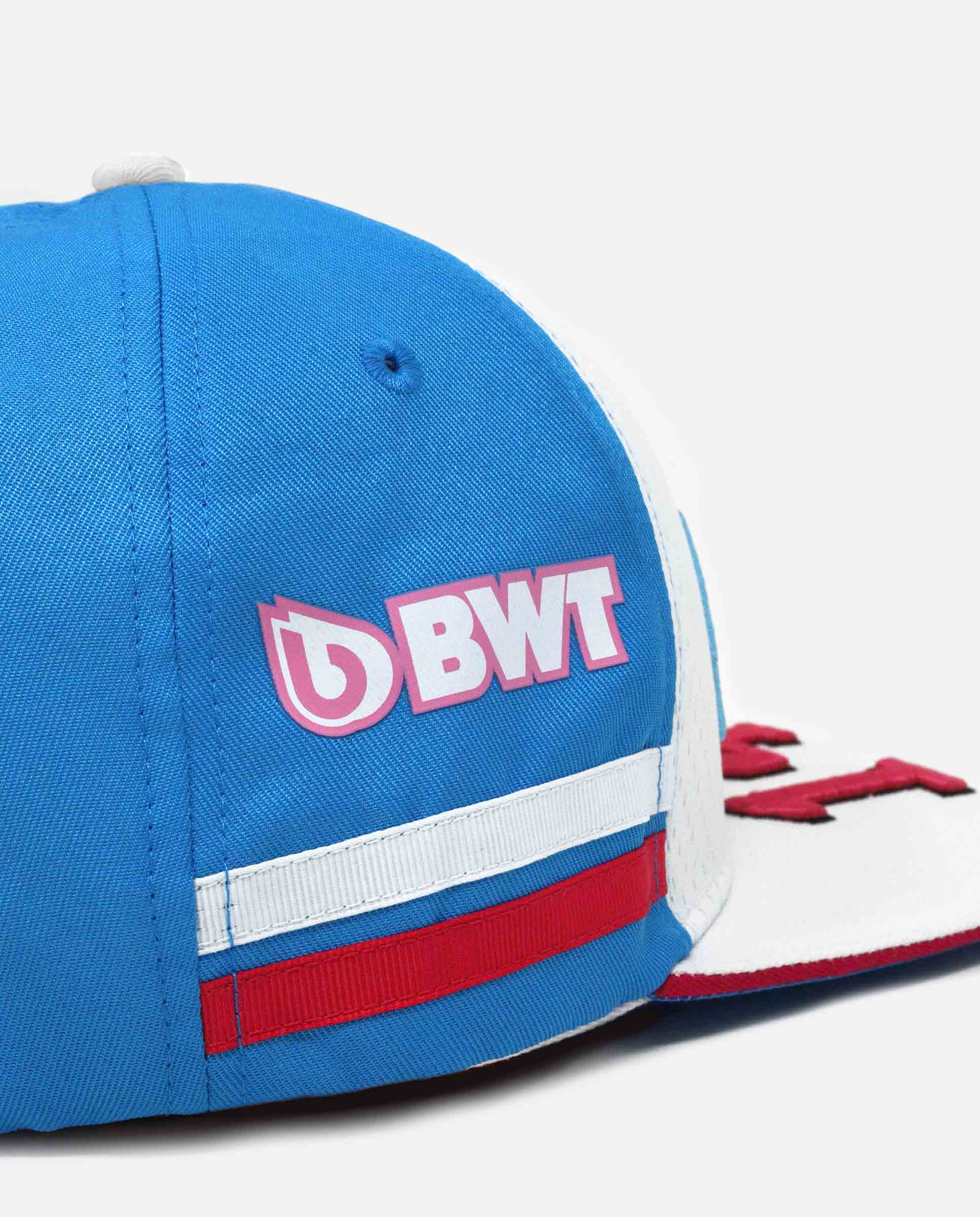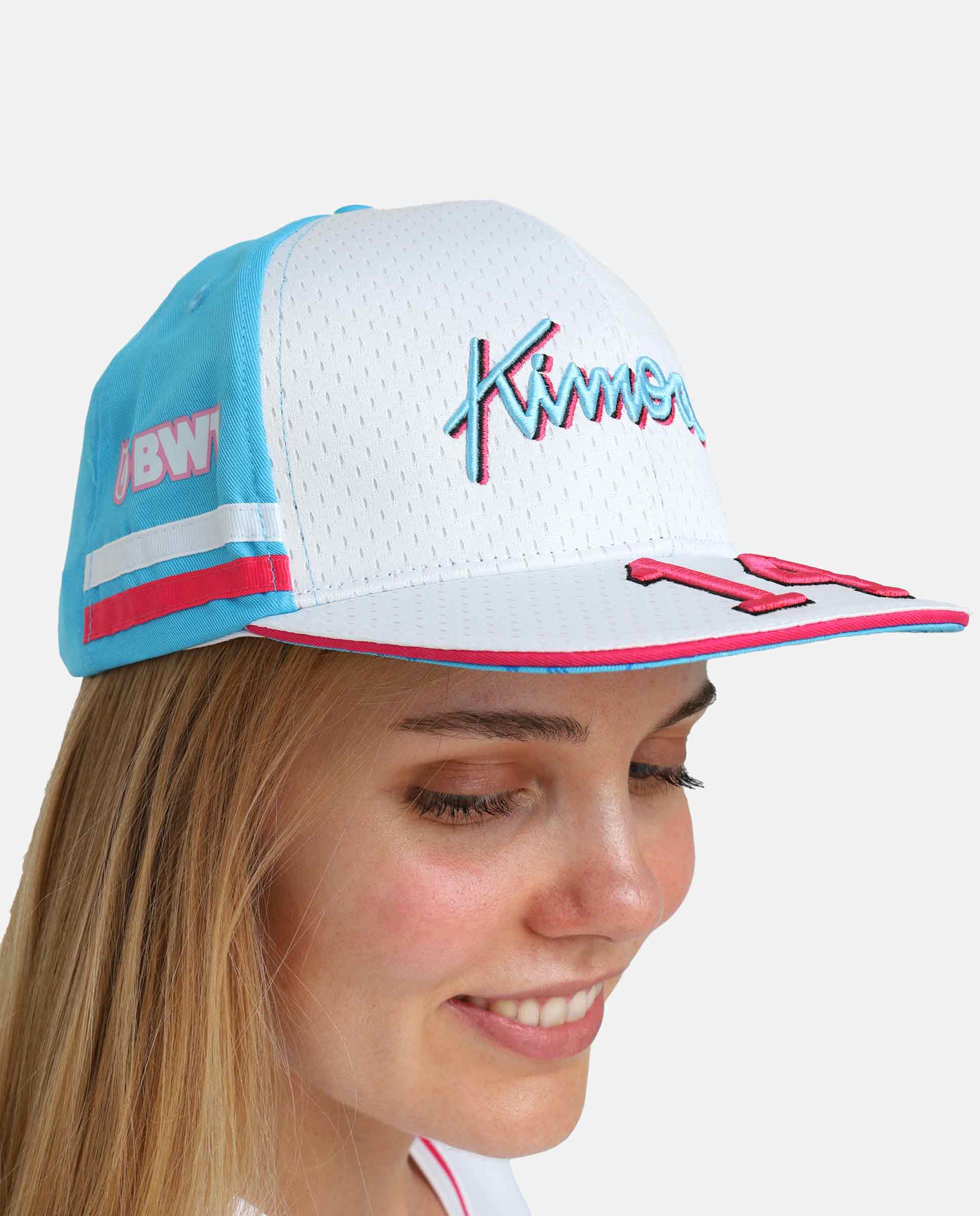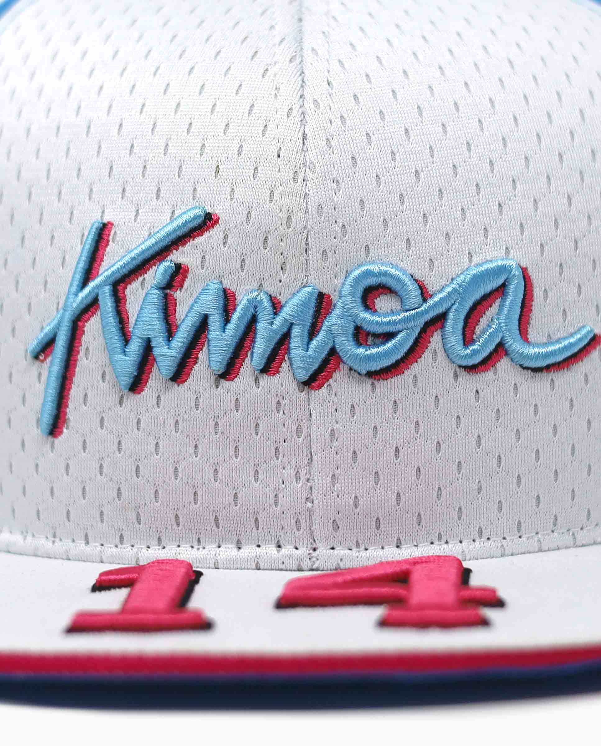 xRecycled white and light blue two-tone snapback cap Alpine Special Edition for the 2022 Miami GP. Front with 3D embroidered Kimoa logo in white with flat embroidered seams in black and fuchsia. Number 14 3d embroidered in fuchsia on the bill, with black outline. Alpine F1 Team in white on the left panel with embroidered stitching detail in blue, white and red as the colors of the French flag. White front panels and visor with fuchsia outline and print with Alpine all over on a light blue background at the bottom of the bill. Signature of Fernando Alonso embroidered in fuchsia on the back. Fabric closure with adjustable velcro and fuchsia Kimoa label. Recycled PET.