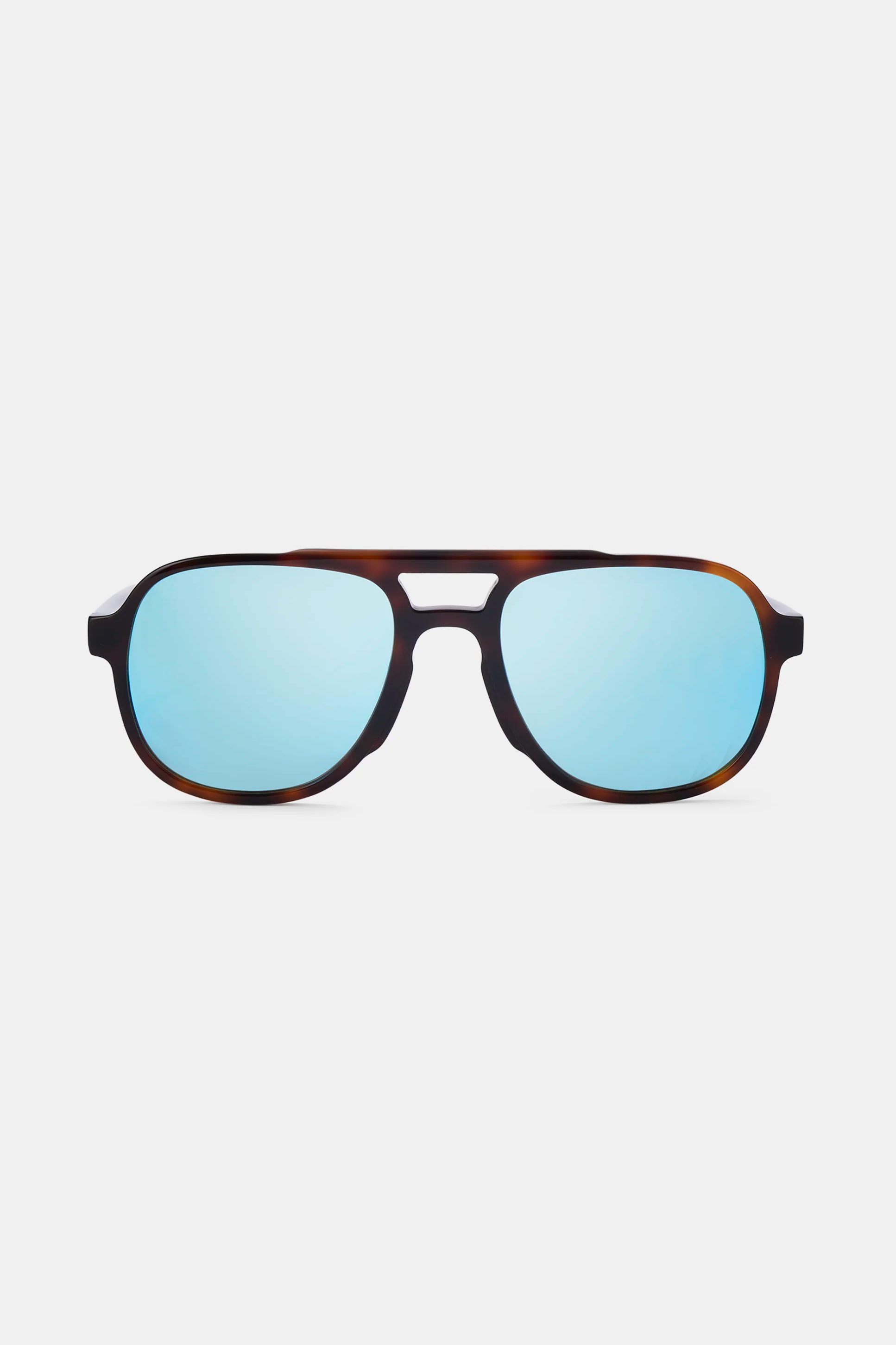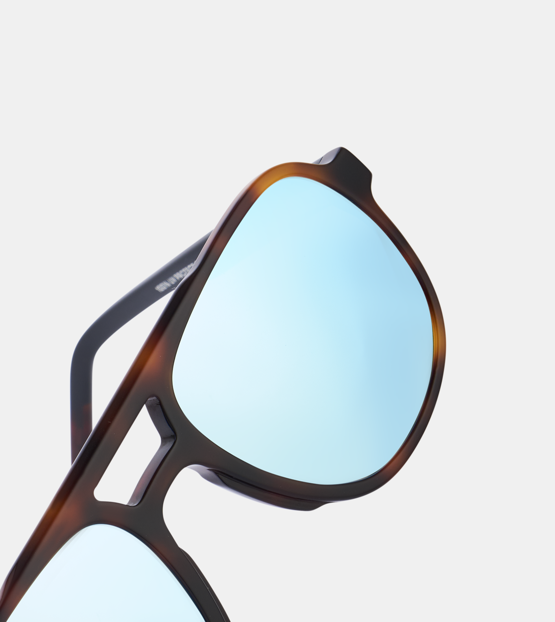 xOssington Carey, gafas de sol redondas y polarizadas, adecuadas para el uso diario y deportes al aire libre, elaboradas en bio acetato de primera calidad, obtenido a partir de pulpa de madera y fibras de algodón, lo que las hace duraderas y respetuosas con el medio ambiente. Esta versión inspirada en los años 80 del icónico estilo aviador presenta lentes en forma de gota, doble puente en la montura frontal en acabado tipo carey y estrechas varillas color negro sólido semi brillo con terminales a contraste tipo carey. Las lentes de espejo REVO en color azul claro respetan el medio ambiente y ofrecen un equilibrio único entre claridad y resistencia.
