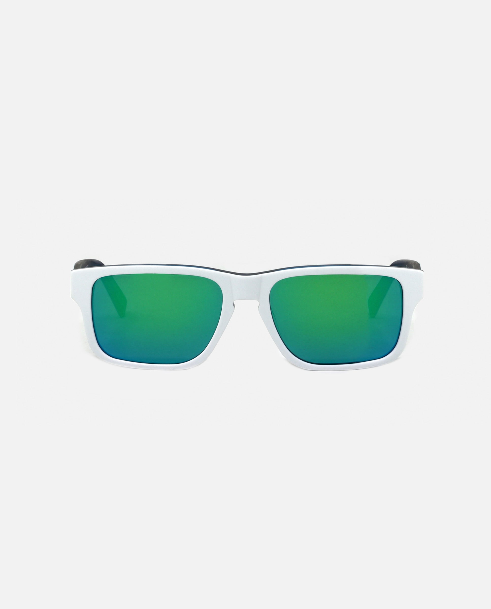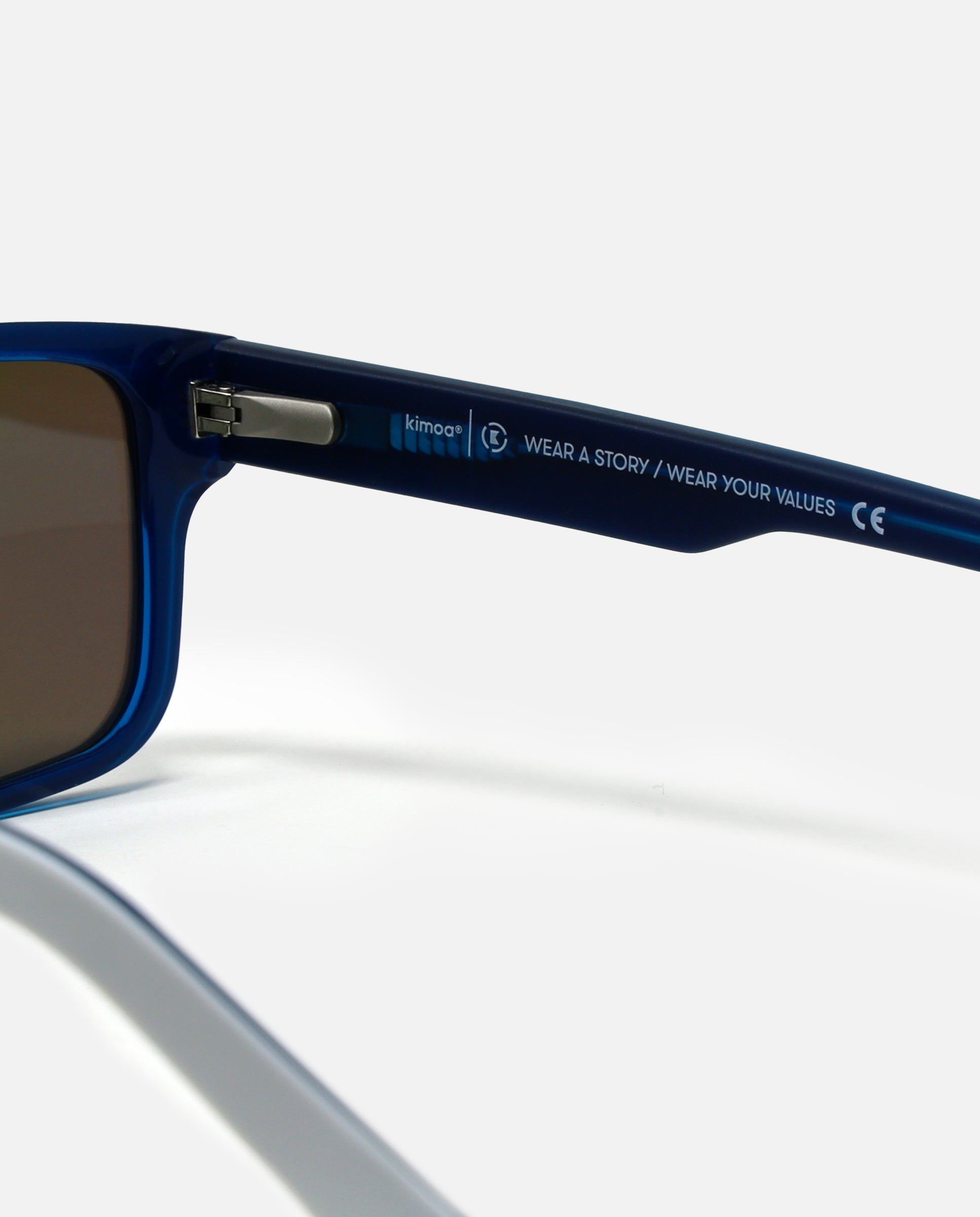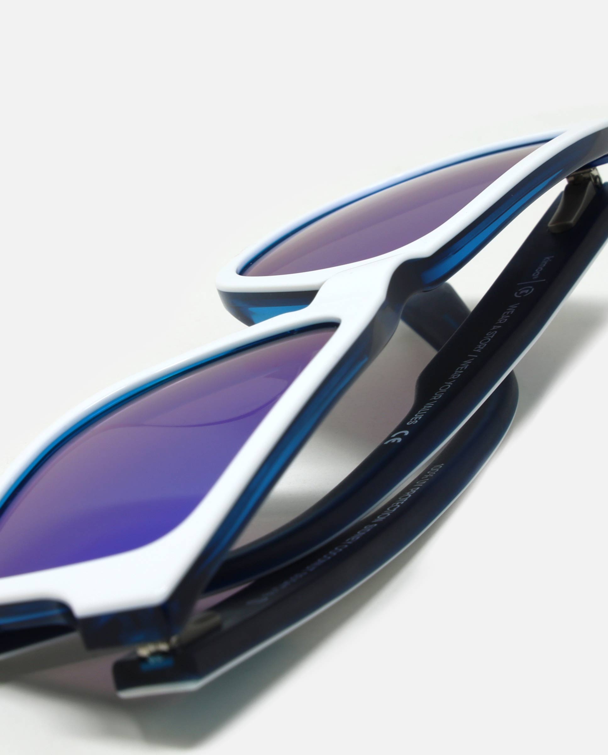 xGafas de sol Icónicas Sidney Coconut con montura de Bio-acetato cuadradas bicolor blanca brillante y celeste mate con logo kimoa en ligero bajo relieve en las patillas de color celeste. Frase en una de las patillas "WEAR A STORY / WEAR YOUR VALUES". Lentes polarizadas espejo de tonalidad azul. El bio-acetato es un material ecológico, entre sus características, ya que para su fabricación se añaden unicamente aditivos orgánicos al algodón, que lo transforman en un nuevo material eco-sostenible y biodegradable.