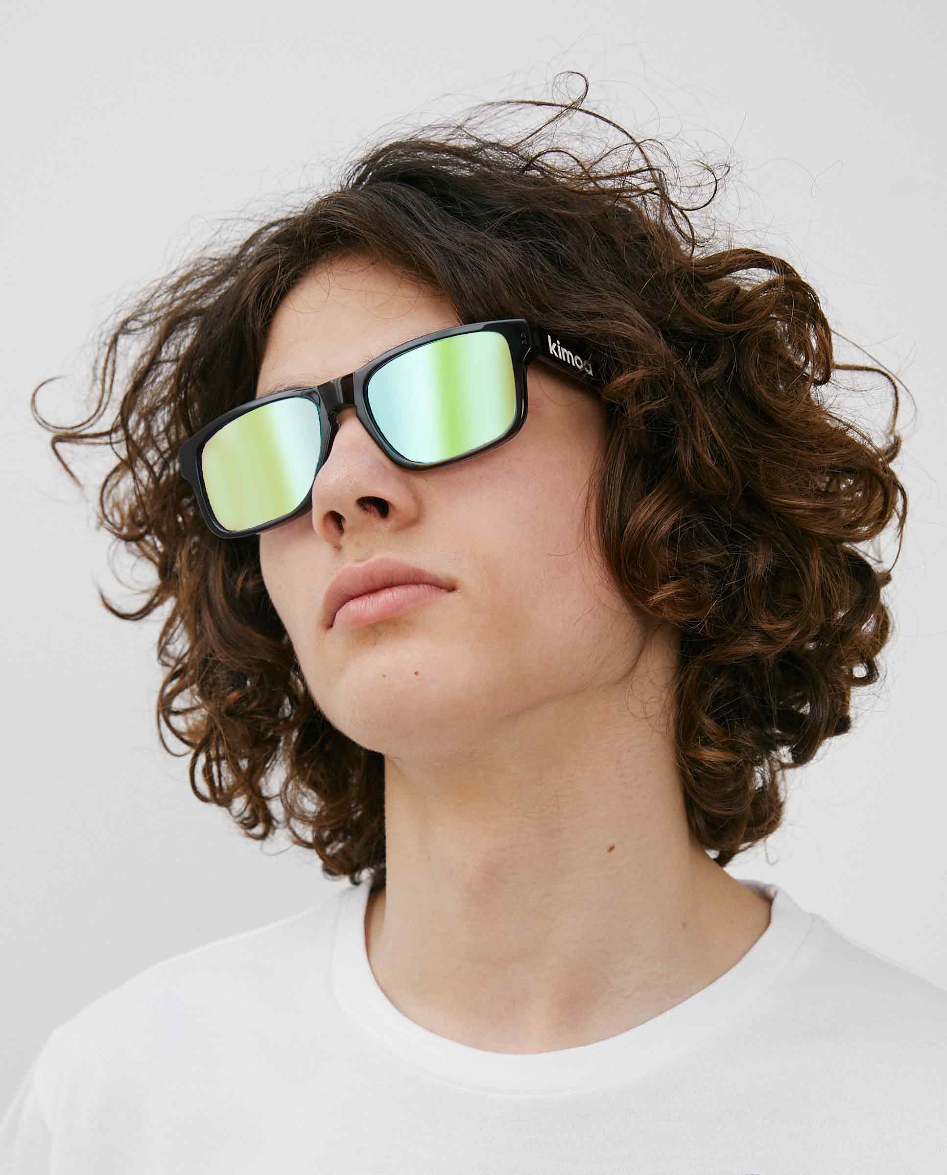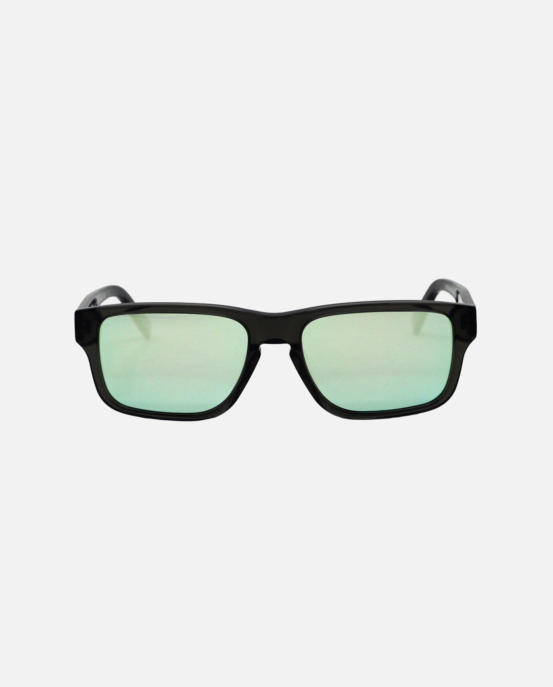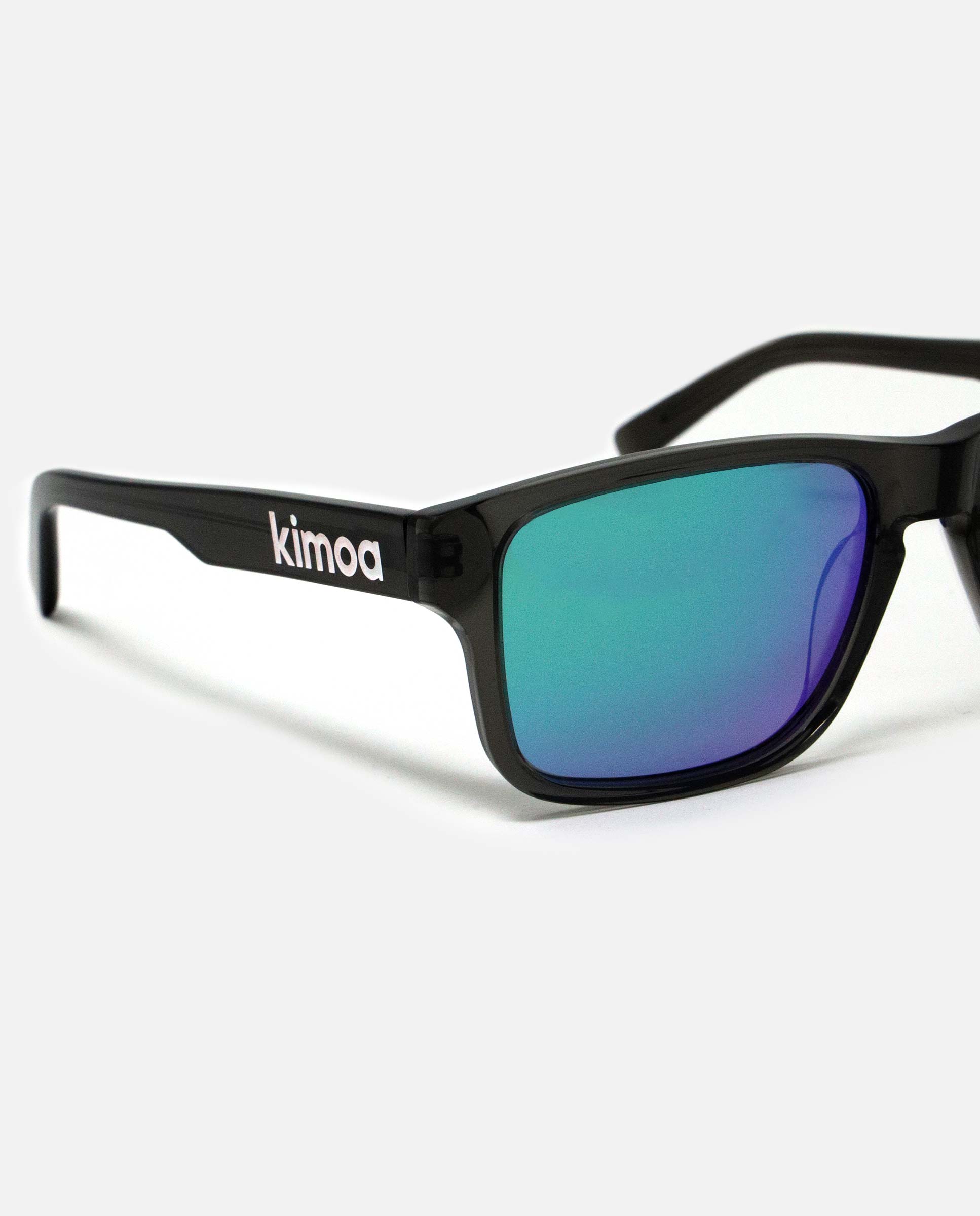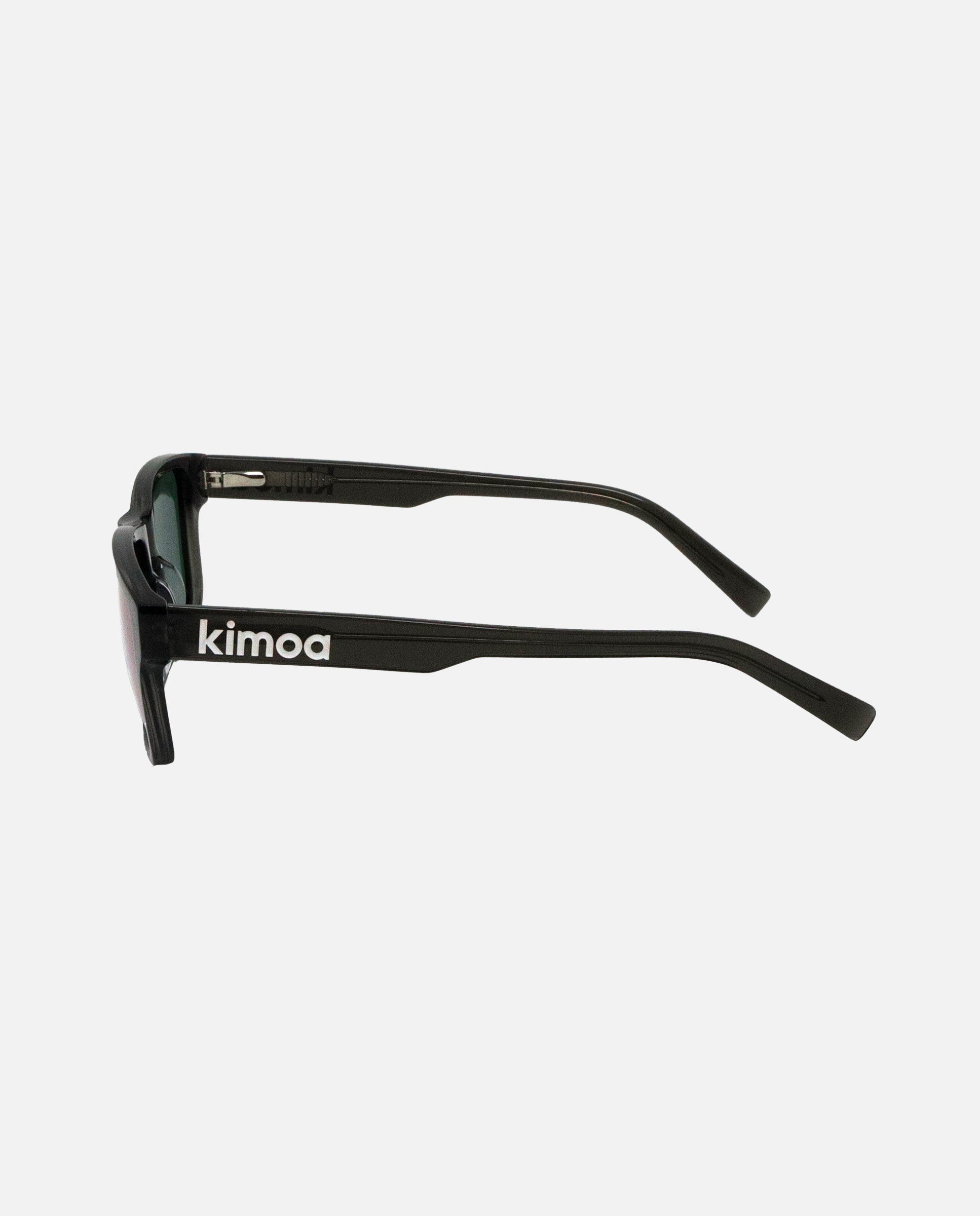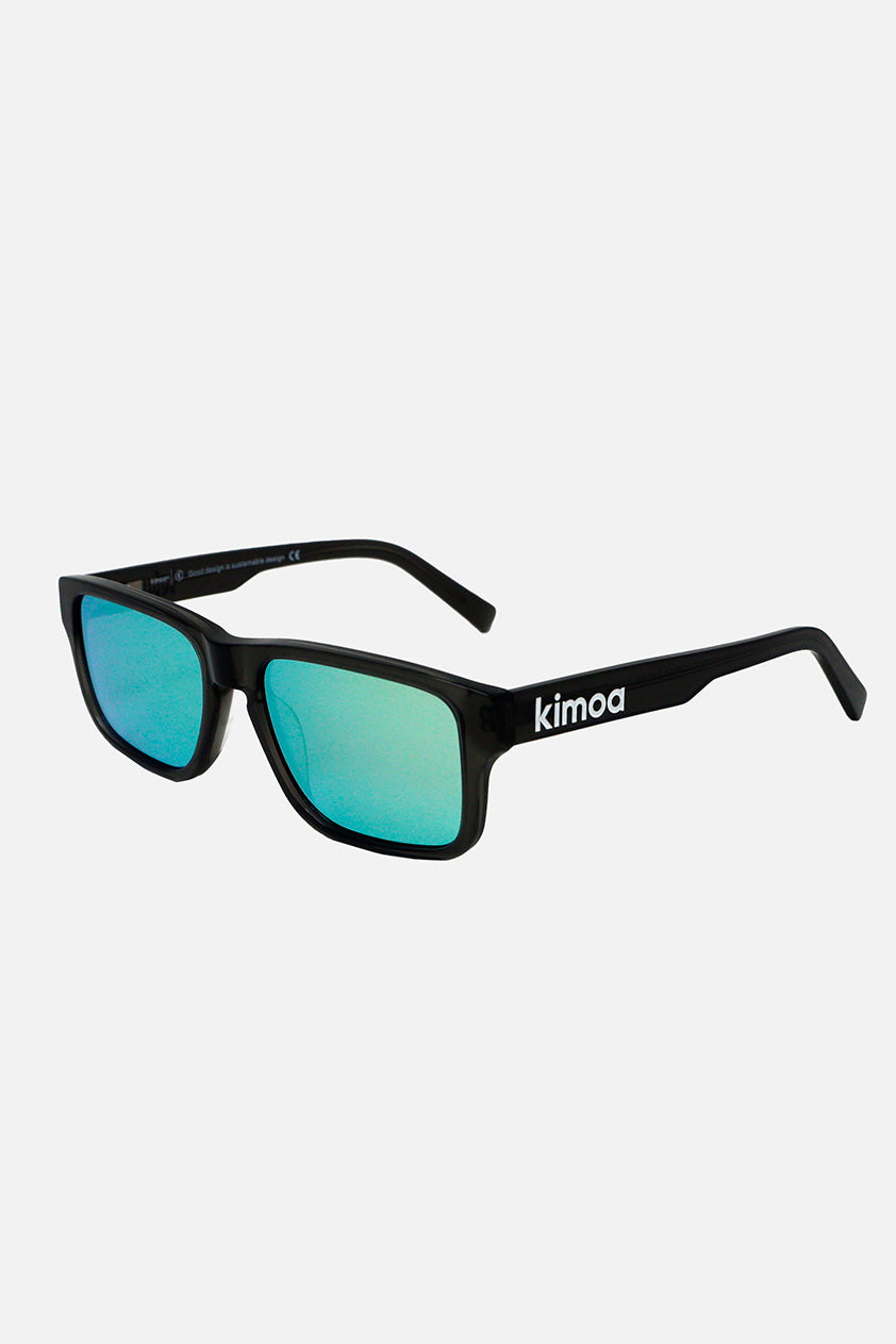xGafas de sol Icónicas Sidney Green Emerald con montura de Bio-acetato cuadradas de color negro transparente brillante y logo kimoa en ligero bajo relieve en las patillas de color blanco. Frase en una de las patillas "Good design is sustainable design". Lentes polarizadas espejo de tonalidad verde. El bio-acetato es un material ecológico, entre sus características, ya que para su fabricación se añaden unicamente aditivos orgánicos al algodón, que lo transforman en un nuevo material eco-sostenible y biodegradable.