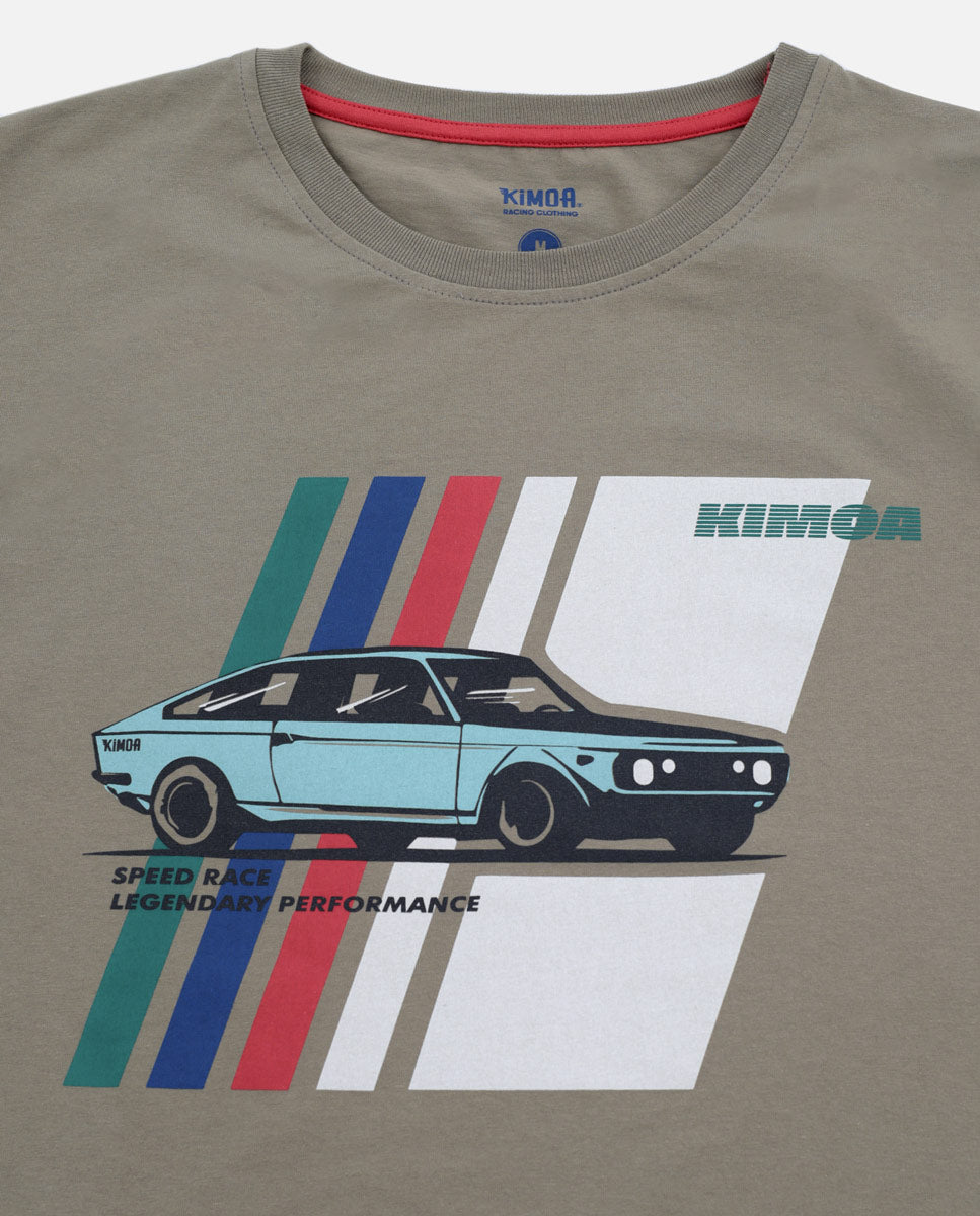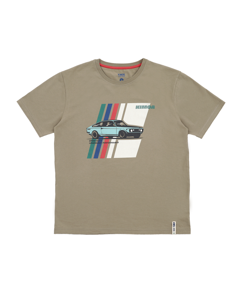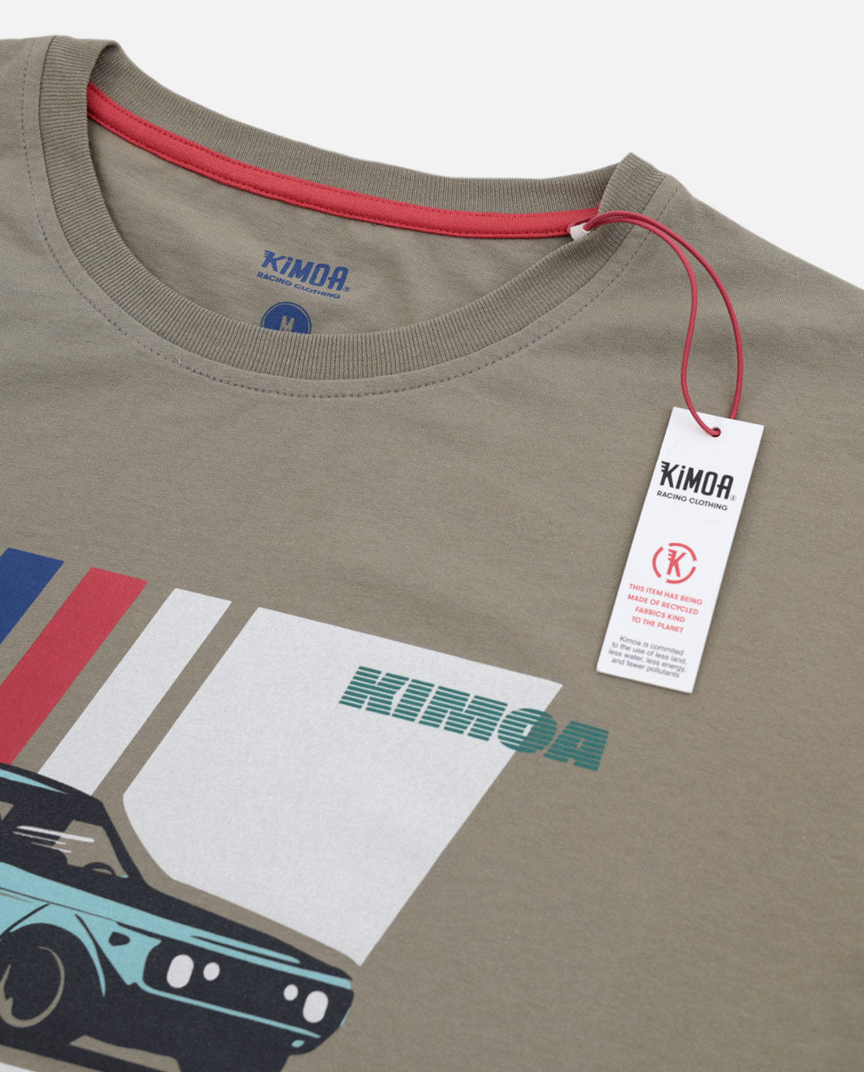 xCamiseta Toasted Speed Car Racing con un gráfico de un auto antiguo y rayas verdes, azules, coral y gris hielo en el pecho. Cinta cubrecosturas del cuello color coral a tono con el logo. Etiqueta de fieltro con logo de goma en la cintura “Producto reciclado Kimoa”.