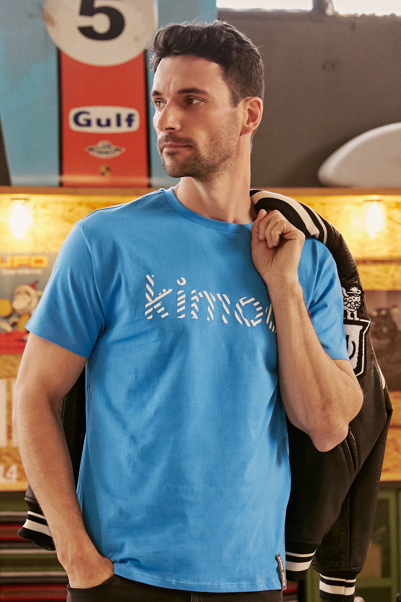 Camisa Kimoa Eco azul claro del icónico estilo Kimoa con logo blanco estampado abullonado.